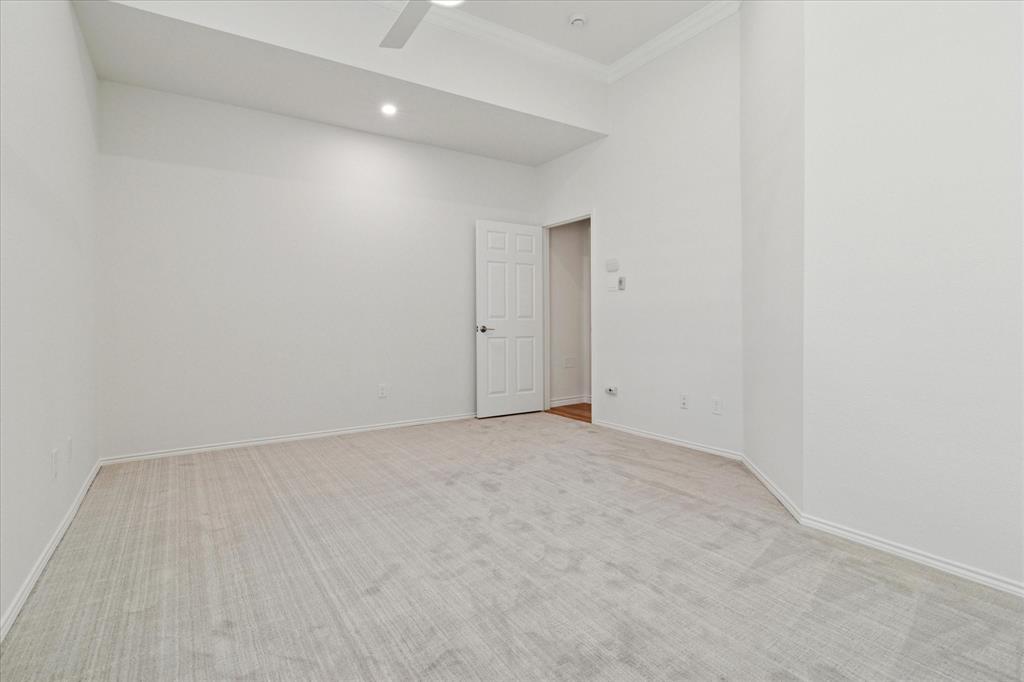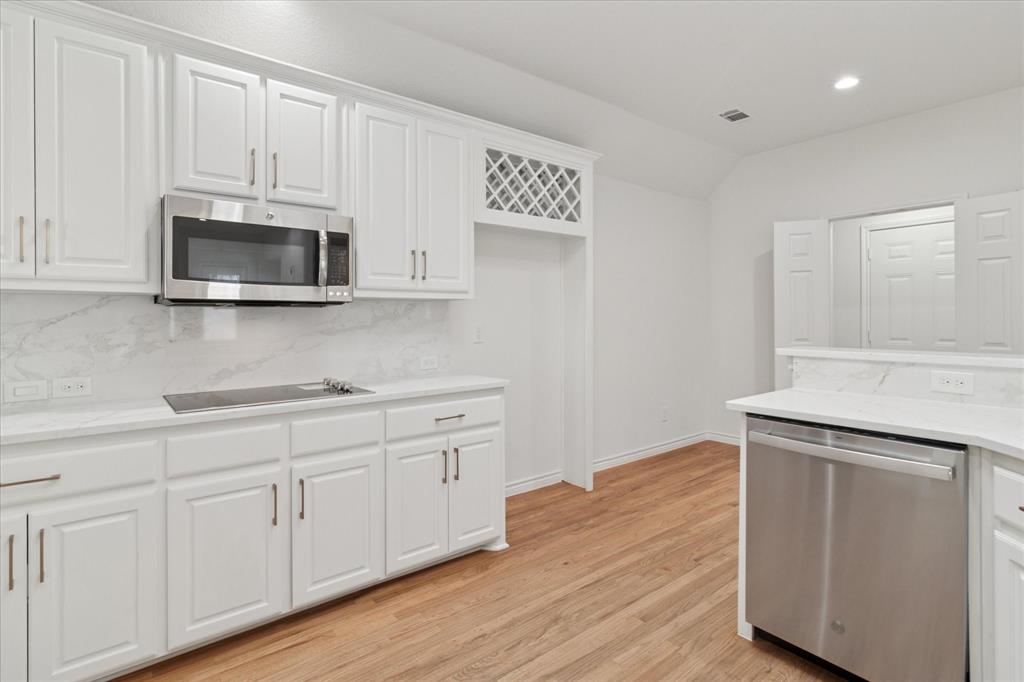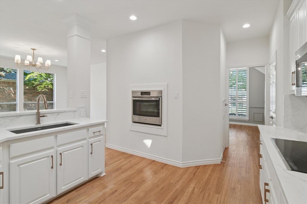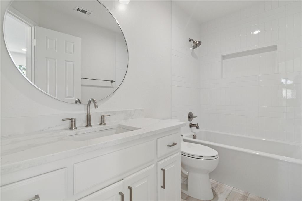 Modern light fixtures enhance the abundant natural light that fills the home. The kitchen features brand new quartz countertops, complemented by brushed gold hardware and a new cooktop. The bedrooms are adorned with brand new carpeting for added comfort. The primary bathroom features an oversized walk-in shower and an expansive double vanity with granite countertops.
