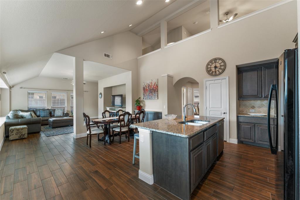 Step inside through the striking 8-foot mahogany front door and be welcomed by an impressive entryway with soaring 18-foot vaulted ceilings. The gourmet kitchen features an oversized island, granite countertops, and an additional dining area—all flowing seamlessly into the spacious family room with custom window seating. Durable ceramic wood-look tile enhances most wet areas on the first floor, combining style and practicality.