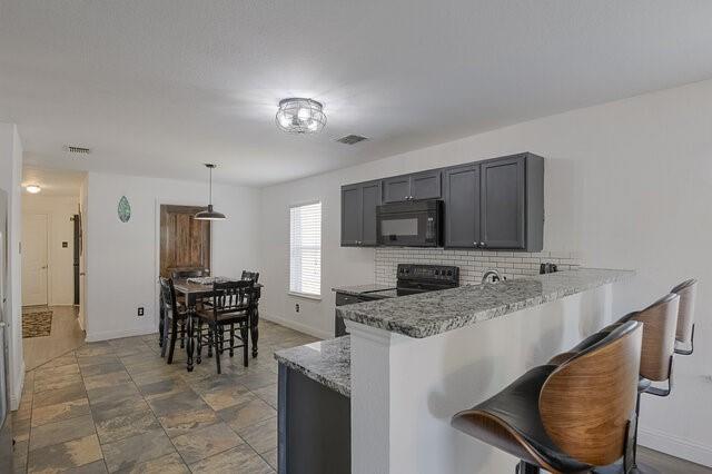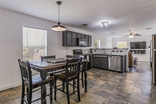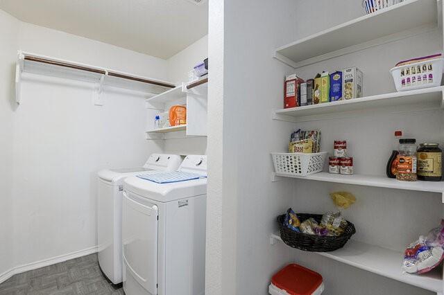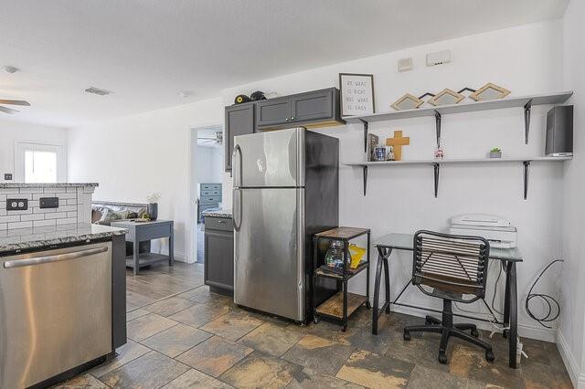 The kitchen is both functional and inviting, featuring granite countertops, a coordinating backsplash, and a built-in desk—perfect for a home hub or study space. A walk-in pantry and adjacent utility room provide ample storage and organization options. The primary suite offers a spacious retreat with a walk-in closet and private bath, while secondary bedrooms are thoughtfully separated for family or guests.