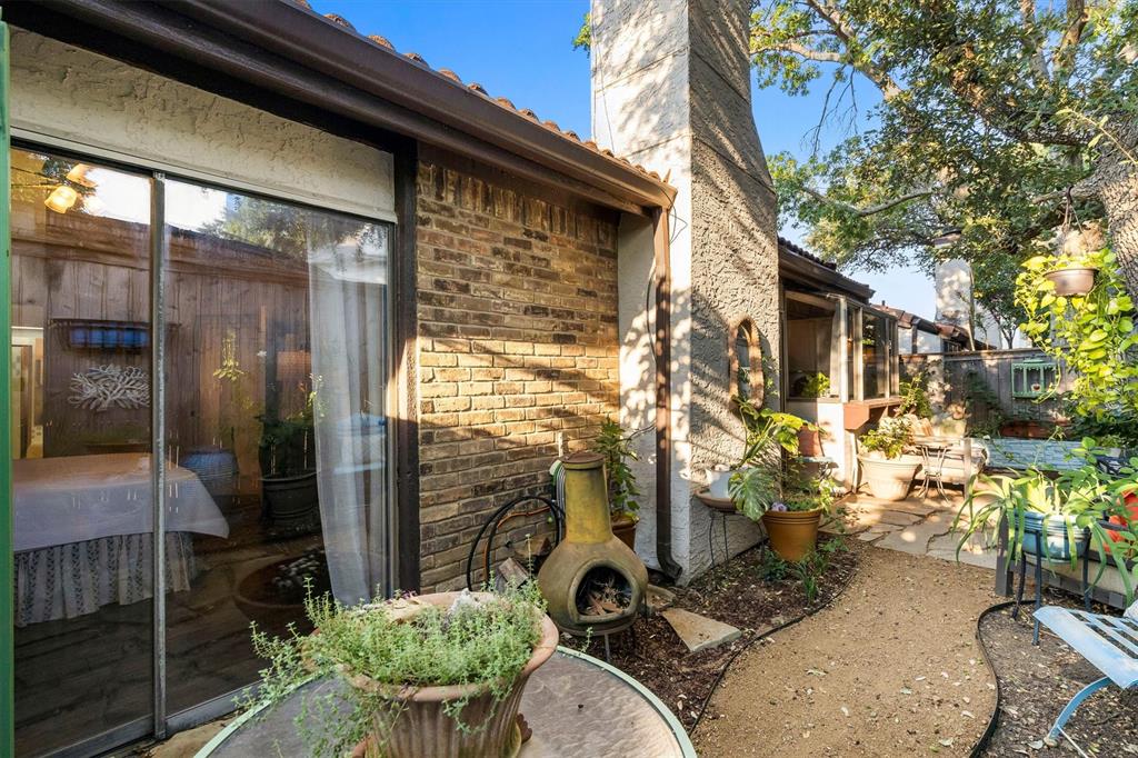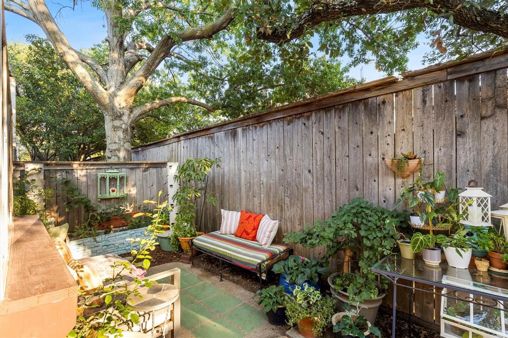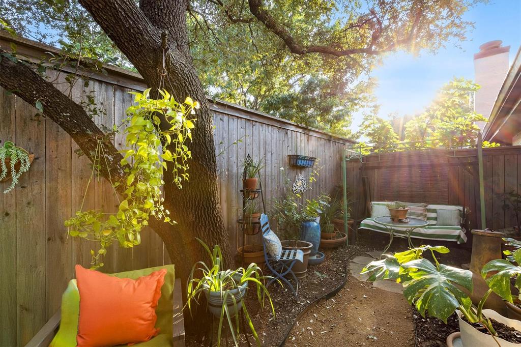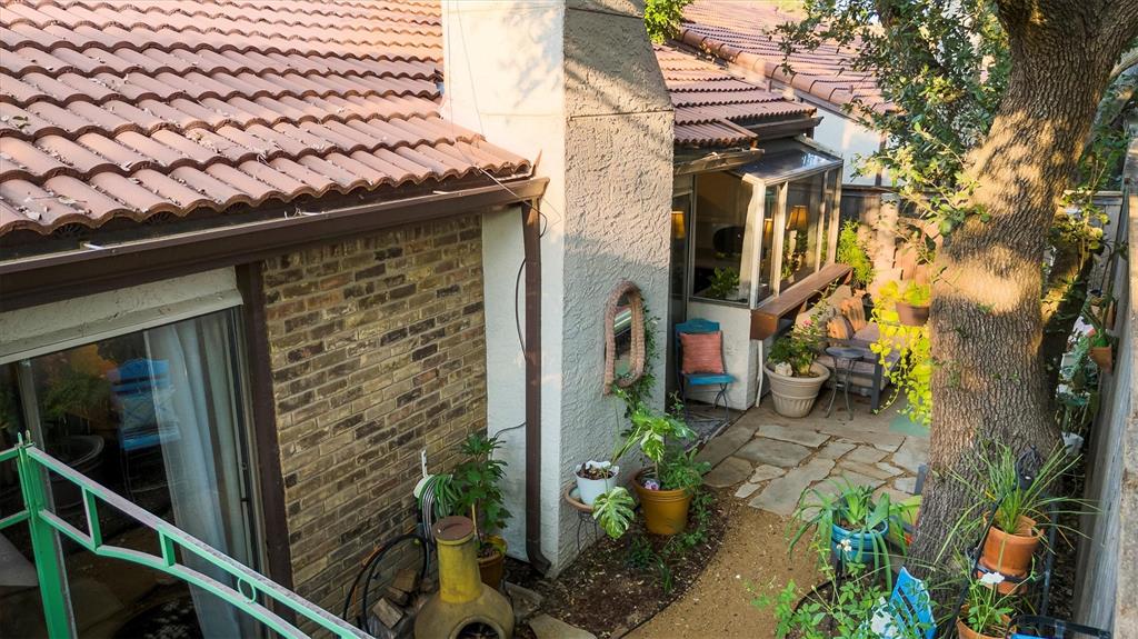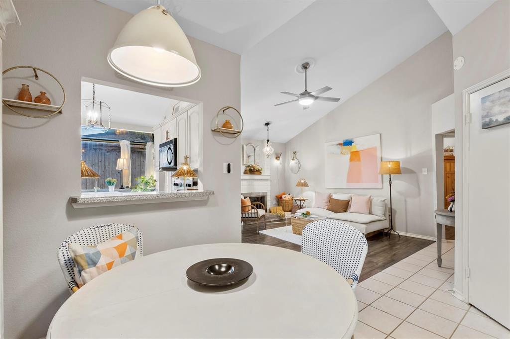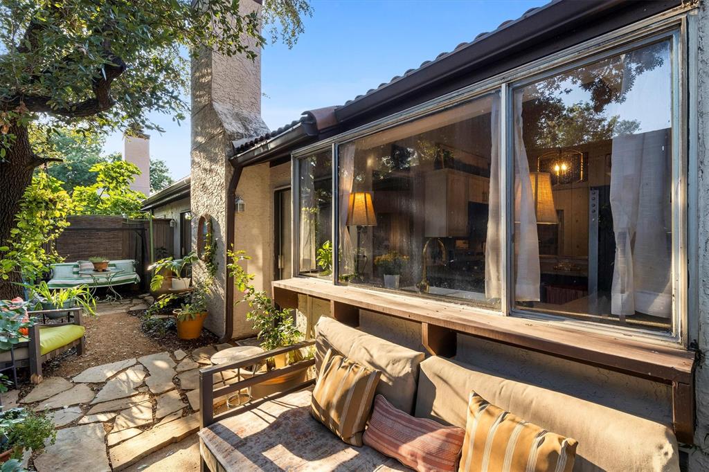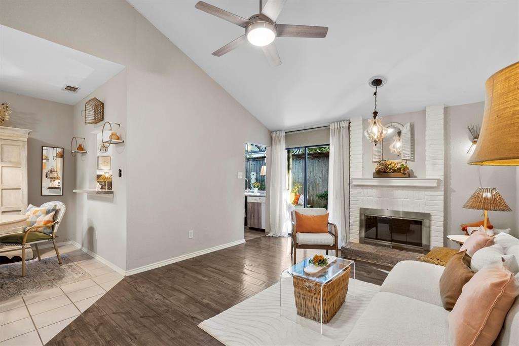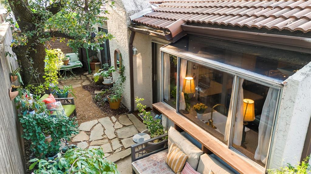 Sought-after single-story unit featuring a rare wraparound courtyard, perfect for outdoor living and entertaining. Nestled in a private setting yet conveniently close to the community pool and amenities. The open floor plan is filled with natural light, enhanced by vaulted ceilings in the living and dining areas. A welcoming entry leads through the courtyard to a replaced six-panel front door with storm door for added energy efficiency. Inside, enjoy a wood-burning fireplace, updated light fixtures, and a ceiling fan with remote. The kitchen offers a replaced glass cooktop range, gooseneck faucet, and updated cabinet hardware. The split-bedroom layout provides privacy, with the primary suite featuring a replaced ceiling fan, en suite bath with separate shower and tub, painted cabinets, new hardware, and updated vanity lights. Step outside to your private wraparound yard and patio — a rare find offering both space and seclusion. The Mediterranean-style community offers two pools, a hot tub, a cabana, and pool restrooms. HOA dues cover exterior maintenance & insurance, water, sewer, and trash. Conveniently located within Plano ISD and within walking distance to a park and school. Enjoy easy access to top-tier shopping, dining, DNT, and PGBT—blending luxury and convenience seamlessly. Don't overlook the 1-car garage and 1 reserved parking space included.