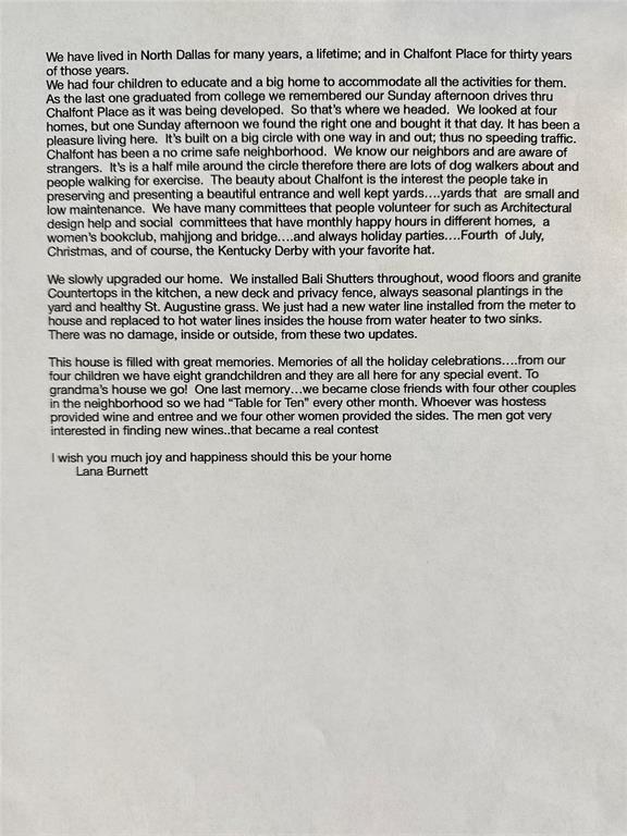 OPEN HOUSE SATURDAY SEPTEMBER 20th 11am TO 1:30pm WELCOME HOME TO THE EVER SO POPULAR PRESTON PARK NESTLED IN THE HEART OF NORTH DALLAS ON EXCUSIVE CHALFONT CIRCLE. PRIDE OF OWNERSHIP ABOUNDS AT EVERY TURN IN THIS CUSTOM BUILT HOME FEATURING 2 LIVING SPACES WITH HARDWOOD FLOORS, 2 STUDYS WITH GREAT ARRANGEMENT FOR HOME OFFICE. PLUS OVERSIZED ROOMS WITH LARGE MASTER SUITE, GUEST SUITE WITH PRIVATE BATH AND SITTING AREA, CHEF'S DREAM ISLAND KITCHEN WITH STORAGE AND CABINETS GALORE, HUGE FLOORED ATTIC SPACE WITH CUSTOM STORAGE IN GARAGE. HOME ALSO FEATURES RADIANT BARRIER, LARGE PATIO DECK WITH FLORAL GARDEN AREA AND LIST GOES ON AND ON....BE MESMERIZED BY THE CHARM AND DECLARE THIS SPECIAL HOUSE AS HOME BEFORE ITS GONE...MOVE FAST! WON'T LAST!