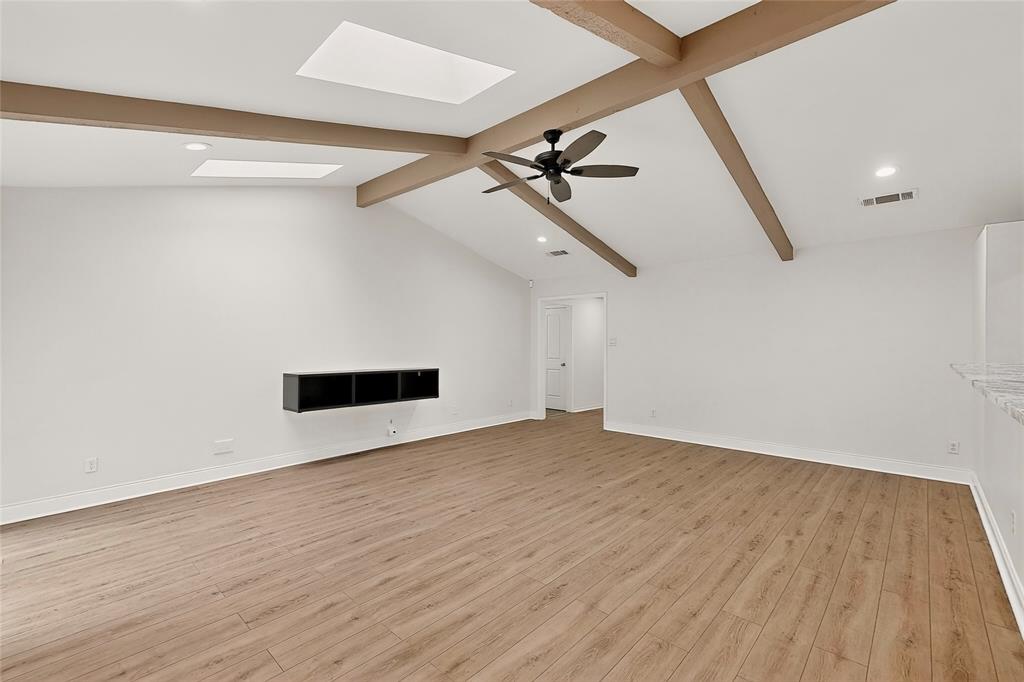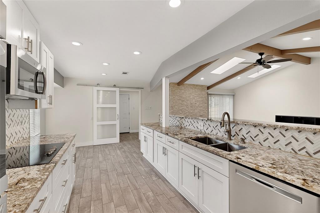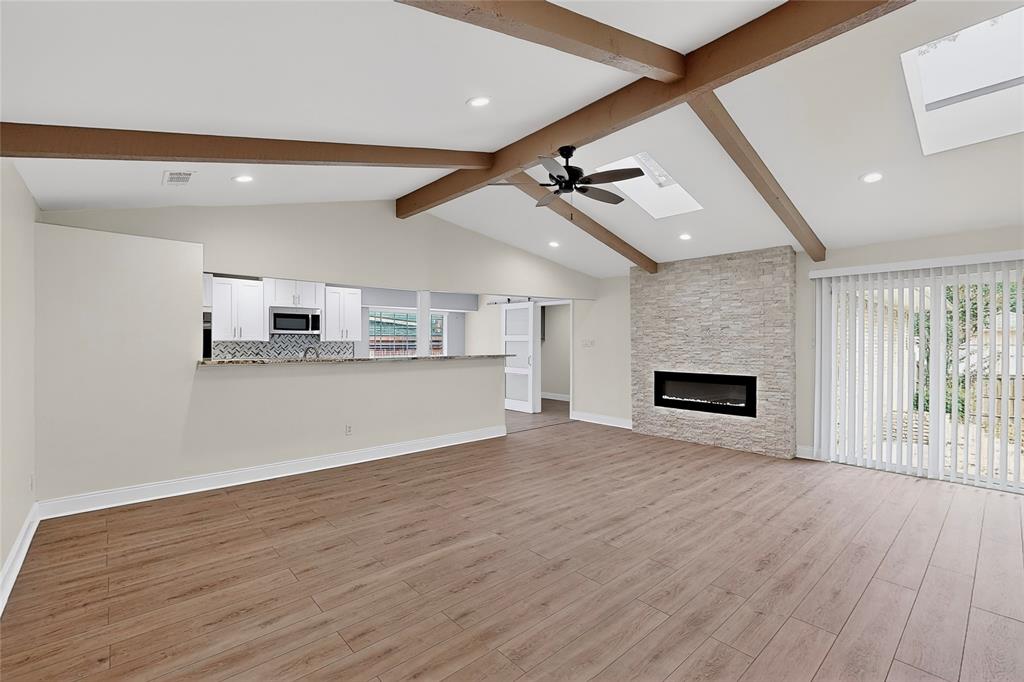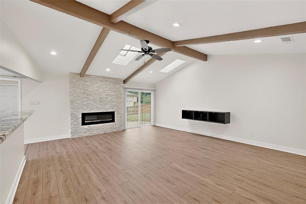 Welcome to this beautifully remodeled 3-bedroom, 2-bathroom home offering 2,023 sqft of modern living space. With an open-concept design, this home blends comfort and style seamlessly. Step into the spacious living room featuring a stunning floor-to-ceiling stone electric fireplace that creates the perfect focal point. Living area gives the perfect amount of natural lighting from the ceiling sky lights. The kitchen is a chef’s dream with granite countertops, stainless steel appliances, a double oven, and plenty of cabinet space. Both bathrooms have been completely updated with oversized standing showers and granite finishes, while the primary suite features his and her closets for maximum convenience. All secondary bedrooms are generously sized, providing comfort for family or guests. Enjoy laminate wood floors and fresh paint throughout, giving the entire home a bright and modern feel. The backyard is perfect for gatherings, barbecues, or simply relaxing outdoors.