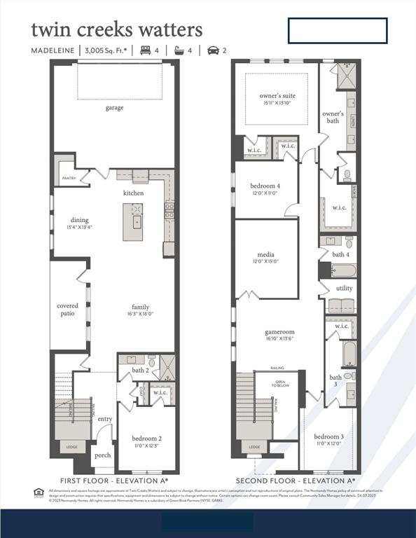 NORMANDY HOMES MADELEINE Floor Plan. The Madeleine is a home that exceeds expectations. Guests will feel right at home in the downstairs secondary bedroom with its adjacent full bathroom, offering both comfort and privacy. The expansive family room, bathed in natural light, creates a warm and inviting space for everyday living. At the heart of the home is a sprawling kitchen and dining area, perfect for bringing loved ones together. Upstairs, discover a versatile game room that leads to a media room—ideal for movie nights or entertaining. Two secondary bedrooms, one with its own private bath, feature spacious walk-in closets, providing ample storage. The private owner’s suite is a true retreat, complete with two generous walk-in closets and a luxurious ensuite bath designed for relaxation. The Madeleine is where comfort, style, and functionality come together beautifully.