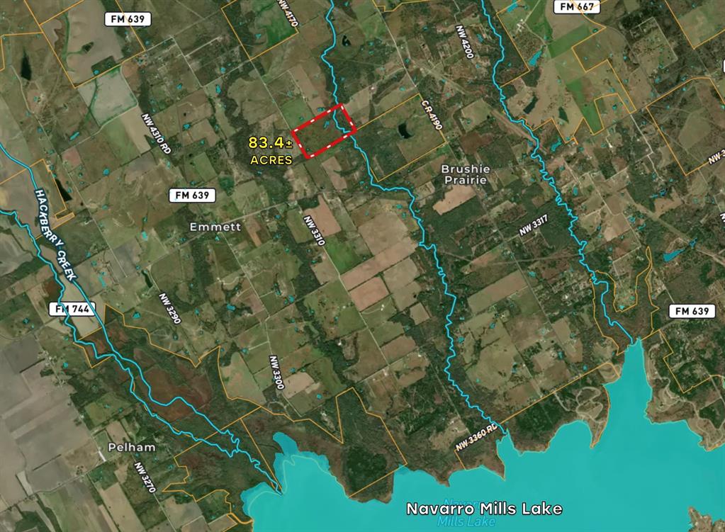 83.4± acres of ranch land in Navarro County, south of Frost and North of Navarro Mills Lake. Excellent property for ranching, recreation or a family home. The property includes two ponds and a wooded creek area that serves as a pathway for wildlife. A new survey has been ordered but is not yet complete.