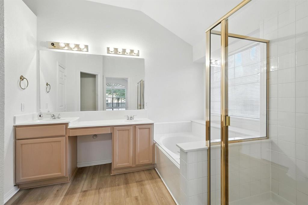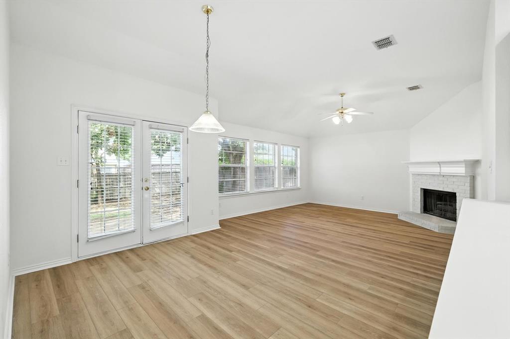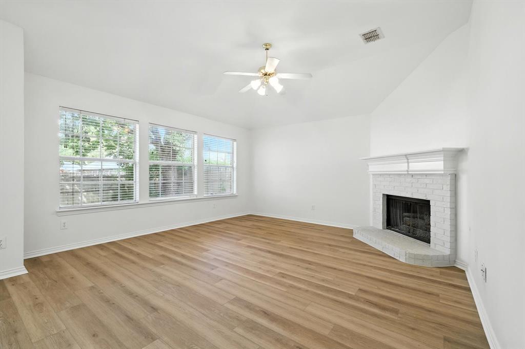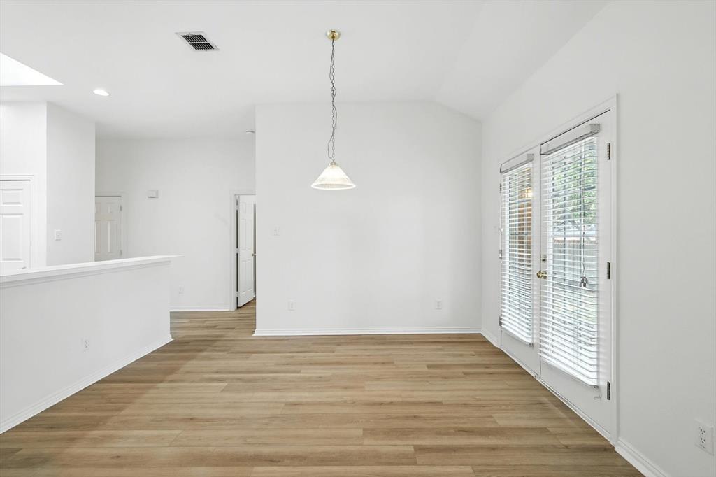 Inside, you’ll find two spacious living areas, two dining spaces, and solid-surface flooring throughout for easy maintenance. The light and bright kitchen features a pantry and crisp white appliances, creating a welcoming hub for everyday living. The private primary suite offers an en-suite bathroom with a separate glass shower for comfort and convenience. Outdoors, enjoy a backyard shaded by large mature trees, complete with a wood privacy fence—perfect for gatherings, play, or simply relaxing. A two-car garage provides plenty of storage and parking.
