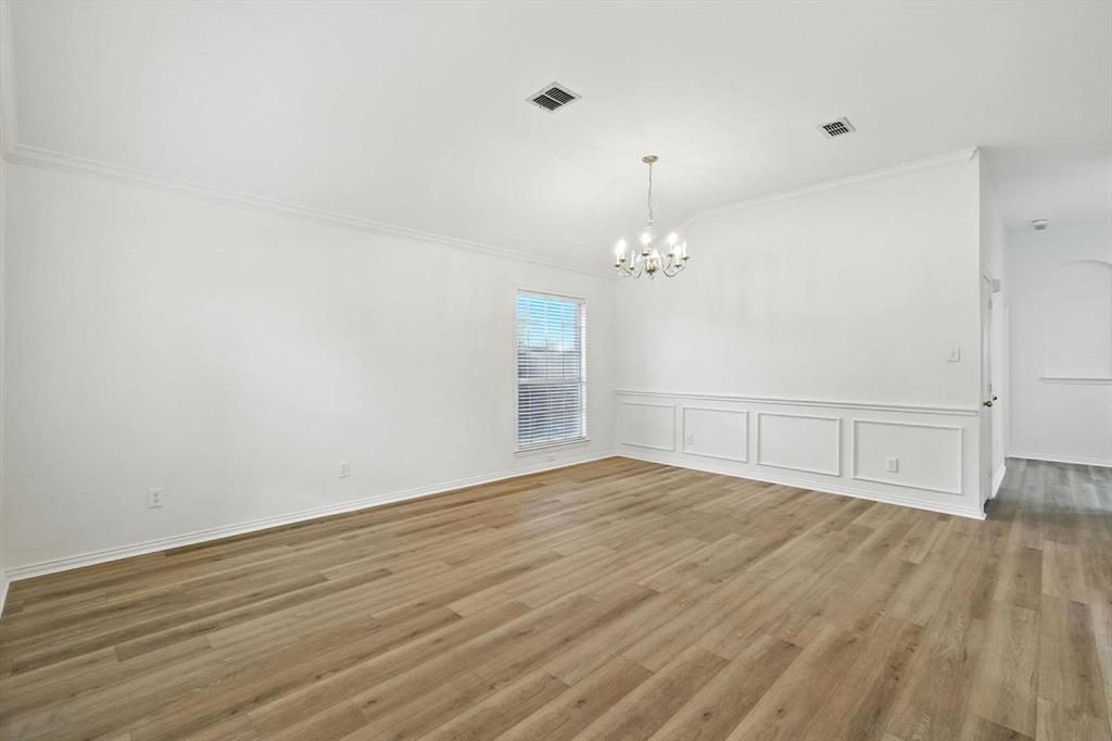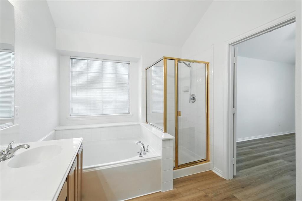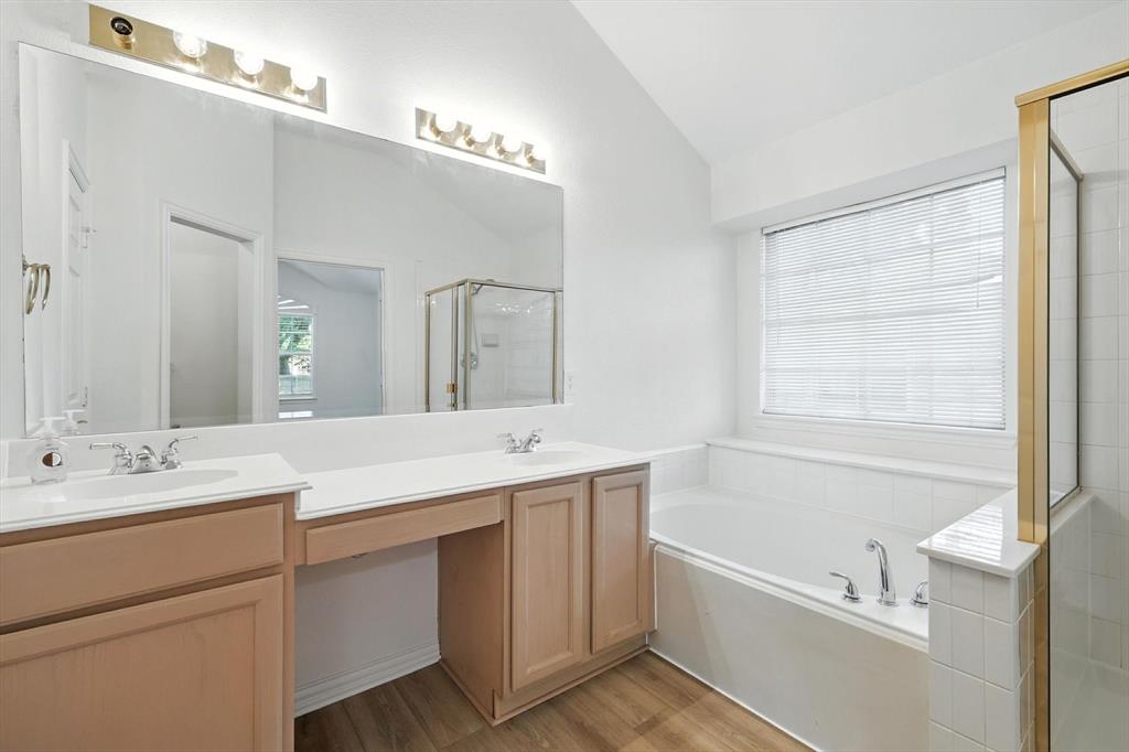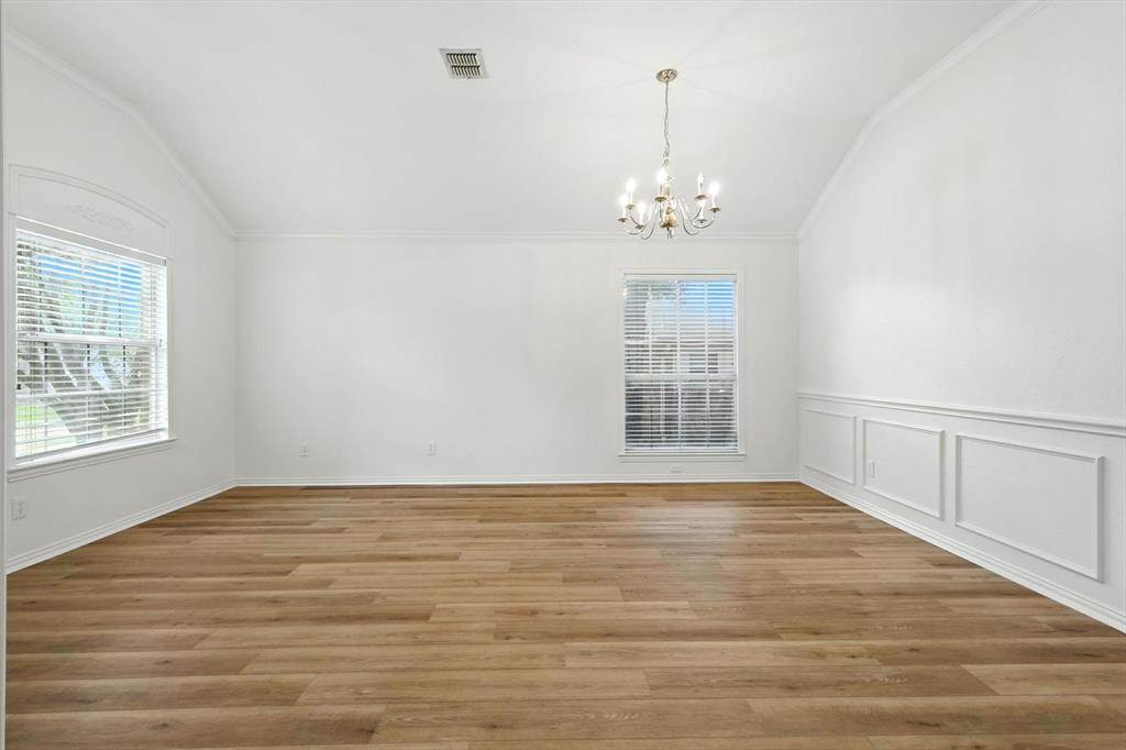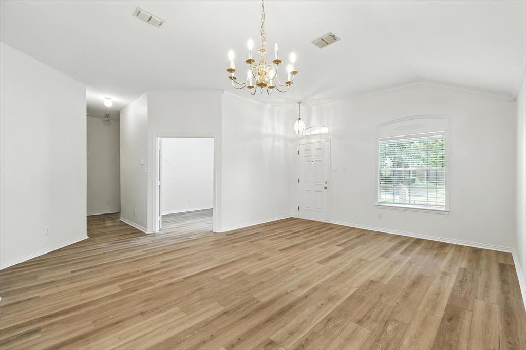 Inside, you’ll find two spacious living areas, two dining spaces, and solid-surface flooring throughout for easy maintenance. The light and bright kitchen features a pantry and crisp white appliances, creating a welcoming hub for everyday living. The private primary suite offers an en-suite bathroom with a separate glass shower for comfort and convenience. Outdoors, enjoy a backyard shaded by large mature trees, complete with a wood privacy fence—perfect for gatherings, play, or simply relaxing. A two-car garage provides plenty of storage and parking.