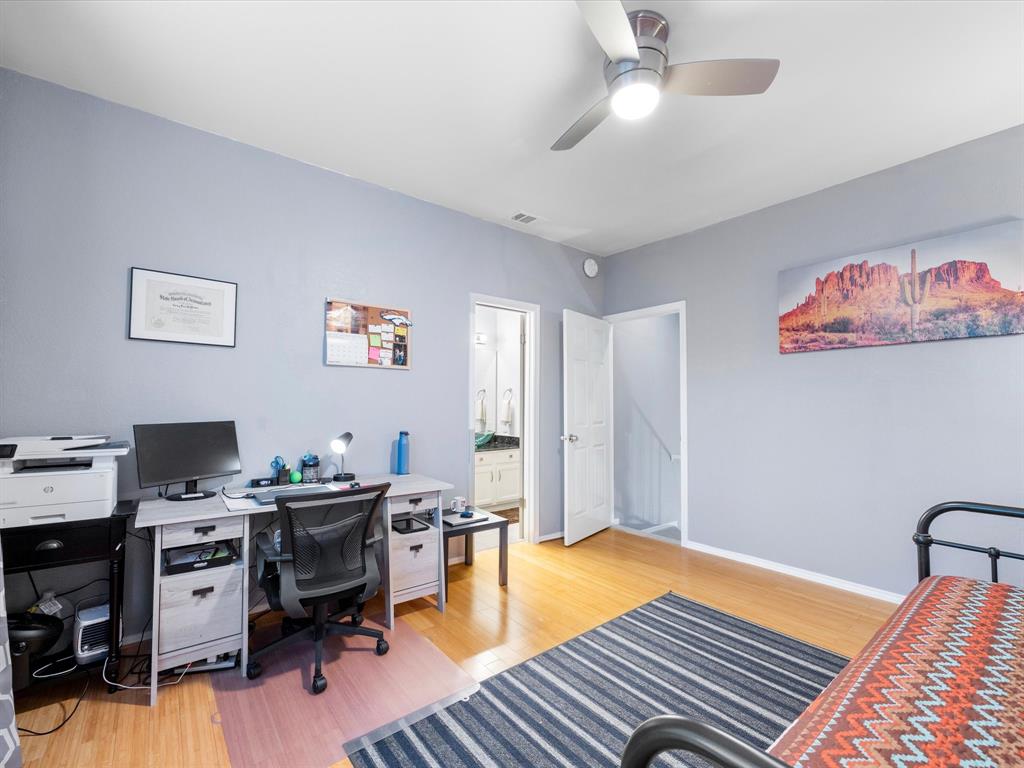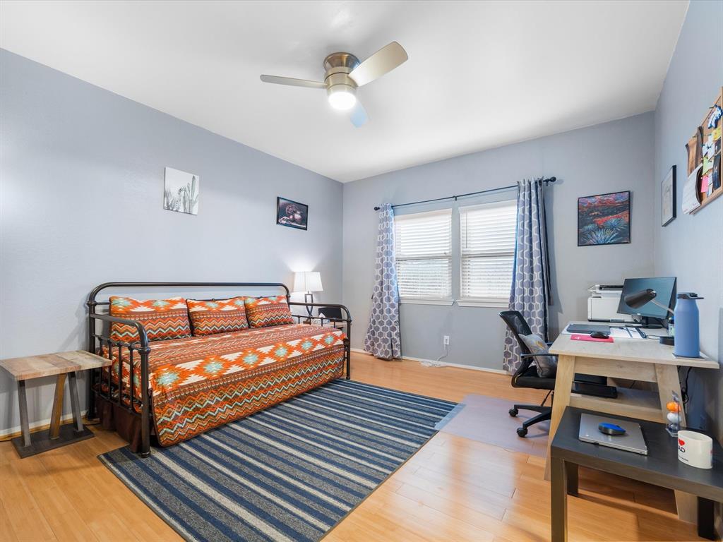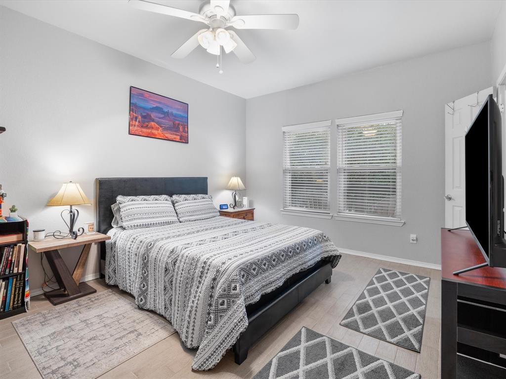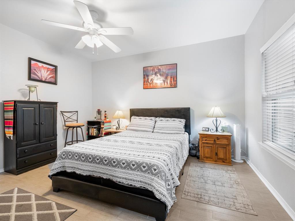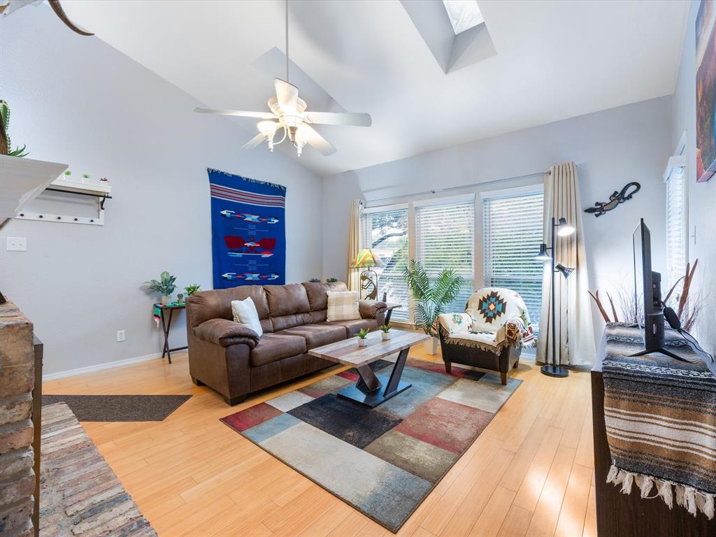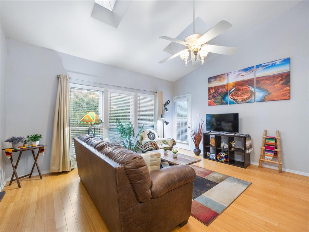 This home offers two spacious primary bedrooms, each with walk-in closets, perfect for flexible living arrangements, roommates, or guests. Enjoy added natural light from skylights, and enjoy the balcony for a bit of fresh air. A detached one-car garage, gated courtyard, and no exterior maintenance responsibilities make for effortless living. The community features two sparkling swimming pools, offering the perfect retreat on warm Texas days.