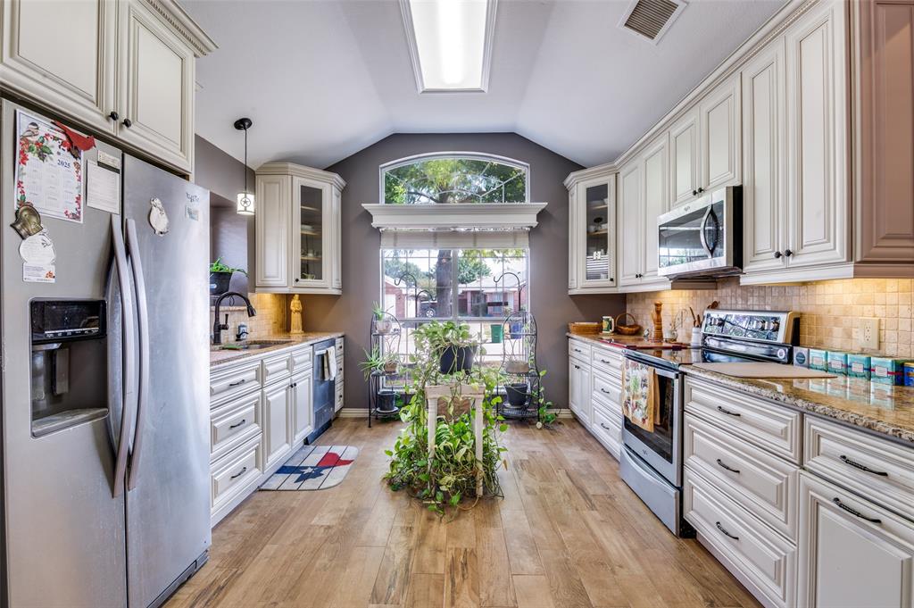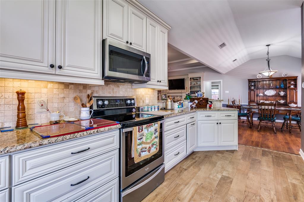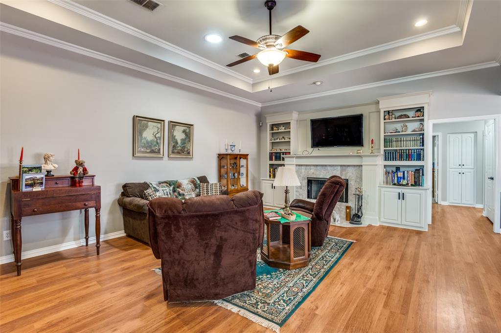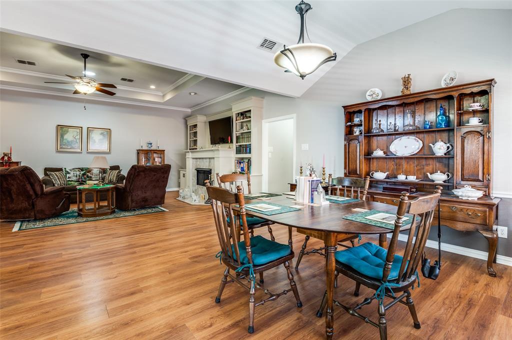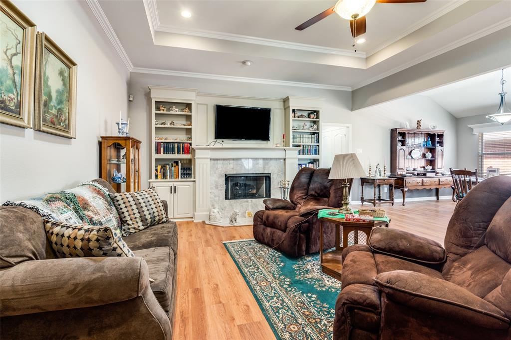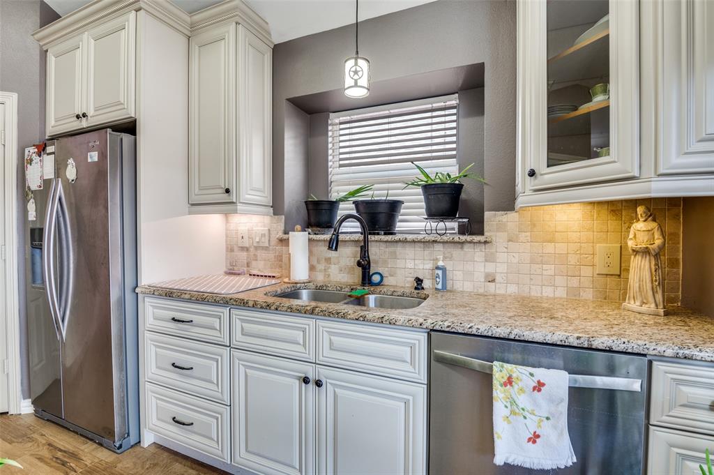 Step into this beautifully maintained 3-bedroom, 2-bath home that combines style, comfort, and functionality. From the moment you enter, you’ll notice the gorgeous flooring and the bright, open floor plan. The heart of the home is the white kitchen featuring granite countertops, a stone backsplash, decorative hardware, and cabinet and storage space galore. A charming plant ledge window above the sink adds natural light and character. Just off the kitchen, gather in the living room around the marble fireplace, flanked by built-in bookcases, all under a stunning tray ceiling. Across from the living space is a bright dining area, perfect for everyday meals or entertaining. The primary suite is a true retreat with another tray ceiling, abundant natural light, and a spa-like ensuite featuring dual sinks with granite countertops, an oversized fully tiled shower, and a spacious his-and-hers walk-in closet with built-in drawers and a vanity or desk area. Who could ask for more? Two additional bedrooms share a stylish guest bath with granite countertops. The utility room is thoughtfully designed with a sink, counter space and room for a full-size washer and dryer. Step outside to your covered patio and porch, making it the the perfect spot for morning coffee or relaxing evenings. Every detail has been carefully maintained, making this home move-in ready and full of charm. This home has it all, elegant finishes, thoughtful details, and plenty of space to live, work, and play. Conveniently located near shopping, dining, highways and hospital.