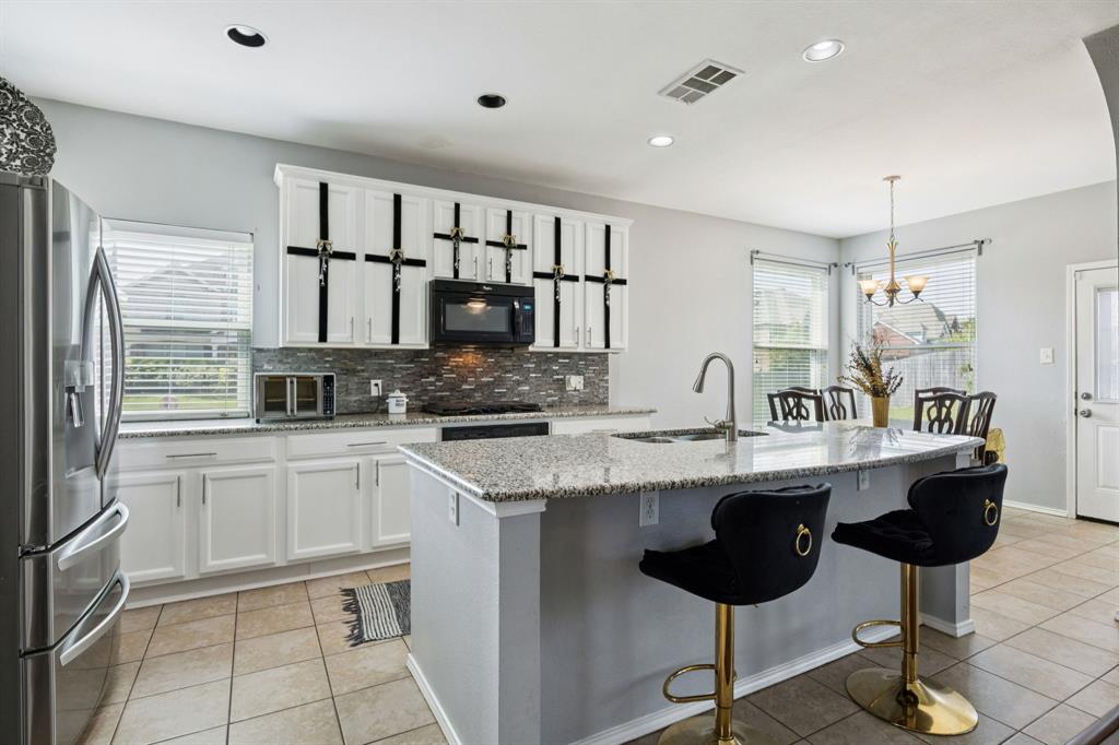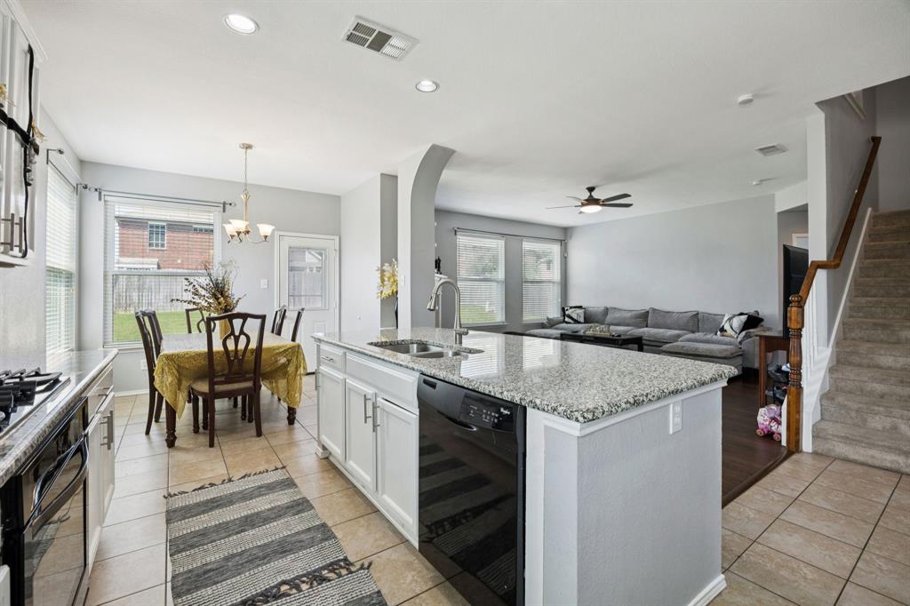 Inside, the main level flows easily from the family room into the dining area and kitchen, with two additional spaces that work beautifully as a dining room, home office or flex spaces. The kitchen features granite countertops, a central island, and ample cabinet space, creating a practical setup for both cooking and entertaining. The primary bedroom is also located on the first floor and includes an ensuite bathroom and walk-in closet, offering a private retreat away from the secondary bedrooms.