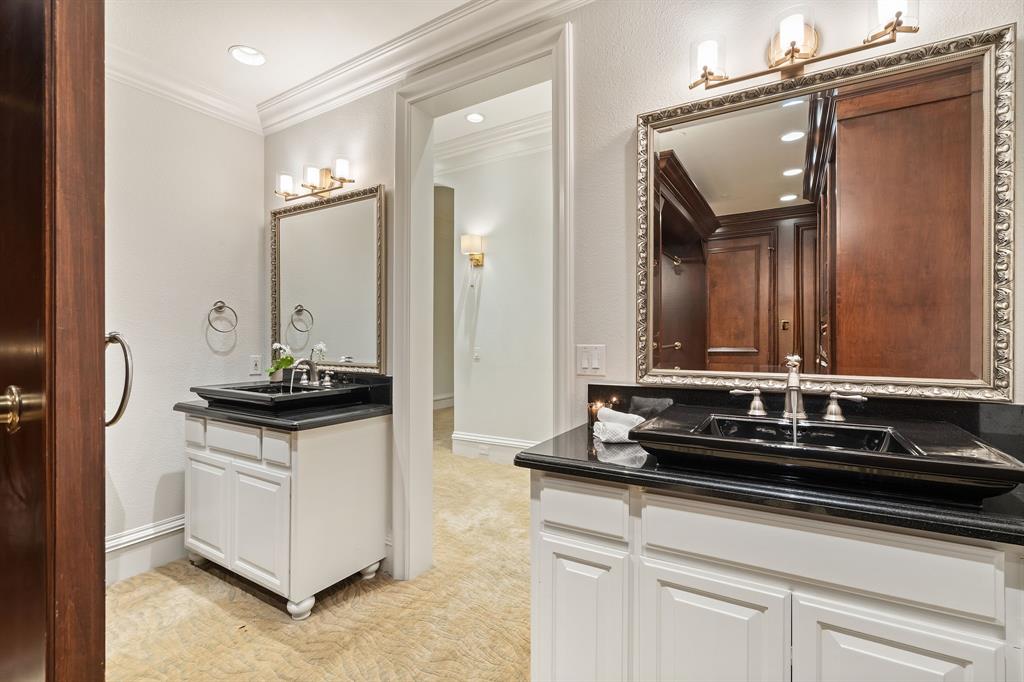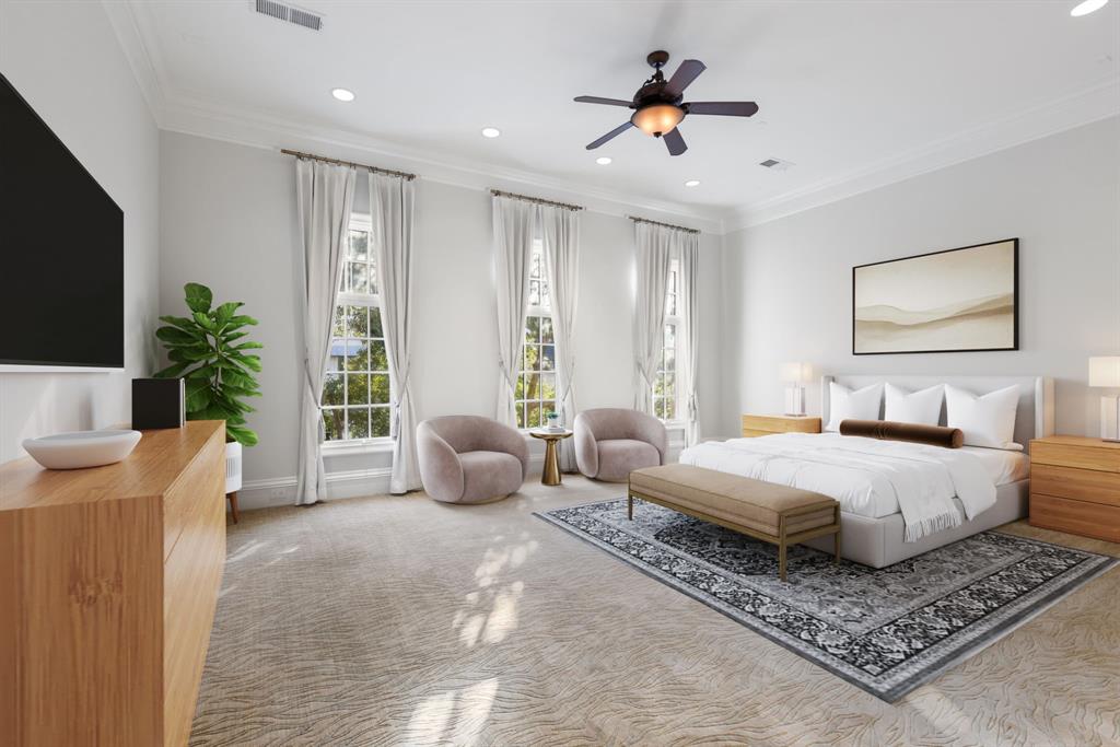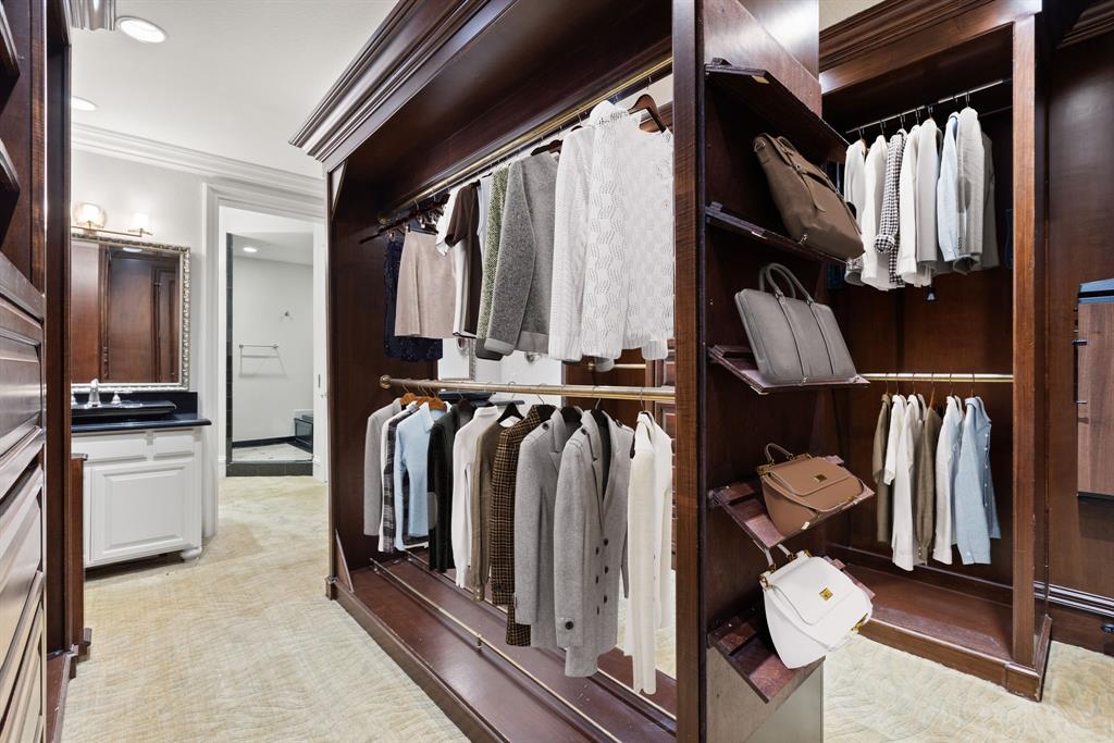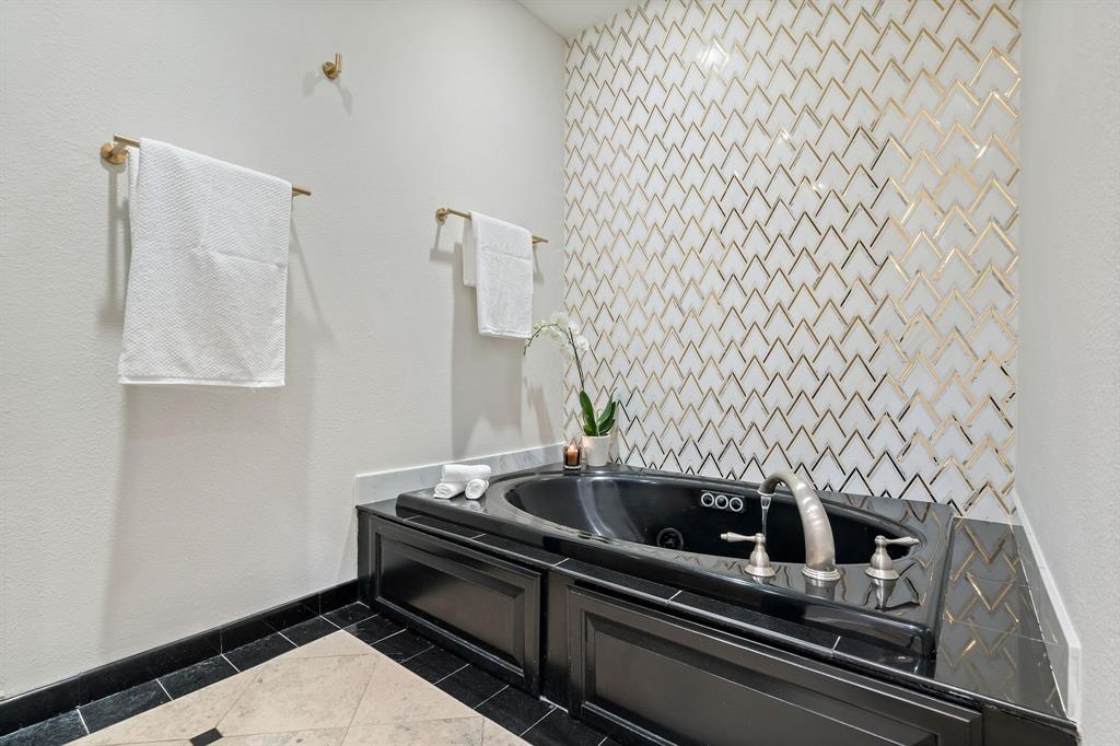 Third Level – The primary suite defines elegance with a grand walk-in closet, dual vanities, a jetted soaking tub, and separate shower.