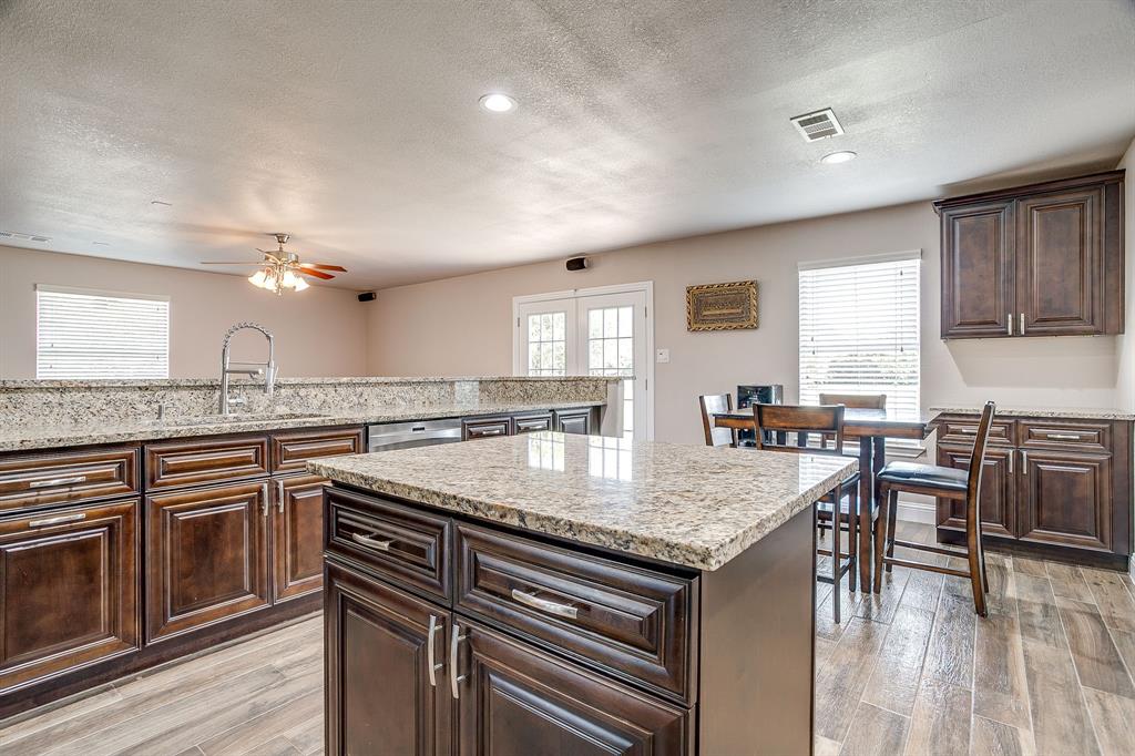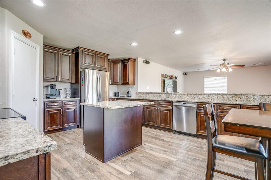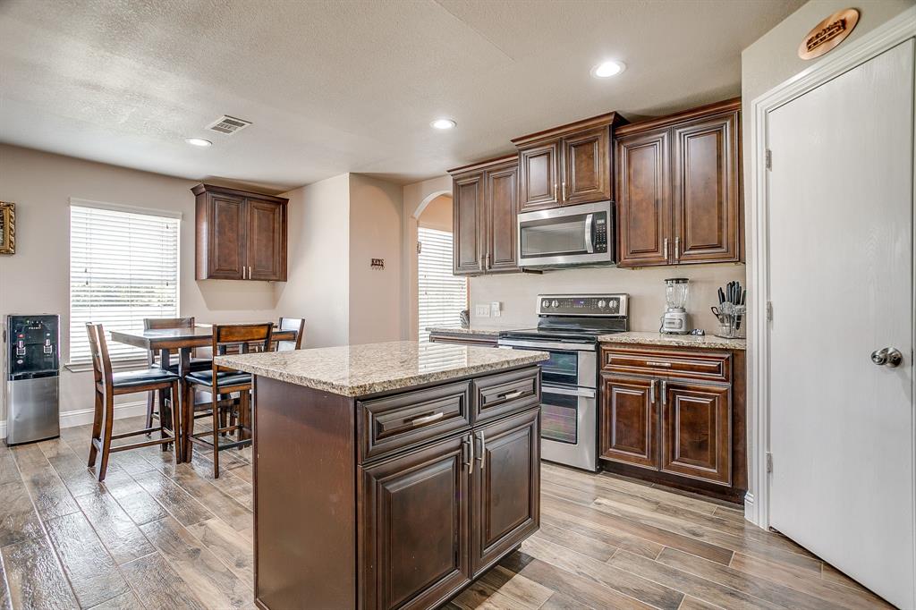 At the heart of the home is a chef-inspired kitchen complete with custom cabinetry, recessed lighting, granite countertops, stainless steel appliances, and abundant workspace. The open flow into the dining and living areas creates a warm and welcoming atmosphere filled with natural light.