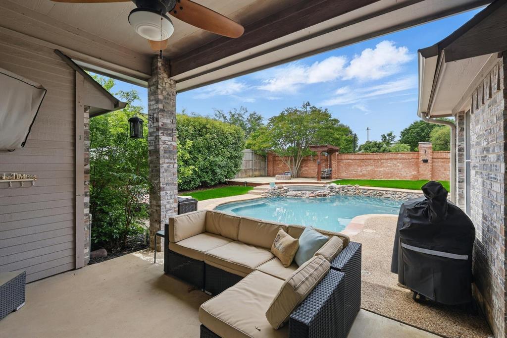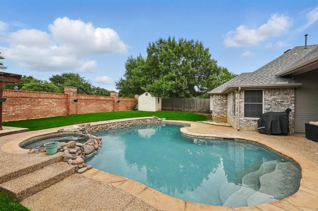Welcome to 8133 Pecan Ridge Drive – A North Richland Hills Gem in Keller ISD! From the moment you arrive, you’ll be captivated by the curb appeal of this beautifully maintained home. A spacious circle drive and fresh landscaping offer a warm welcome — and provide the perfect parking solution for entertaining guests! Step inside to a generously sized living room with a cozy gas fireplace, ideal for relaxing evenings or lively gatherings. The kitchen is a dream for any home chef, featuring extensive counter space, abundant cabinetry, and modern appliances ready for your next culinary creation. The private primary suite is thoughtfully tucked away from the rest of the home, offering a peaceful retreat complete with a spa-like ensuite featuring dual sinks, two separate closets, a separate shower, and a jacuzzi tub for ultimate relaxation. Two additional bedrooms are located on the opposite side of the home, connected by a Jack-and-Jill style bathroom. A fourth bedroom, perfect for guests or a home office, is tucked away at the back of the house next to the third full bathroom. Enjoy year-round living in the sunroom, or take the fun outside to your private backyard oasis — complete with a sparkling pool, pergola, fire pit, and a storage shed for all your outdoor needs. Think it can't get any better? Think again! This home also features a new roof and gutters (2022), HVAC system overhaul including ductwork (2023), pool and jacuzzi pump replaced (2022), and no carpet throughout the home (to name a few). Zoned for highly-rated Keller ISD schools including Liberty Elementary and with convenient access to shopping, dining, and your favorite local coffee spots, you do not want to miss your opportunity to own this move-in-ready beauty in a prime North Richland Hills location!