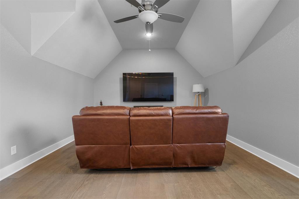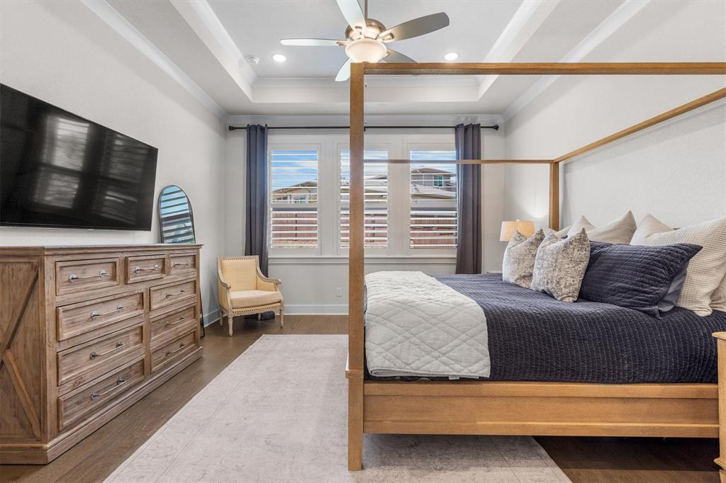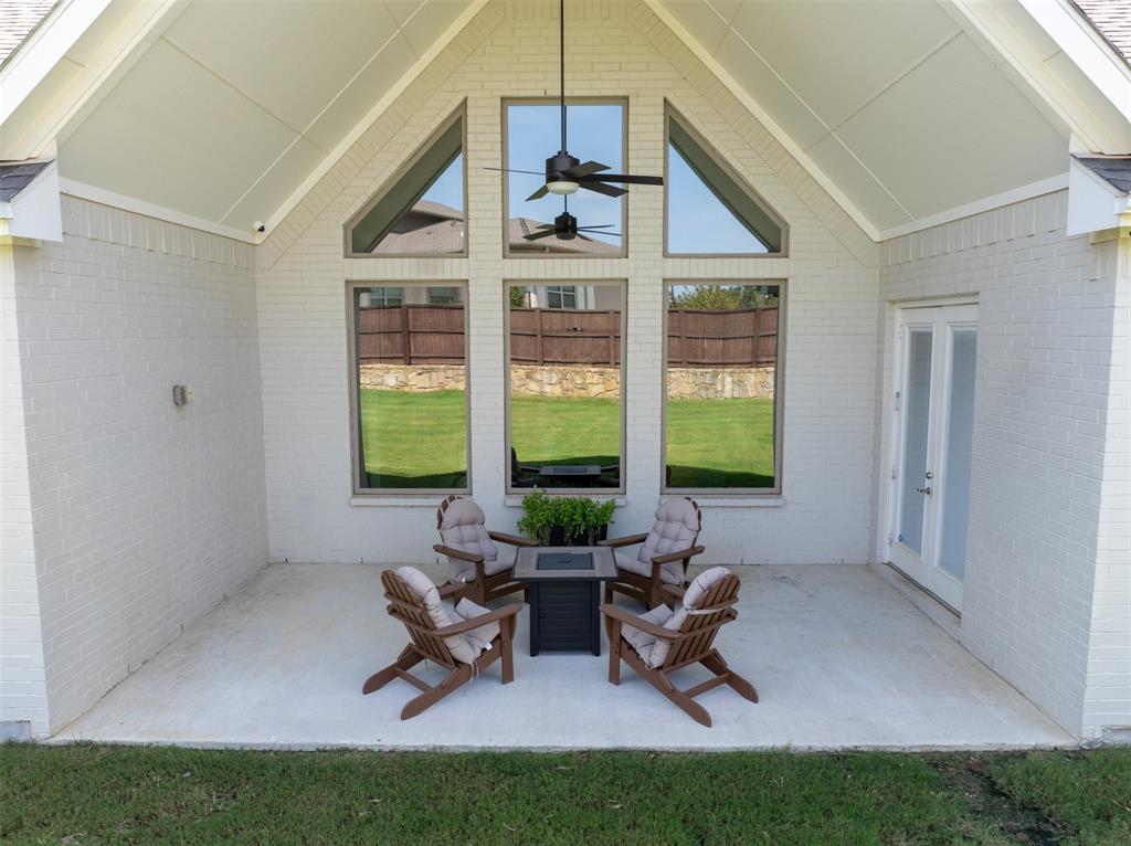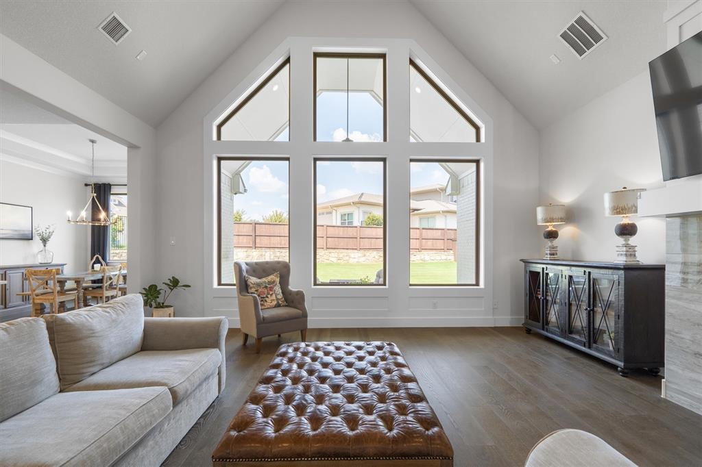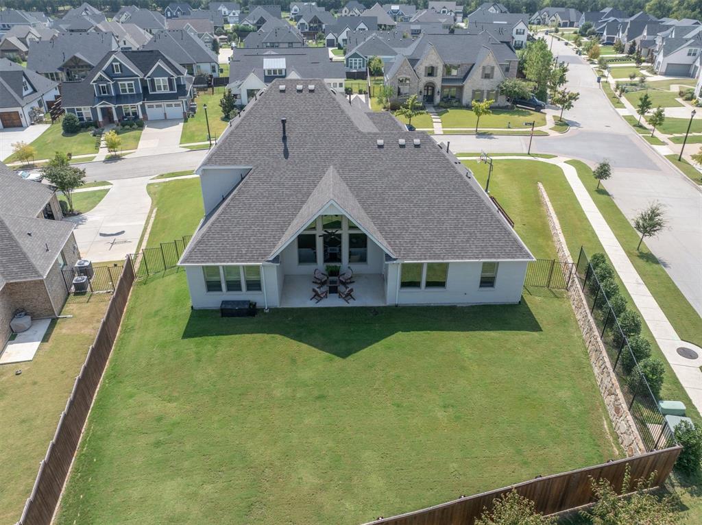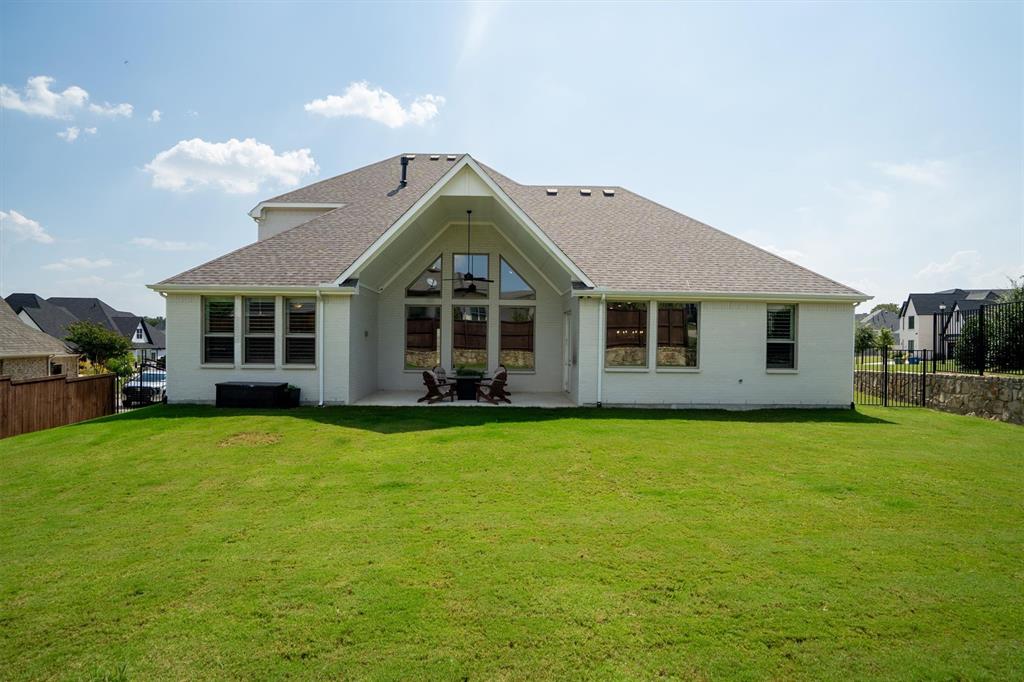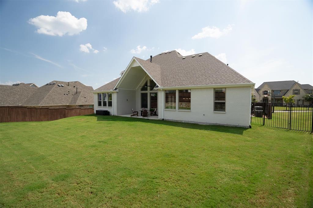 Welcome Home! This breathtaking residence blends generous space with timeless charm. Step inside to a bright, spacious home office overlooking the picturesque neighborhood, ideal for working or studying from home. The sun-drenched living room is a true centerpiece, framed by expansive picture windows that bathe the space in warm, natural light from sunrise to sunset. High ceilings and an open layout create an airy, inviting atmosphere, perfect for cozy mornings, lively gatherings, or simply enjoying the quiet view. The chef’s kitchen is a true showstopper, showcasing a massive island with built-in cabinetry, a walk-in pantry, and a double oven, perfect for everyday meals or entertaining. The serene primary suite offers a peaceful retreat, complete with a spa-like ensuite bath boasting sleek white cabinetry, abundant counter space, a luxurious soaking tub, and a walk-in shower. Upstairs is thoughtfully designed for both privacy and fun, featuring a spacious family room ideal for movie nights, while on the opposite side of the staircase two additional bedrooms offer comfort and ample space for loved ones or guests. The backyard is an outdoor haven. A spacious covered patio provides the ideal spot for grilling, dining al fresco, or simply relaxing with a glass of sweet tea. The expansive lawn offers room for play, gardening, or even a future pool, perfect for enjoying those beautiful Texas nights year-round.