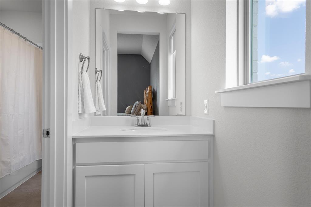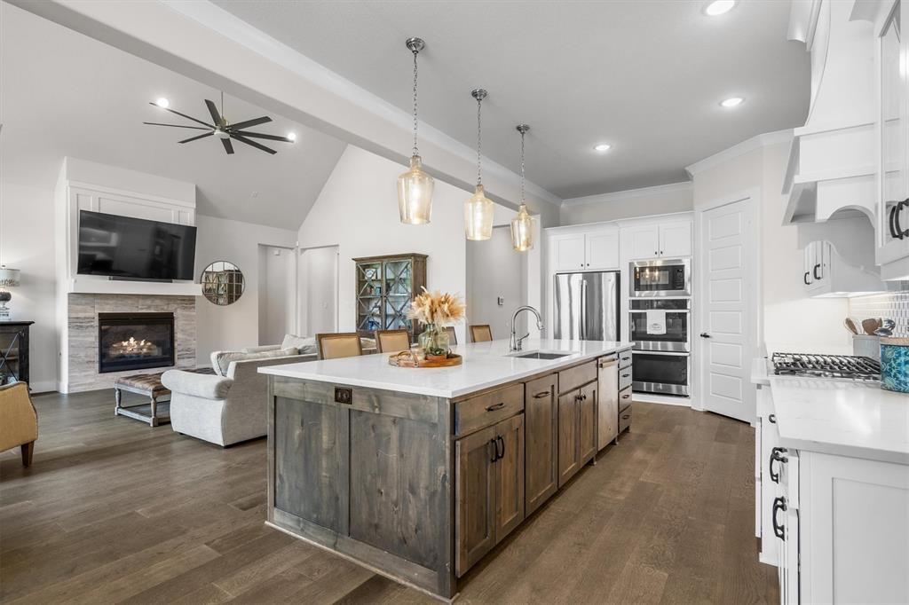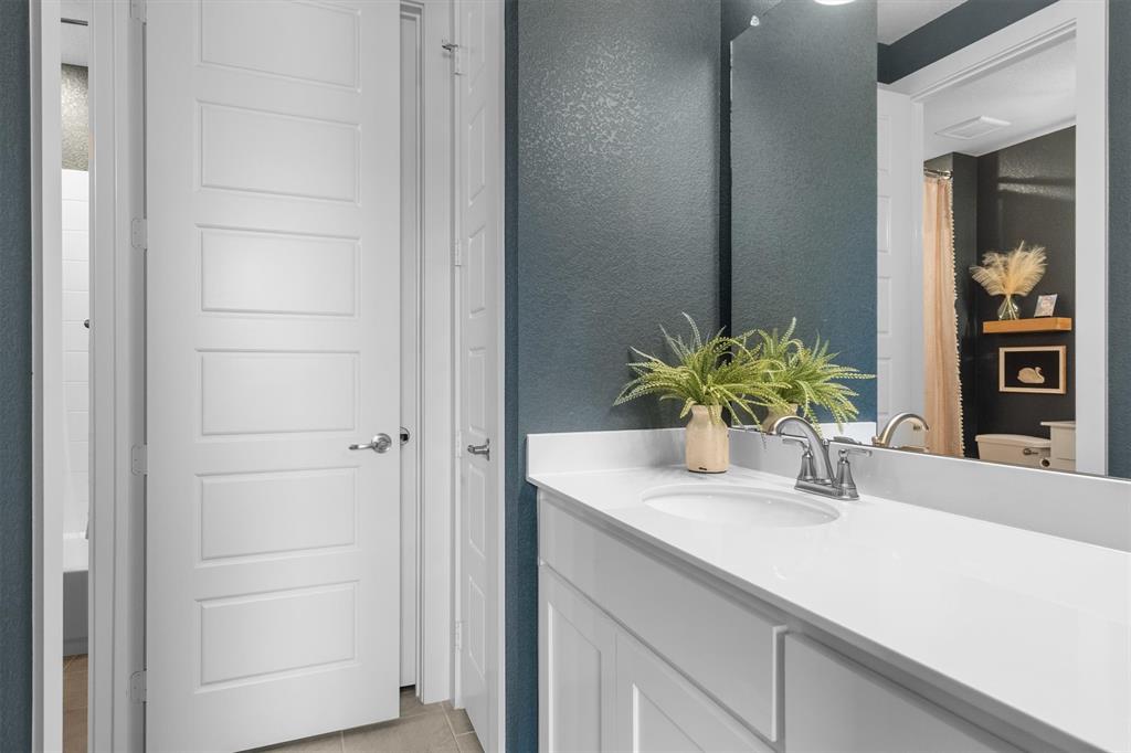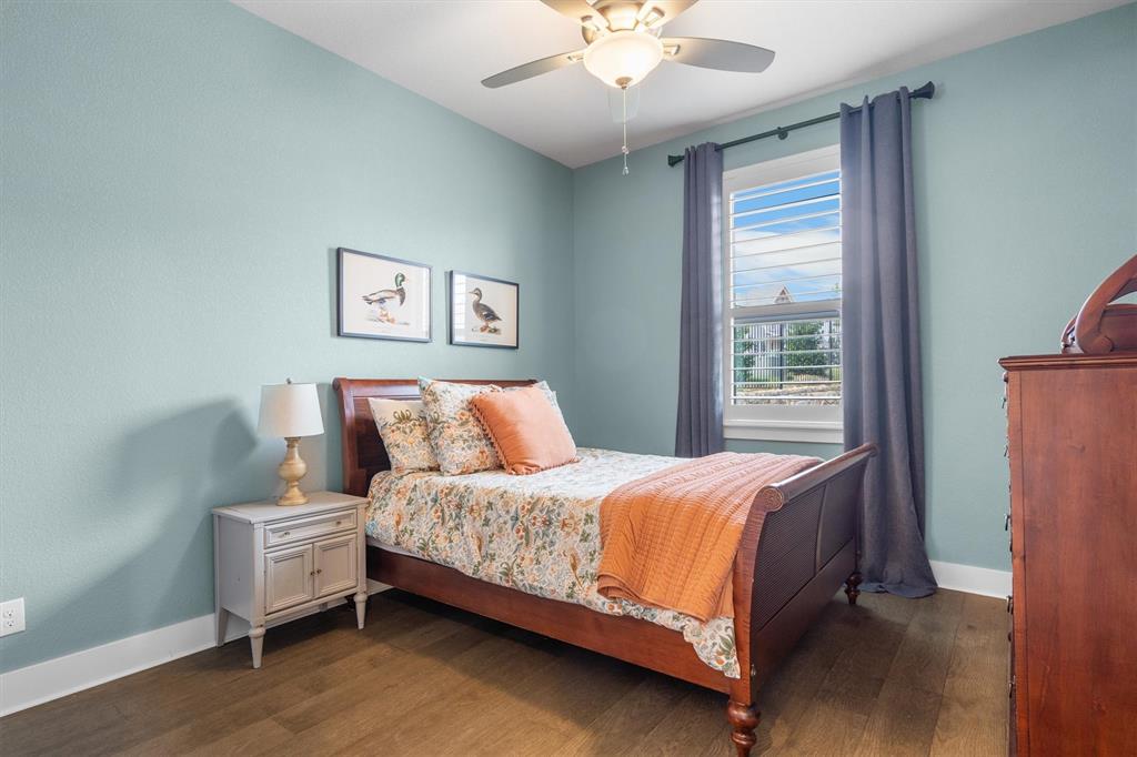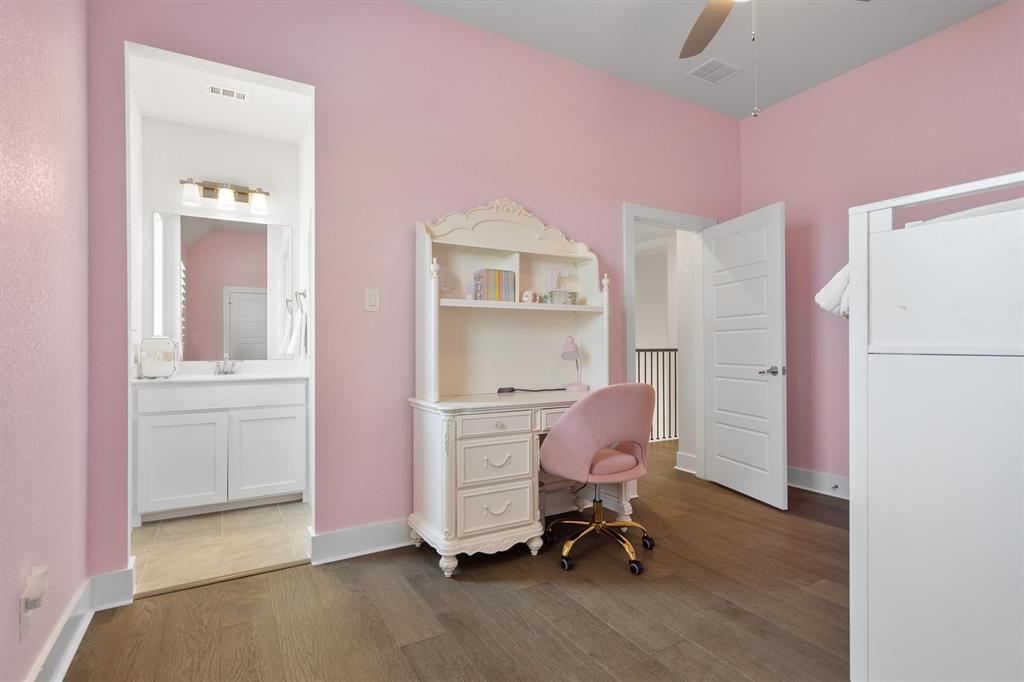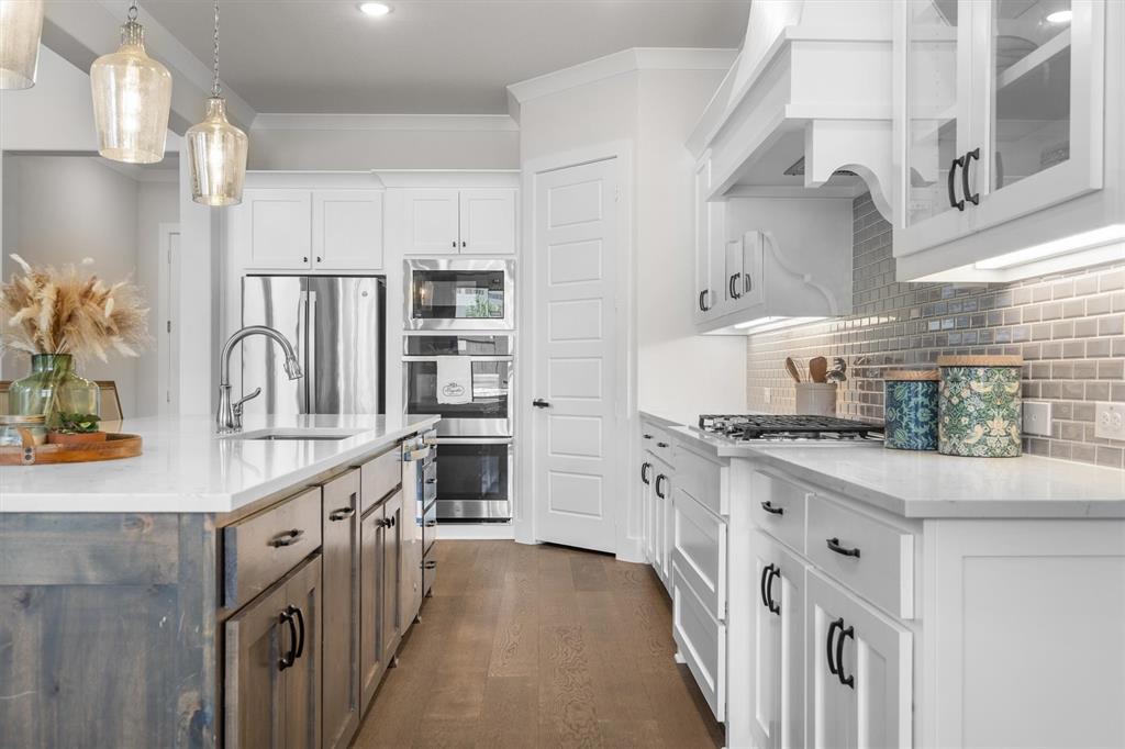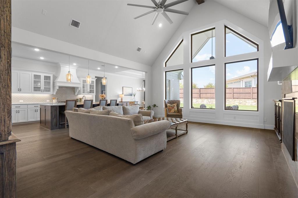 Welcome Home! This breathtaking residence blends generous space with timeless charm. Step inside to a bright, spacious home office overlooking the picturesque neighborhood, ideal for working or studying from home. The sun-drenched living room is a true centerpiece, framed by expansive picture windows that bathe the space in warm, natural light from sunrise to sunset. High ceilings and an open layout create an airy, inviting atmosphere, perfect for cozy mornings, lively gatherings, or simply enjoying the quiet view. The chef’s kitchen is a true showstopper, showcasing a massive island with built-in cabinetry, a walk-in pantry, and a double oven, perfect for everyday meals or entertaining. The serene primary suite offers a peaceful retreat, complete with a spa-like ensuite bath boasting sleek white cabinetry, abundant counter space, a luxurious soaking tub, and a walk-in shower. Upstairs is thoughtfully designed for both privacy and fun, featuring a spacious family room ideal for movie nights, while on the opposite side of the staircase two additional bedrooms offer comfort and ample space for loved ones or guests. The backyard is an outdoor haven. A spacious covered patio provides the ideal spot for grilling, dining al fresco, or simply relaxing with a glass of sweet tea. The expansive lawn offers room for play, gardening, or even a future pool, perfect for enjoying those beautiful Texas nights year-round.