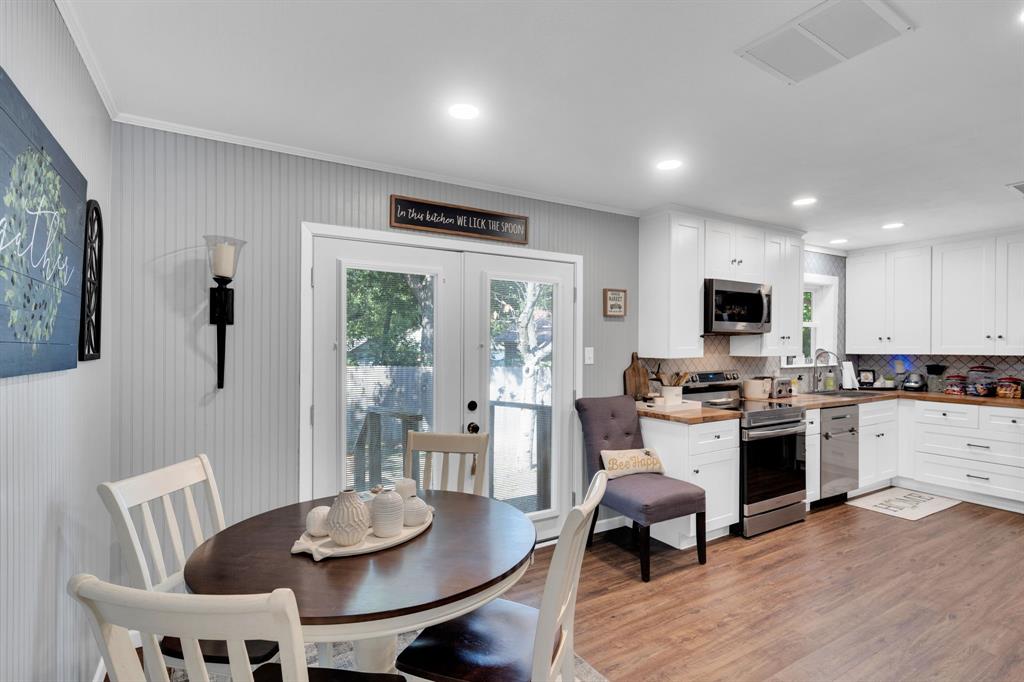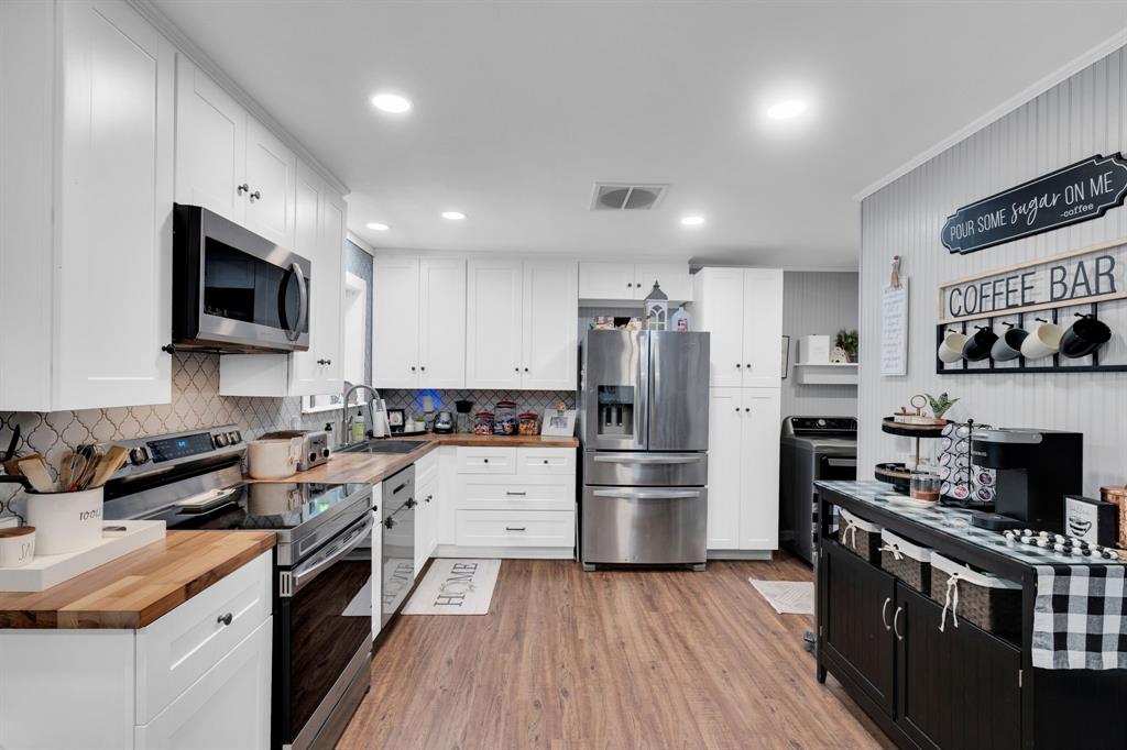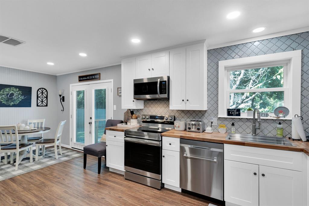 Step inside to find a bright, open living space with updated floors, fresh interior paint, and updated lighting that brings a modern touch to the home’s timeless layout. The kitchen has been tastefully refreshed with newer stainless steel appliances, genuine butcher block countertops, and white cabinetry, making meal prep a joy.