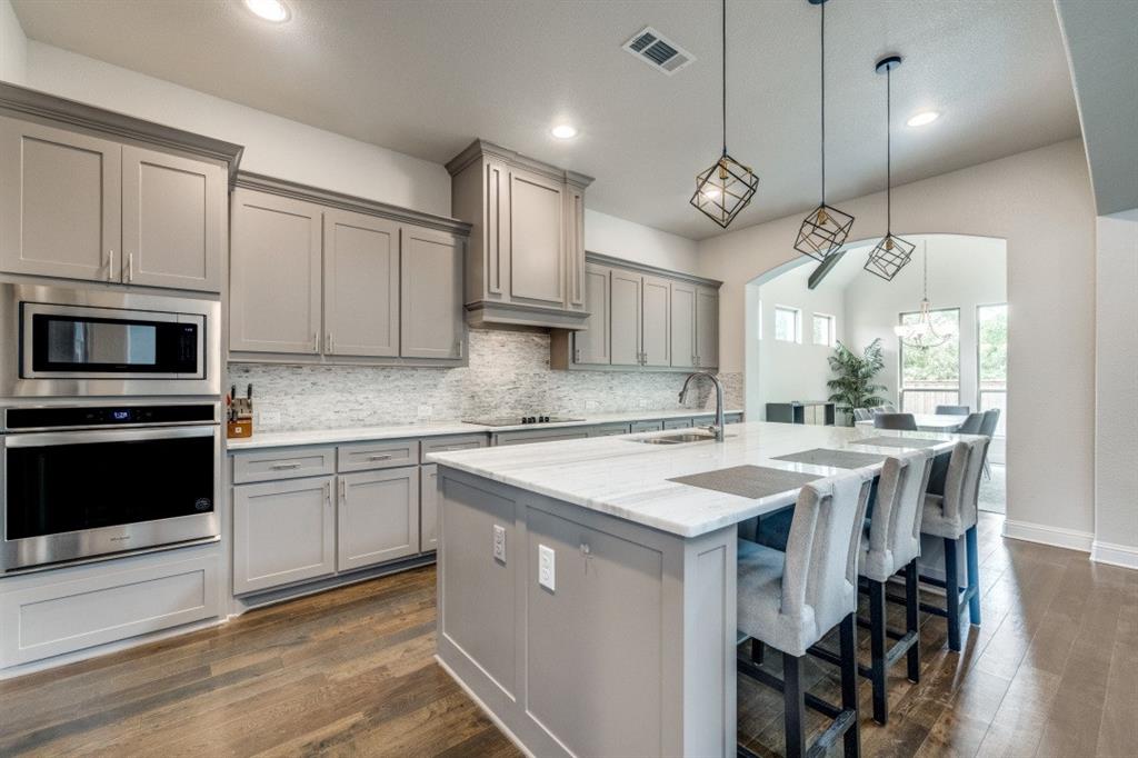 Entertaining is a breeze in this home. The chef’s kitchen is a dream come true, complete with an oversized island, premium stainless steel appliances, ample cabinetry, and a walk-in pantry to store all your culinary essentials. The light-filled breakfast nook offers breathtaking views of the backyard oasis, where vaulted, beamed ceilings add a touch of character and warmth.