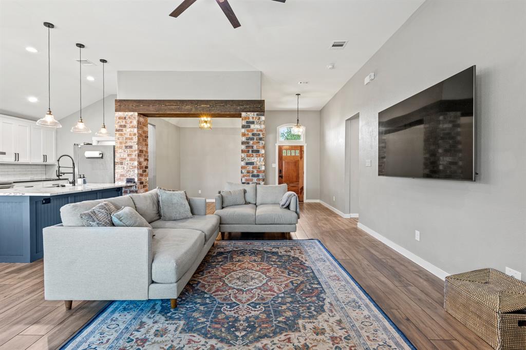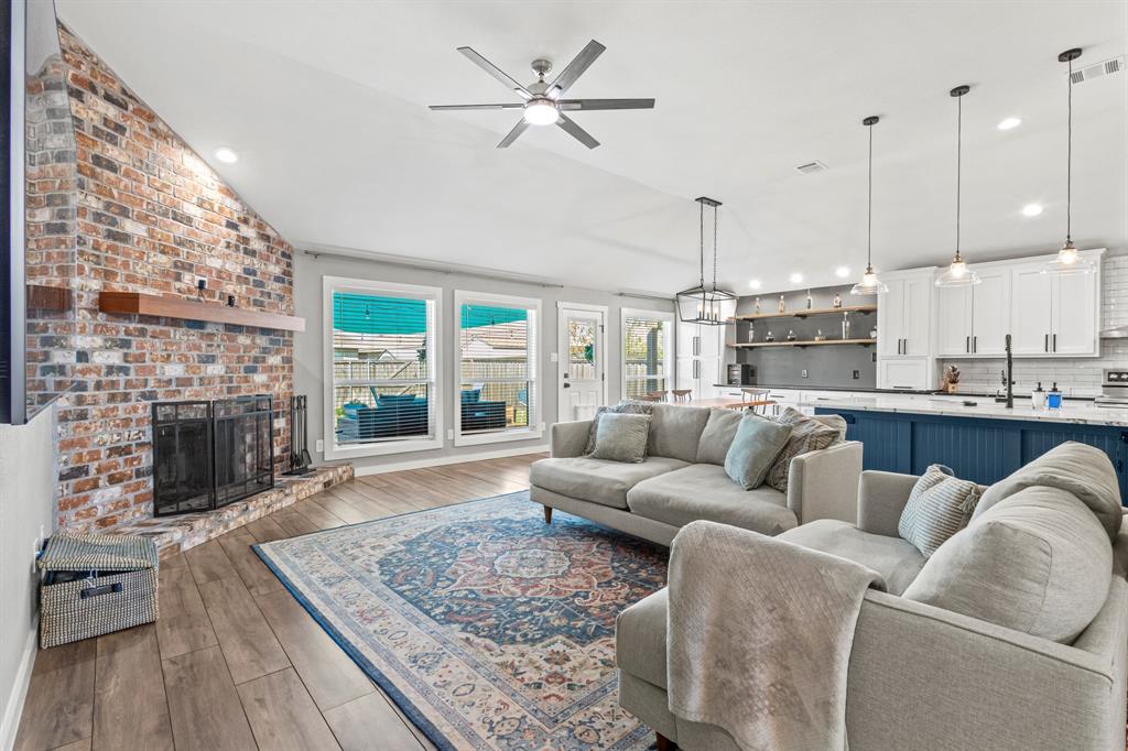 Enjoy an open-concept layout with wood-look tile flooring throughout, a chef’s kitchen with under-cabinet lighting, and a cozy family room with fireplace. The private owner’s suite features a walk-in shower & oversized closet, while the split floorplan offers 2 secondary bedrooms & full bath.
