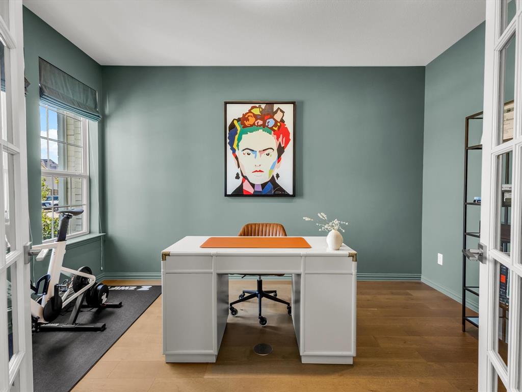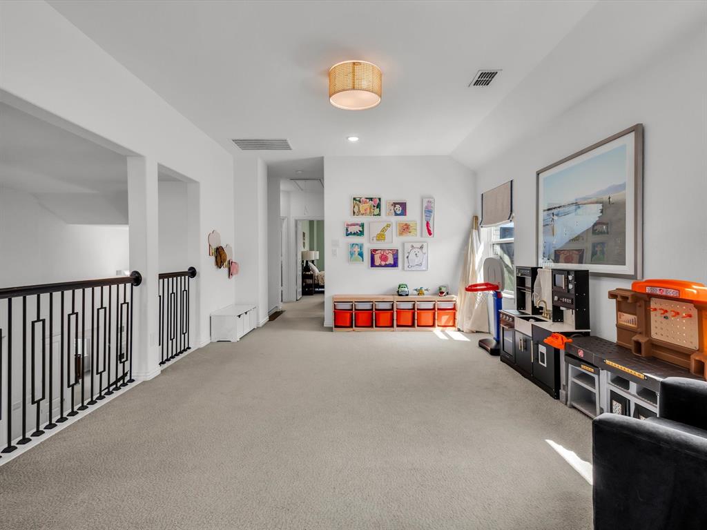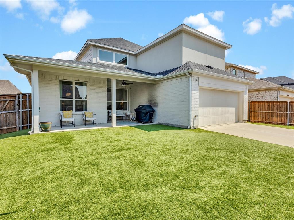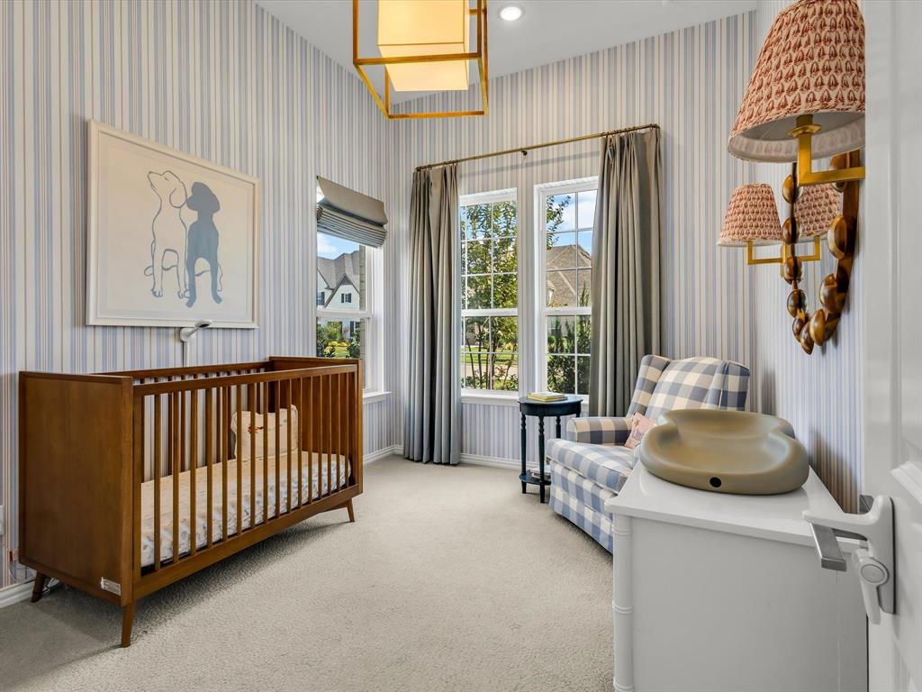 This east-facing 4-bedroom, 3-bath home with study, media and game room offers the perfect blend of style and function in one of Frisco’s most desirable communities. Every detail has been thoughtfully curated, from designer wallpaper and custom window treatments to sophisticated paint selections and elegant lighting creating a home that is both refined and inviting. Walls of windows flood the open layout with natural light, while the chef’s kitchen features white quartz countertops, brass fixtures, a 5-burner gas cooktop, and a walk-in pantry. The oversized owner’s suite is a true retreat with a luxurious en-suite bath, large closet and separate vanities. The private guest suite with full bath is conveniently located downstairs. Upstairs, two additional bedrooms share a full bath alongside a media room and versatile playroom. The backyard is designed for easy living with turf, a covered patio, and an electric gate for added privacy. Just steps from the elementary school and within acclaimed Frisco ISD, this is a rare opportunity to own a designer-inspired residence in the luxury Frisco community of Edgestone at Legacy.