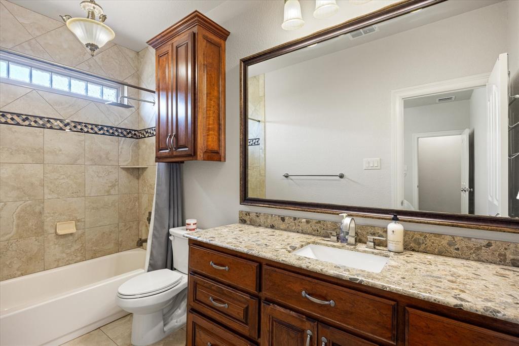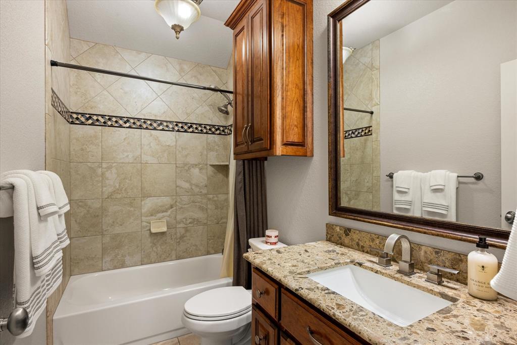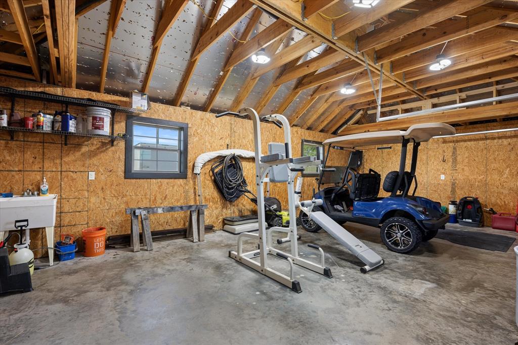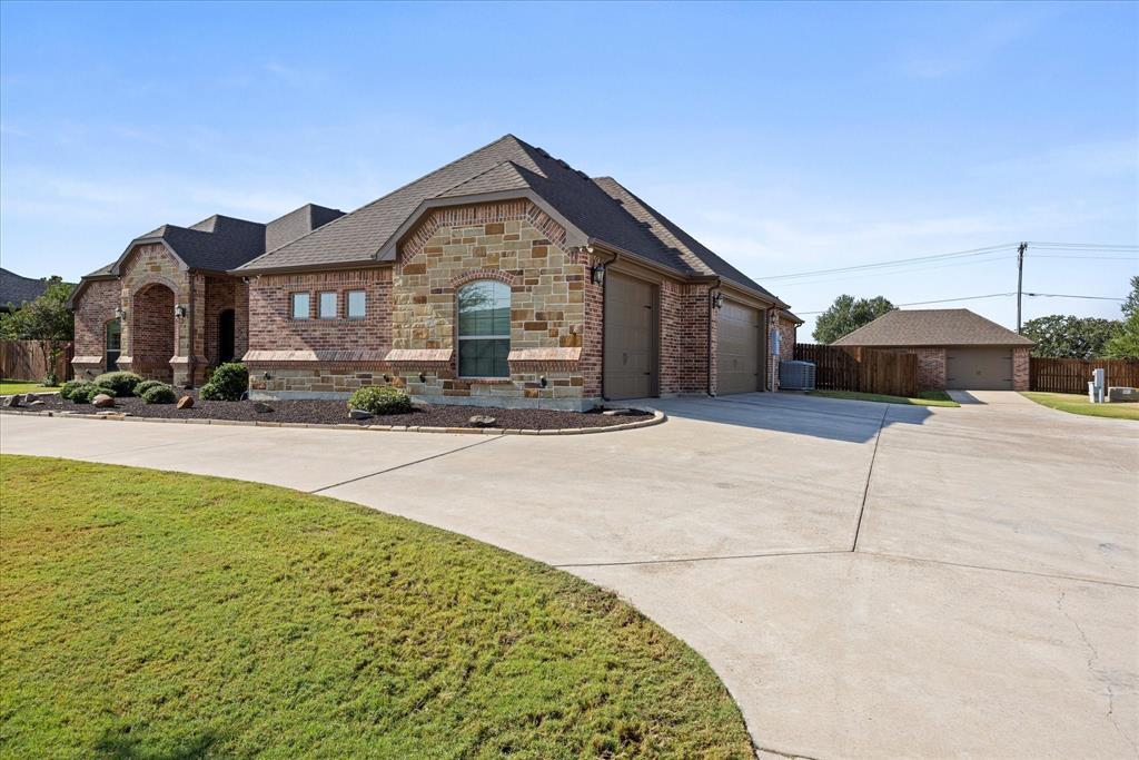 Have big vehicles and toys? No problem for this super-sized 3 car garage with multiple storage areas, including overhead built-ins. Enjoy your 16 X 33 detached garage workshop with overhead garage door plus walk in door with electricity and water. Crushed granite parking pad with 110v outlet located behind the detached for your RV or boat with drive in access from Hideaway Bay.