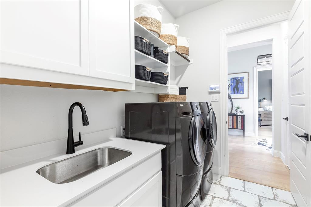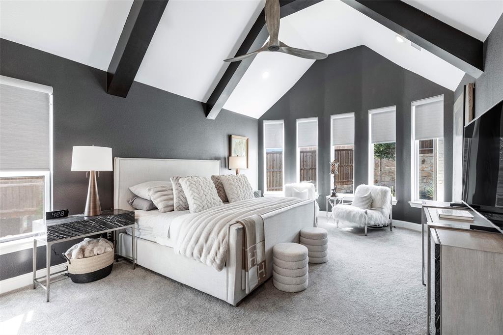 The floorplan offers separation of all 4 bedrooms with the primary tucked at the rear of the home feeling like a sanctuary featuring a vaulted & beamed ceiling that adds character and comfort to your private escape. The suite continues into a luxurious master bath featuring custom tile work, expansive vanity space, oversized shower creating a serene spa-like feel. An oversized closet will not disappoint and for added convenience it connects directly to the laundry room which is complete with sink and storage.