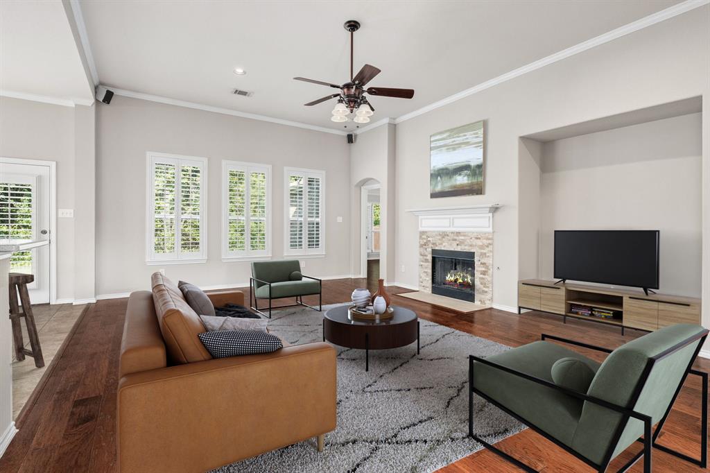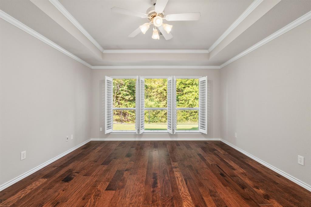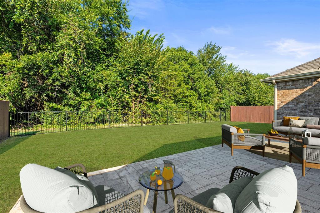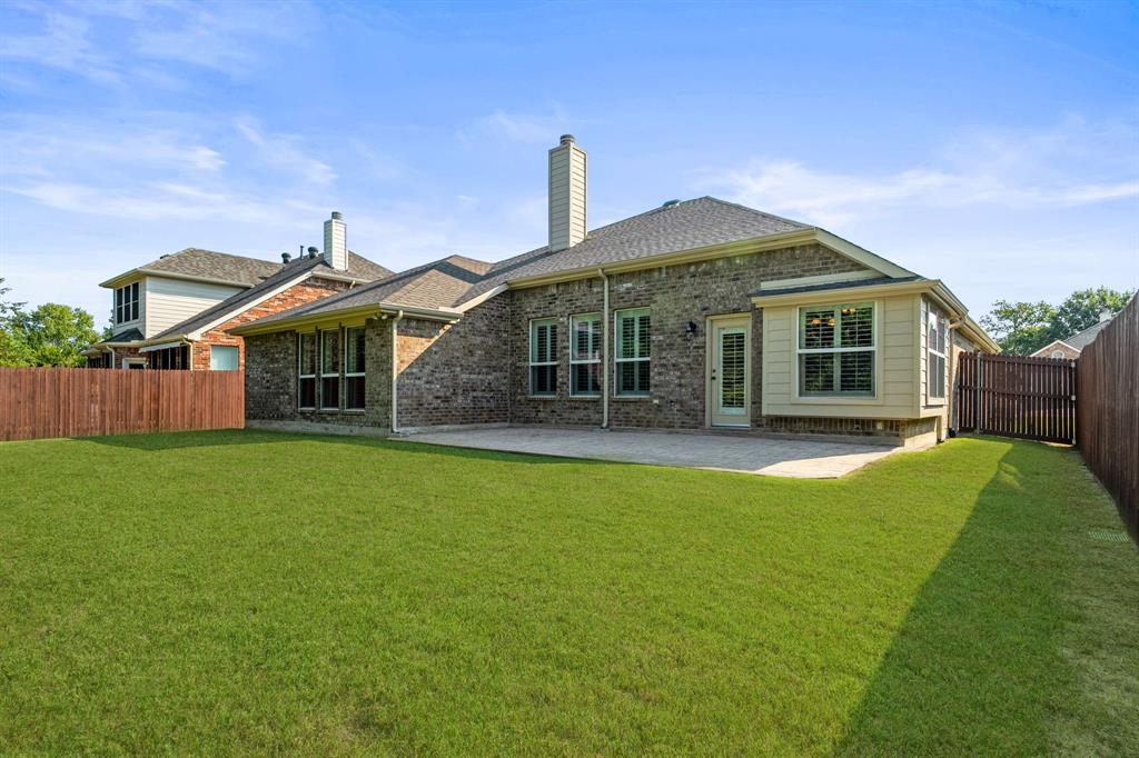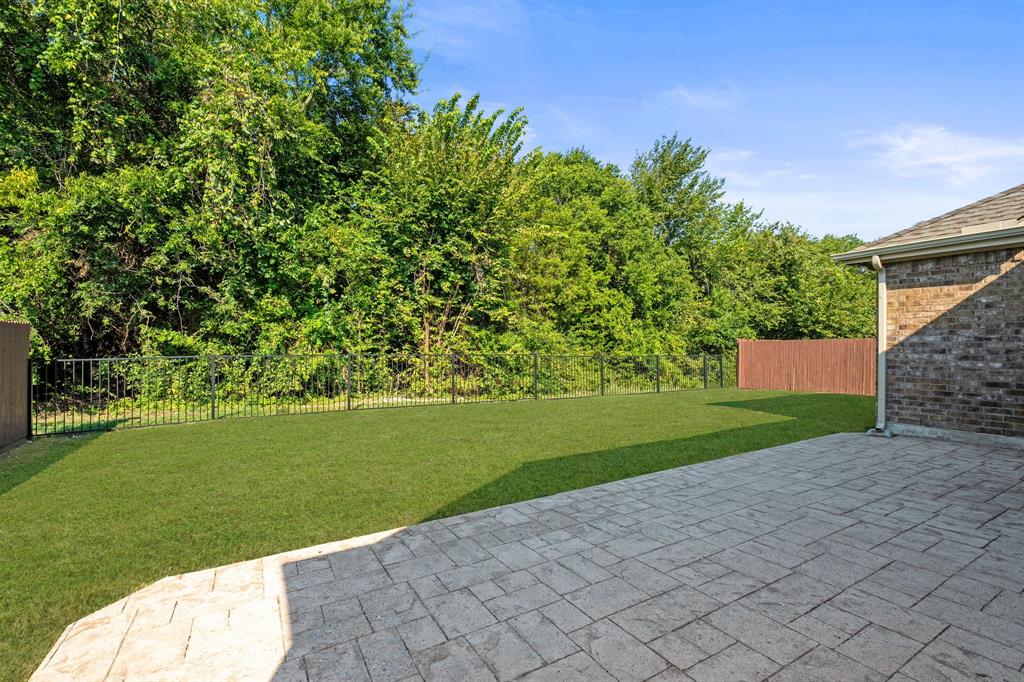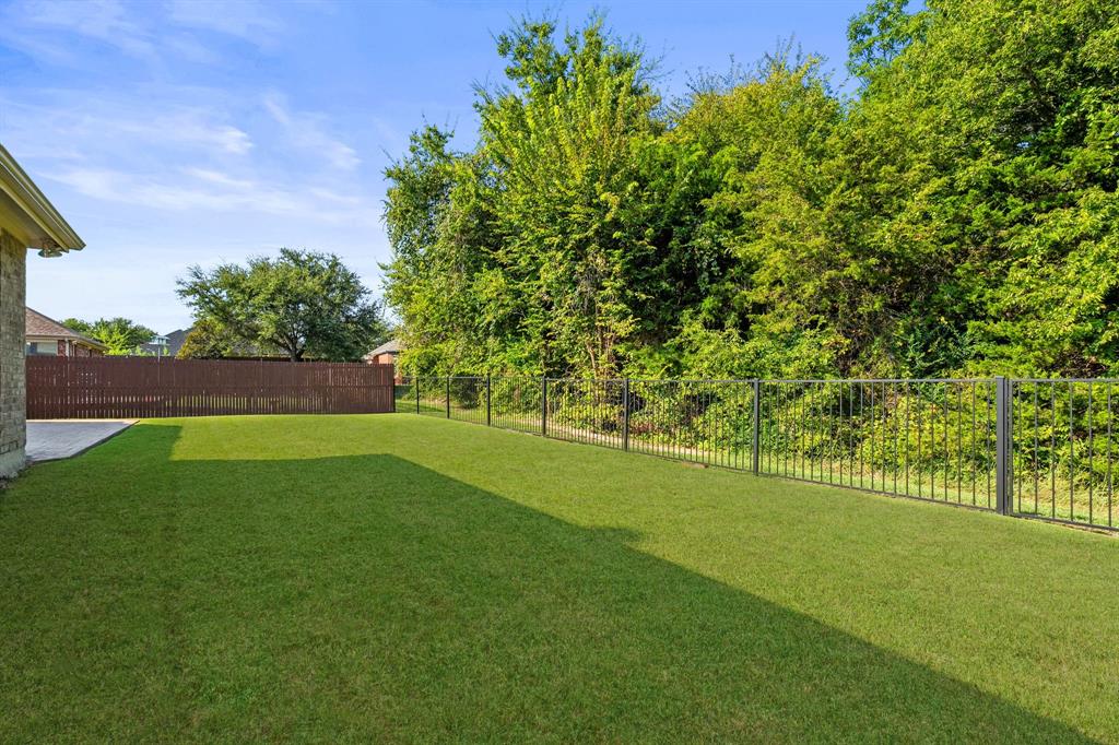 ONE OF A KIND! Come and chill in the PRIVATE BACKYARD that backs up to gorgeous TREES. You won't want to leave! Fantastic ONE-STORY home with beautiful updates throughout including gorgeous WOOD FLOORING, carpet, plantation shutters through the home, interior & exterior paint, newer tile flooring, & crown molding. The elegant entryway opens to the formal living & dining rooms. Spacious family room with a beautiful stone fireplace. Kitchen features corian counters, beautiful wood cabinetry, & a breakfast area with window seats. Owners retreat has a decorative tray ceiling & ensuite bath with JETTED TUB, dual sinks, separate shower, & walk-in closet. 3 secondary bedrooms - 1 can be a fantastic STUDY. Instant hot water recirculator. Enjoy the greenbelt views from the kitchen, breakfast, living, & owners retreat. Relax on the extended stained stamped concrete patio while enjoying nature. Iron fence across the back for unobstructed views. Garage has a work area with sink. New AC, compressor, & furnace in 2024, NEW ROOF in 2025. Community pool & sports courts close by. Wylie ISD!
