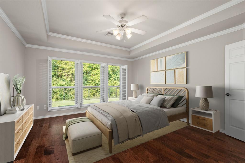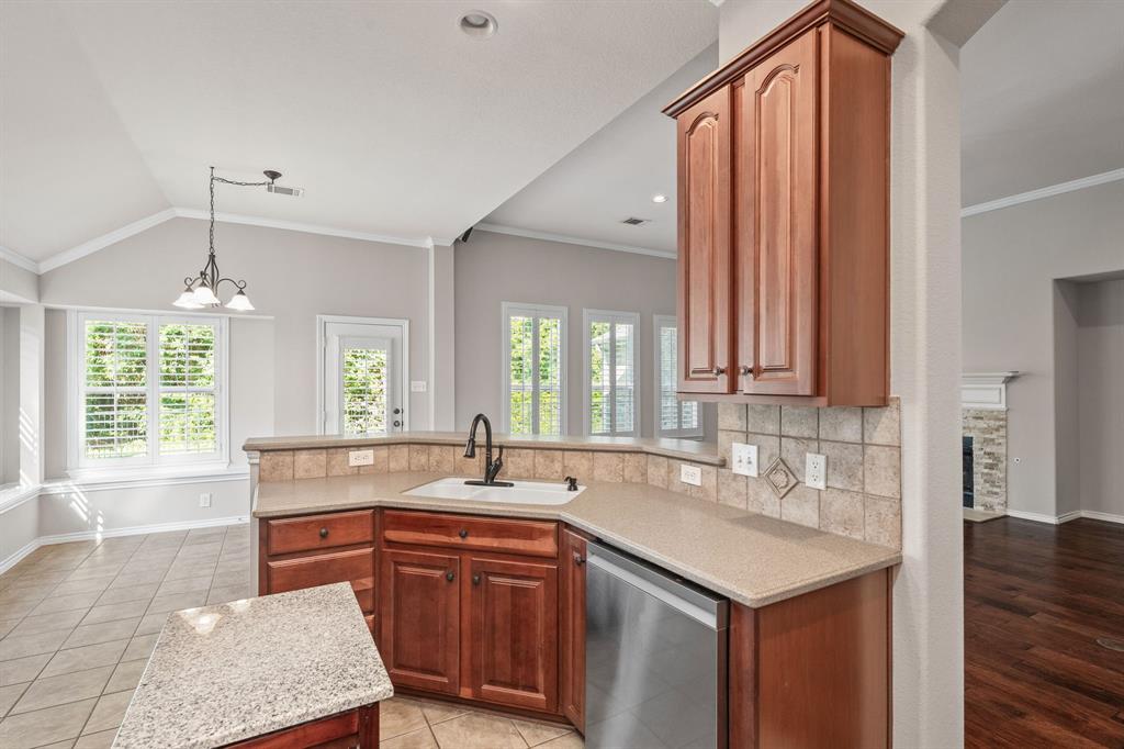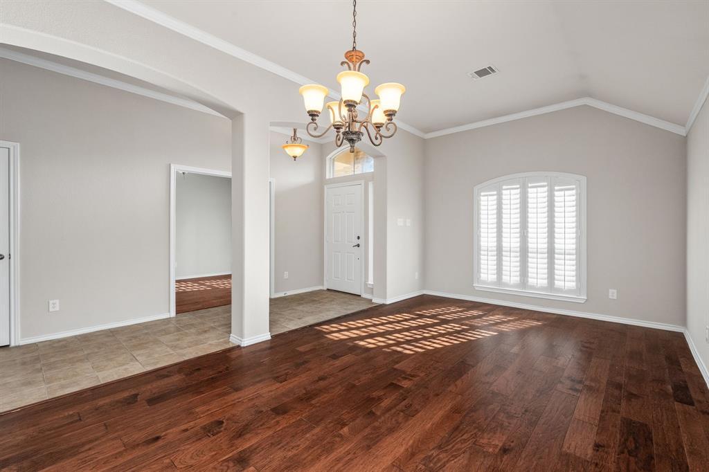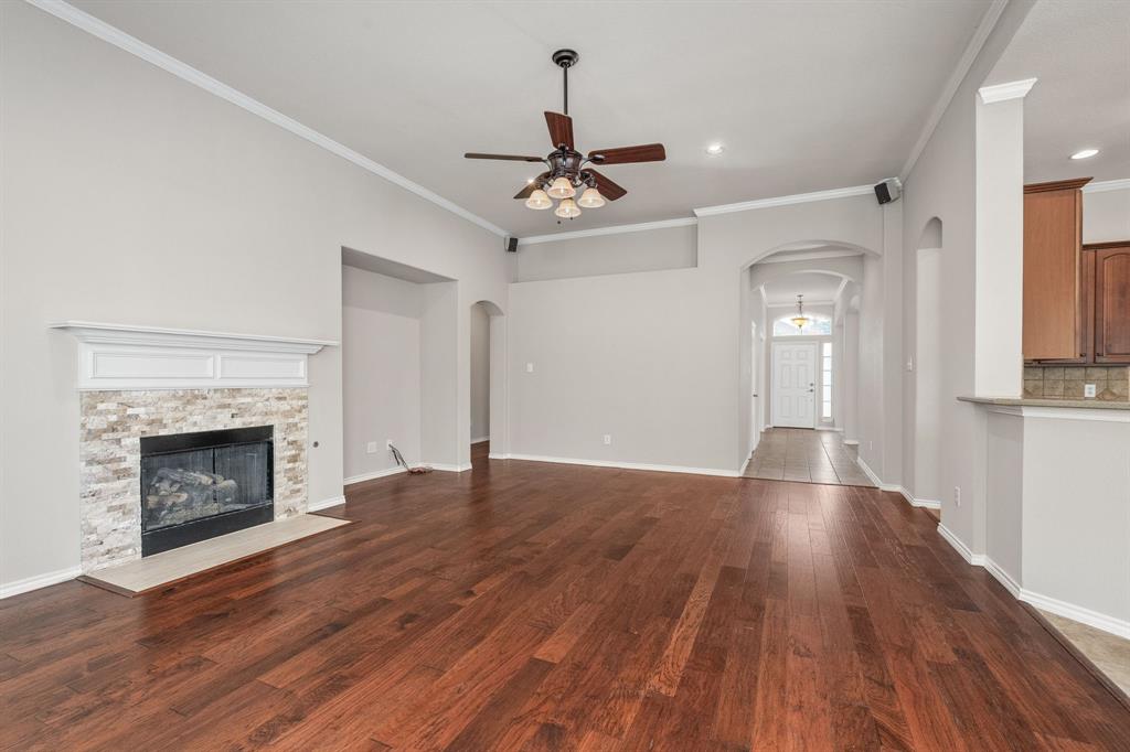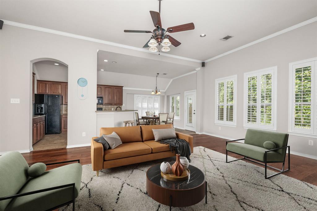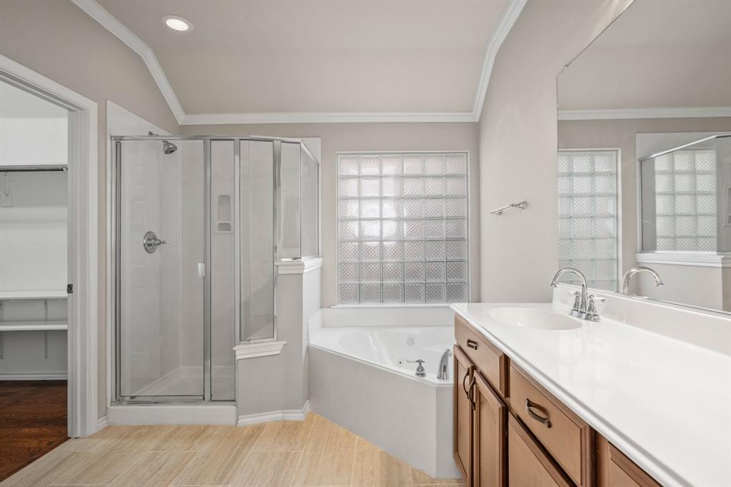 ONE OF A KIND! Come and chill in the PRIVATE BACKYARD that backs up to gorgeous TREES. You won't want to leave! Fantastic ONE-STORY home with beautiful updates throughout including gorgeous WOOD FLOORING, carpet, plantation shutters through the home, interior & exterior paint, newer tile flooring, & crown molding. The elegant entryway opens to the formal living & dining rooms. Spacious family room with a beautiful stone fireplace. Kitchen features corian counters, beautiful wood cabinetry, & a breakfast area with window seats. Owners retreat has a decorative tray ceiling & ensuite bath with JETTED TUB, dual sinks, separate shower, & walk-in closet. 3 secondary bedrooms - 1 can be a fantastic STUDY. Instant hot water recirculator. Enjoy the greenbelt views from the kitchen, breakfast, living, & owners retreat. Relax on the extended stained stamped concrete patio while enjoying nature. Iron fence across the back for unobstructed views. Garage has a work area with sink. New AC, compressor, & furnace in 2024, NEW ROOF in 2025. Community pool & sports courts close by. Wylie ISD!
