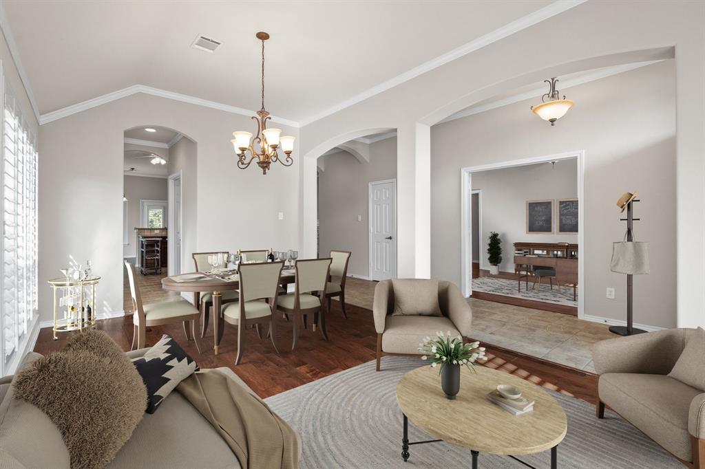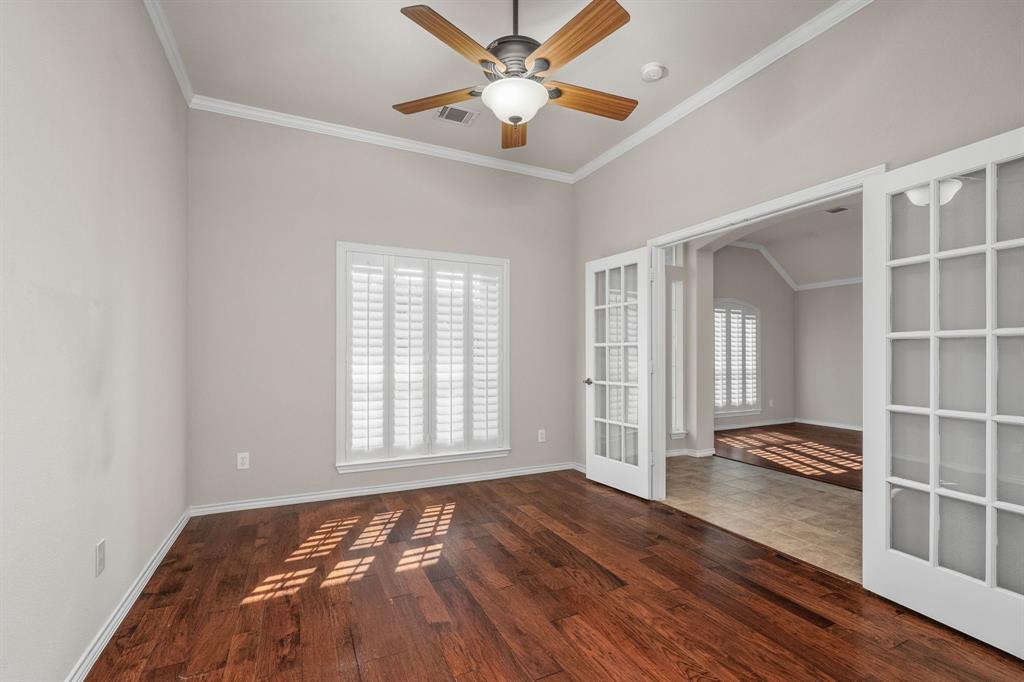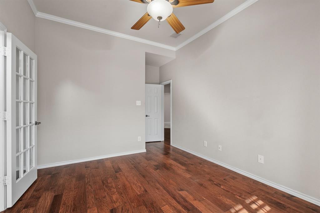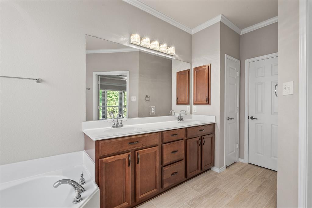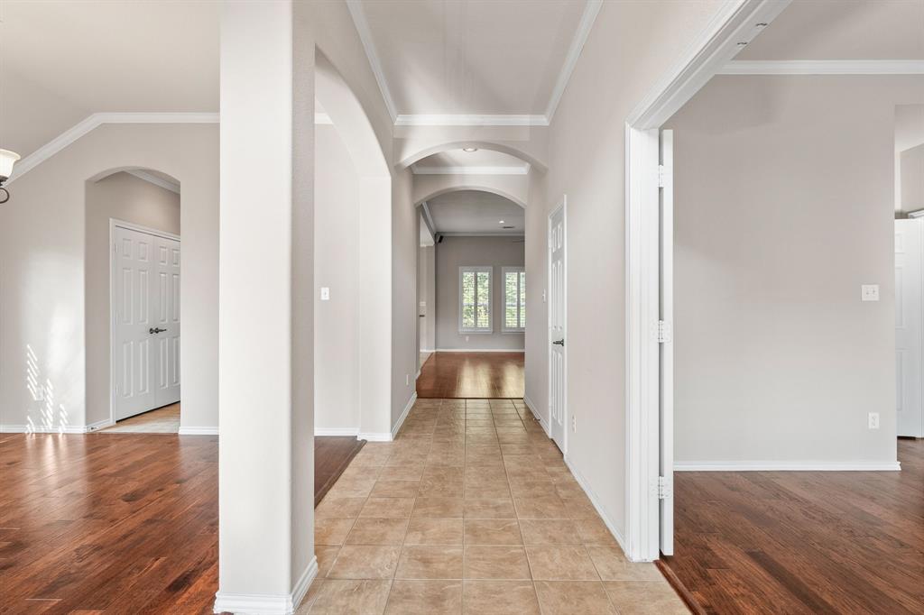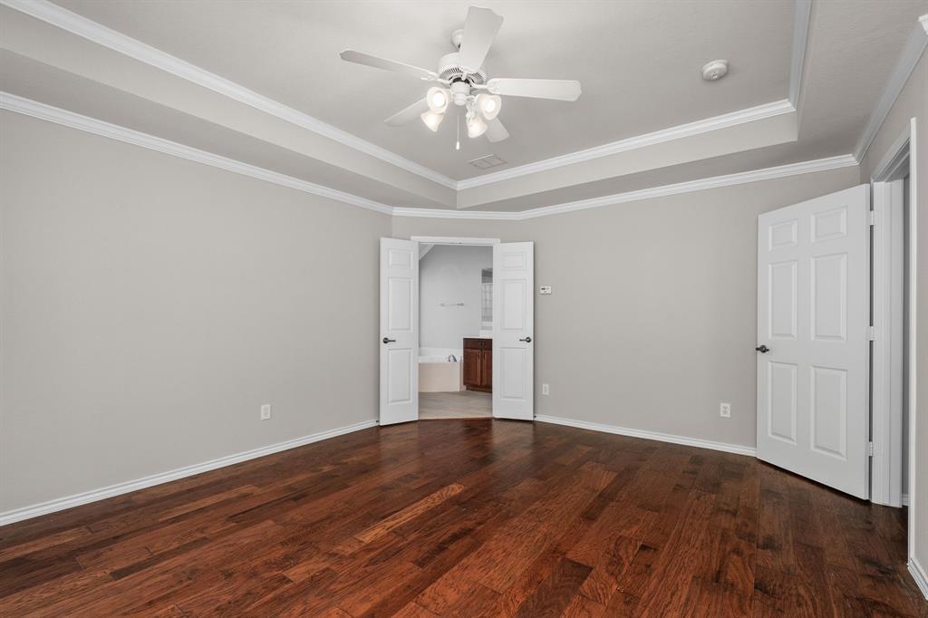ONE OF A KIND! Come and chill in the PRIVATE BACKYARD that backs up to gorgeous TREES. You won't want to leave! Fantastic ONE-STORY home with beautiful updates throughout including gorgeous WOOD FLOORING, carpet, plantation shutters through the home, interior & exterior paint, newer tile flooring, & crown molding. The elegant entryway opens to the formal living & dining rooms. Spacious family room with a beautiful stone fireplace. Kitchen features corian counters, beautiful wood cabinetry, & a breakfast area with window seats. Owners retreat has a decorative tray ceiling & ensuite bath with JETTED TUB, dual sinks, separate shower, & walk-in closet. 3 secondary bedrooms - 1 can be a fantastic STUDY. Instant hot water recirculator. Enjoy the greenbelt views from the kitchen, breakfast, living, & owners retreat. Relax on the extended stained stamped concrete patio while enjoying nature. Iron fence across the back for unobstructed views. Garage has a work area with sink. New AC, compressor, & furnace in 2024, NEW ROOF in 2025. Community pool & sports courts close by. Wylie ISD!