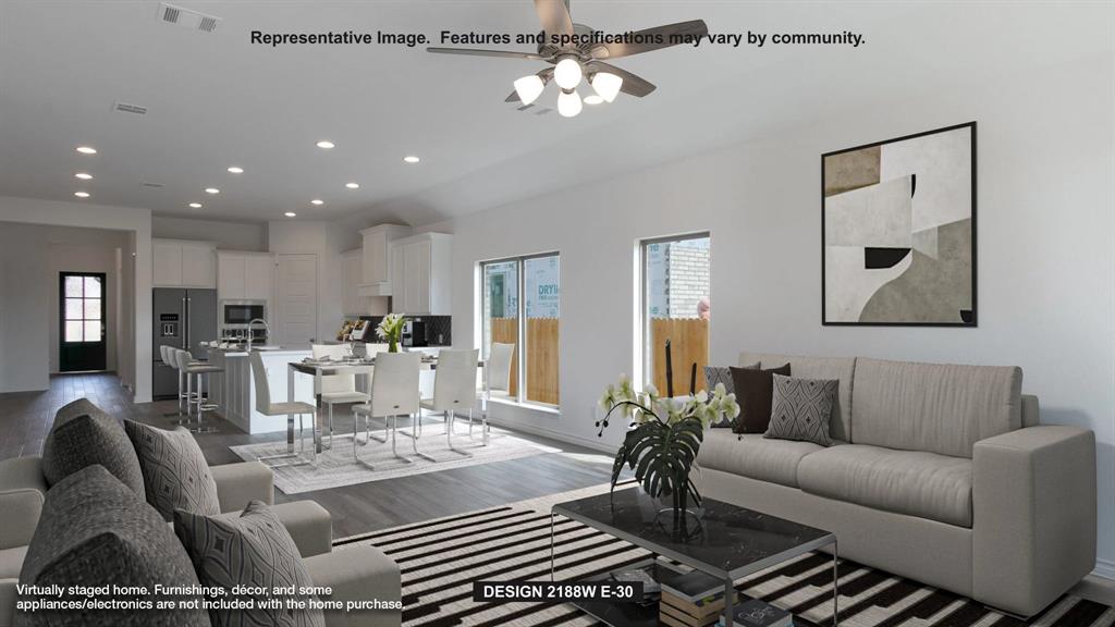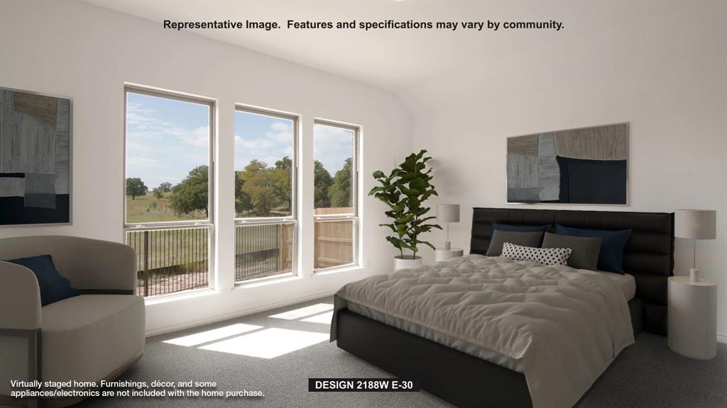 Extended entry with 12-foot ceiling leads to open kitchen, dining area and family room with 10-foot ceilings throughout. Kitchen features corner walk-in pantry, 5-burner gas cooktop and generous island with built-in seating space. Family room features a wood mantel fireplace and wall of windows. Primary suite with 10-foot ceiling and wall of windows. Dual vanities, garden tub, separate glass-enclosed shower and large walk-in closet in primary bath. A Hollywood bathroom connects to bedrooms three and four. All bedrooms feature walk-in closets. Covered backyard patio. Mud room off two-car garage.