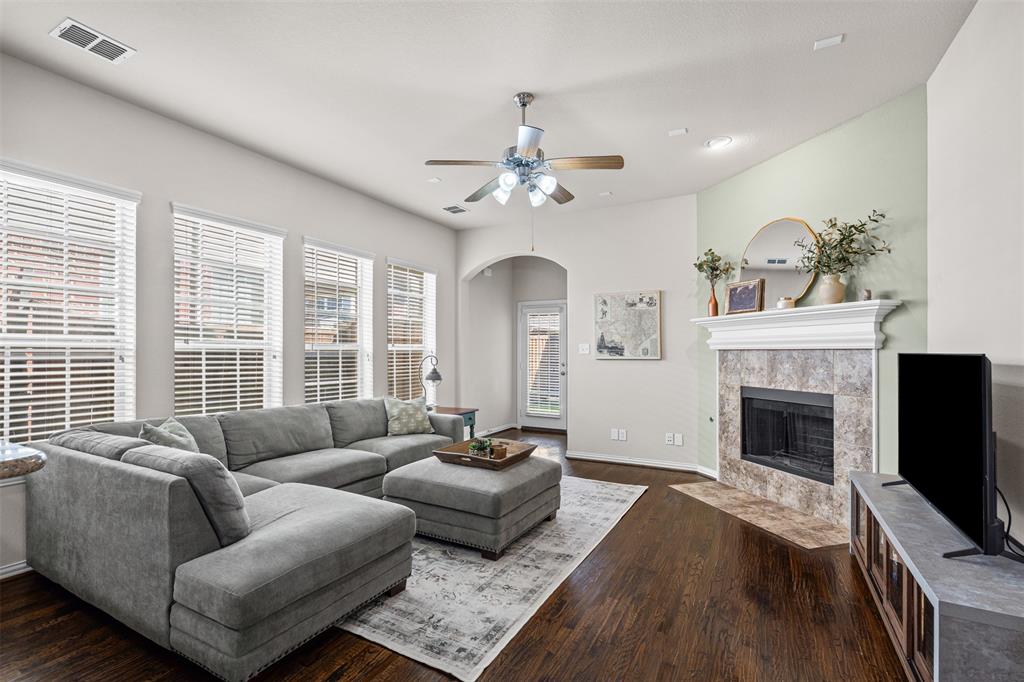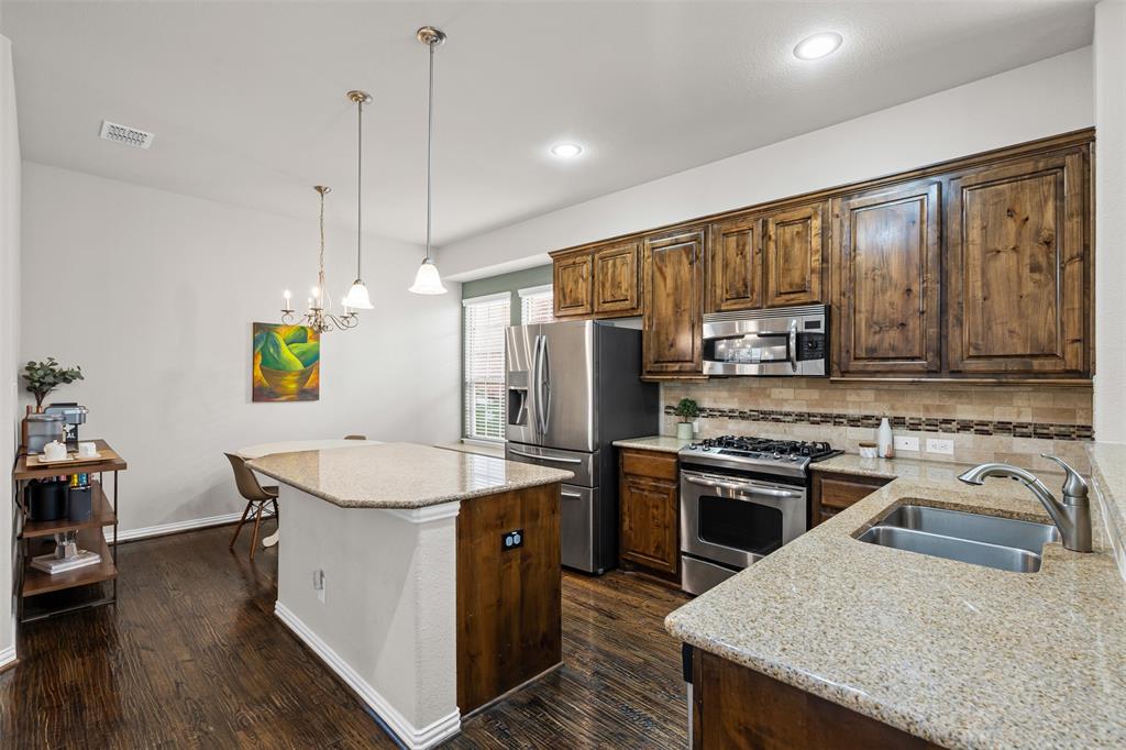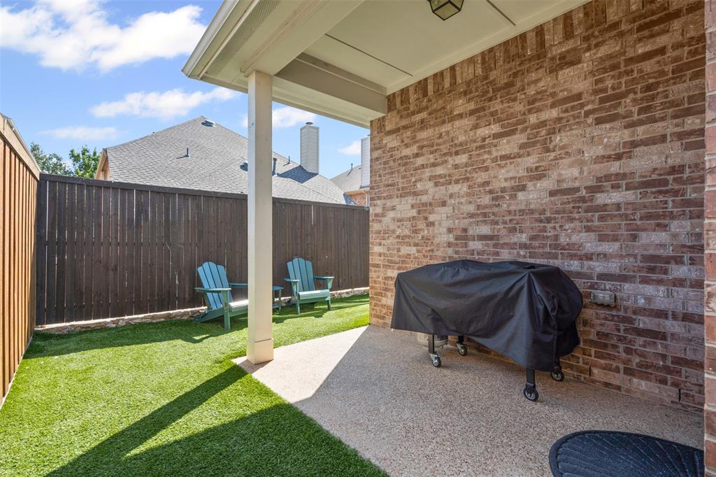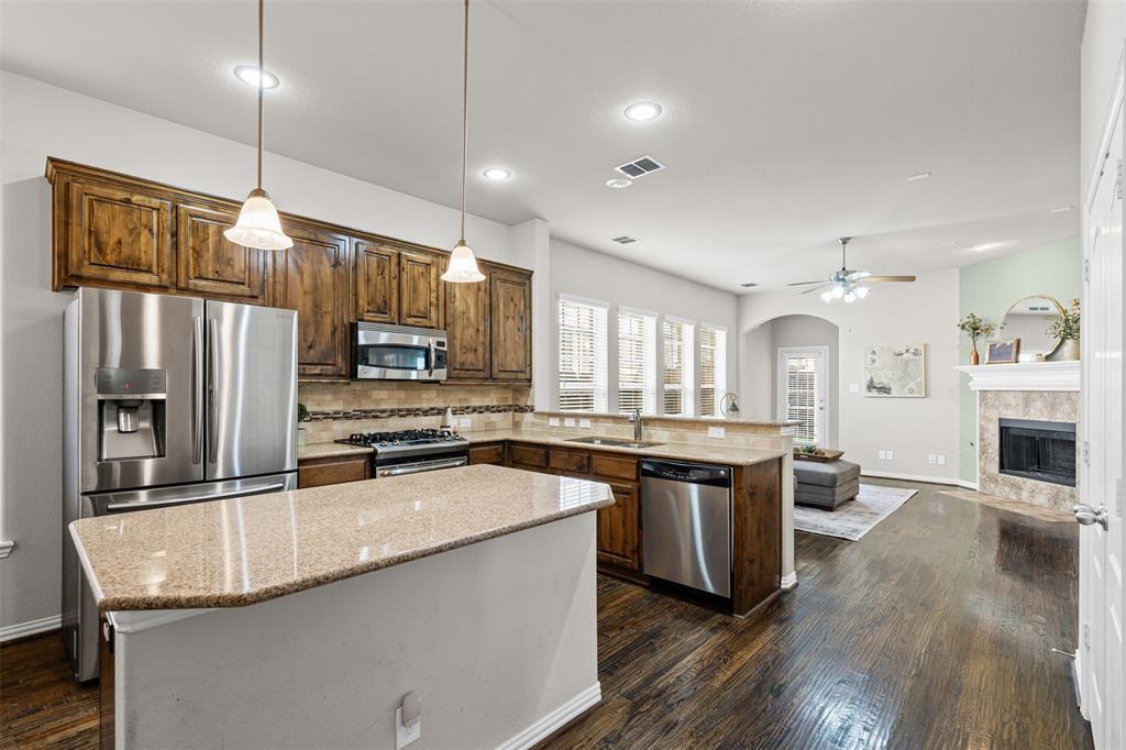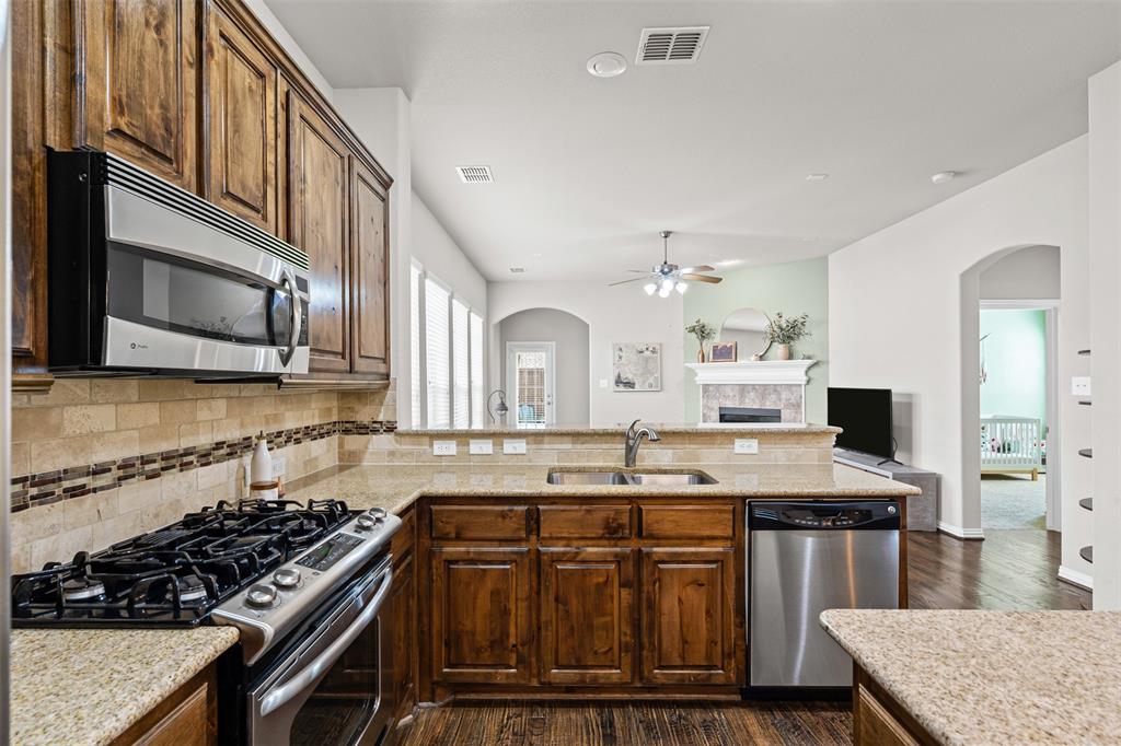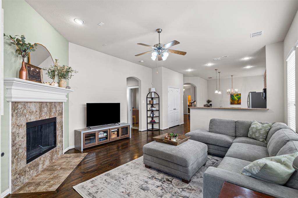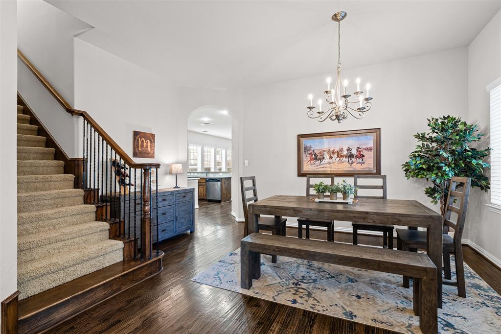 Discover this charming Green Built home by David Weekley, featuring a 1.5-story floor plan with incredible curb appeal. This delightful residence offers 3 bedrooms and 3 full baths, a formal dining room, and a separate kitchen nook. The upstairs game room and covered porches provide ample space for relaxation and entertainment. The backyard is a low-maintenance oasis, boasting artificial turf and rocks in the side yard—perfect for kids and pets—and transforming the space into a patio-like retreat. The island kitchen is a chef's dream, equipped with stainless steel GE appliances, a custom backsplash, a gas range, and elegant granite countertops with custom cabinetry. Recent upgrades in 2024 include enhancements to the laundry room and master bath. The downstairs area features stunning hand-scraped hardwood floors, sound system wiring, a cozy gas fireplace, and neutral colors throughout. The staircase is elegantly designed with rounded corners and wrought iron spindles. The open-flow floor plan is ideal for hosting, with comfortable seating options including a breakfast nook, dining room, and six countertop dining spots—two at counter height on the island and four at stadium height behind the sink. The spacious upstairs game room is perfect for watch parties, complete with a full bath. Aesthetically pleasing with its stained carriage garage door, this home is conveniently located within a short walk to new shopping and dining at Castle Hills Drive and 121, and less than a 10-minute drive to Grandscape and just over 10 minutes to Legacy.