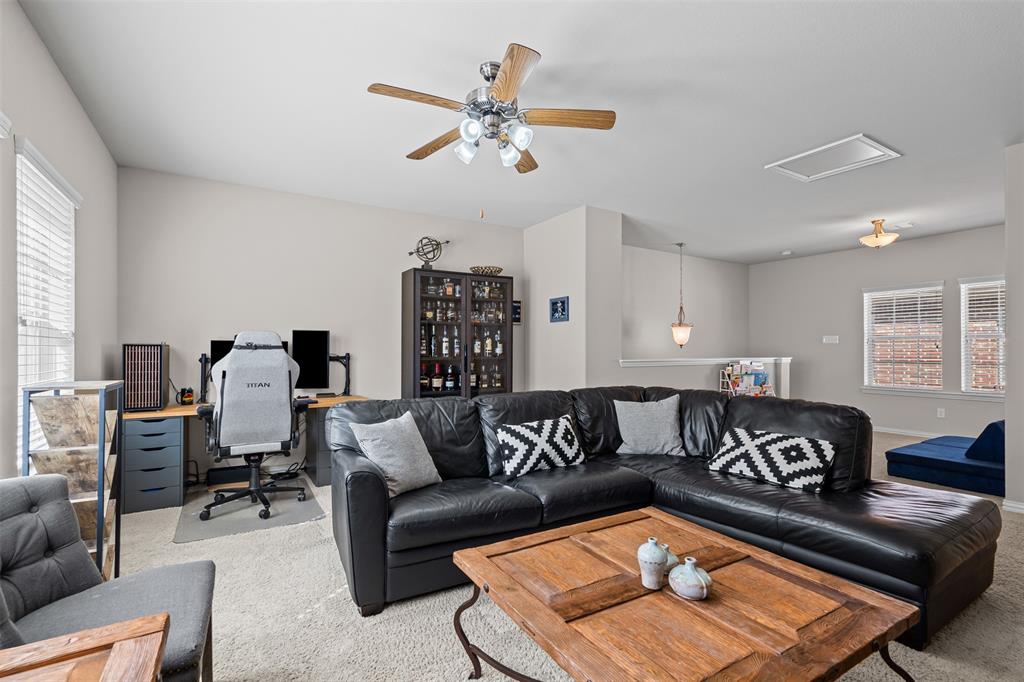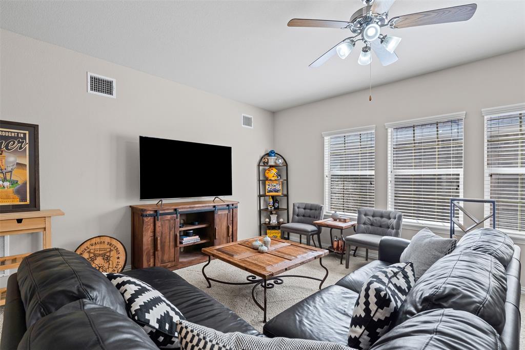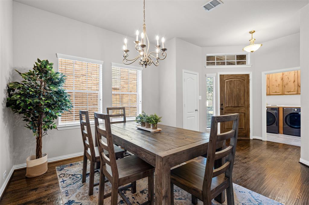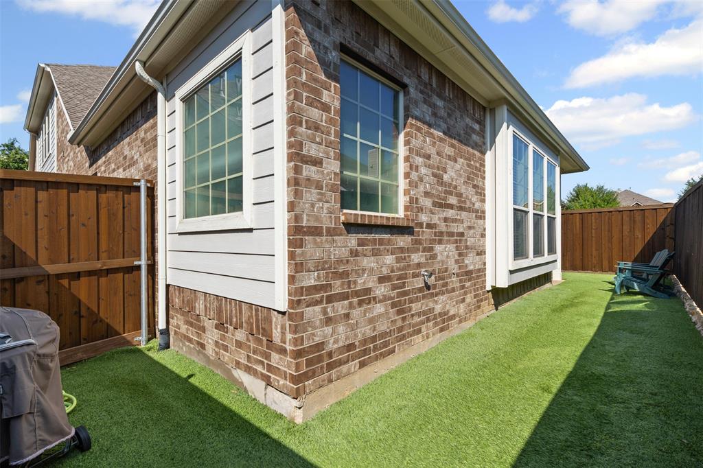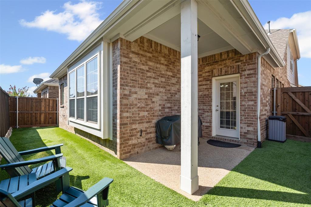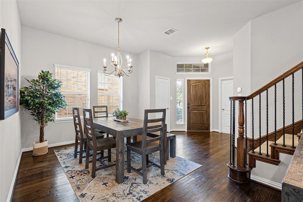 Discover this charming Green Built home by David Weekley, featuring a 1.5-story floor plan with incredible curb appeal. This delightful residence offers 3 bedrooms and 3 full baths, a formal dining room, and a separate kitchen nook. The upstairs game room and covered porches provide ample space for relaxation and entertainment. The backyard is a low-maintenance oasis, boasting artificial turf and rocks in the side yard—perfect for kids and pets—and transforming the space into a patio-like retreat. The island kitchen is a chef's dream, equipped with stainless steel GE appliances, a custom backsplash, a gas range, and elegant granite countertops with custom cabinetry. Recent upgrades in 2024 include enhancements to the laundry room and master bath. The downstairs area features stunning hand-scraped hardwood floors, sound system wiring, a cozy gas fireplace, and neutral colors throughout. The staircase is elegantly designed with rounded corners and wrought iron spindles. The open-flow floor plan is ideal for hosting, with comfortable seating options including a breakfast nook, dining room, and six countertop dining spots—two at counter height on the island and four at stadium height behind the sink. The spacious upstairs game room is perfect for watch parties, complete with a full bath. Aesthetically pleasing with its stained carriage garage door, this home is conveniently located within a short walk to new shopping and dining at Castle Hills Drive and 121, and less than a 10-minute drive to Grandscape and just over 10 minutes to Legacy.