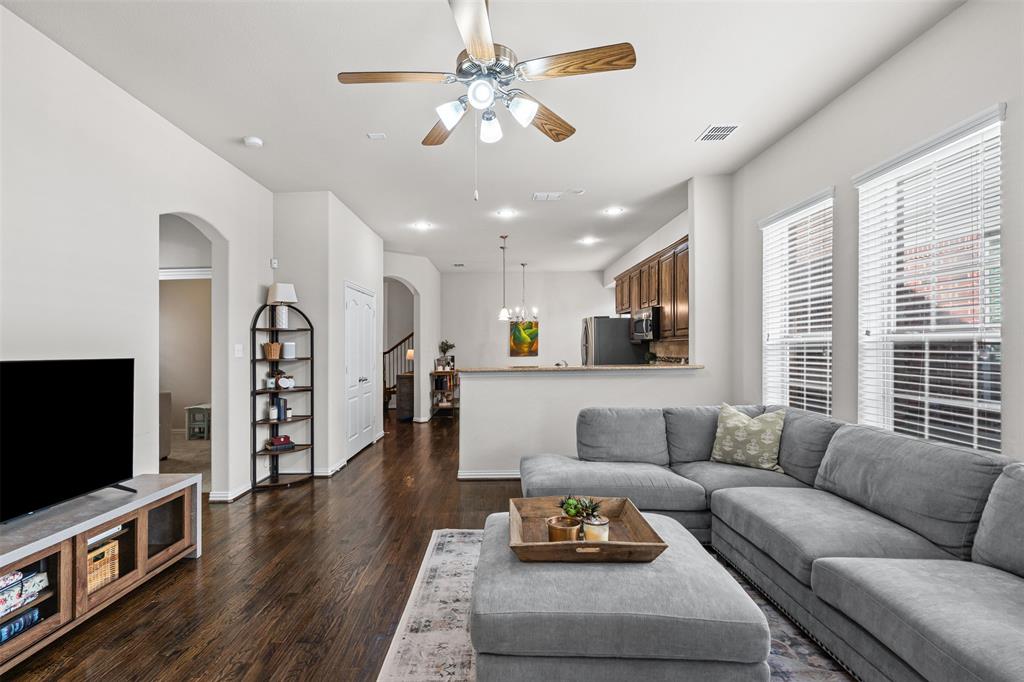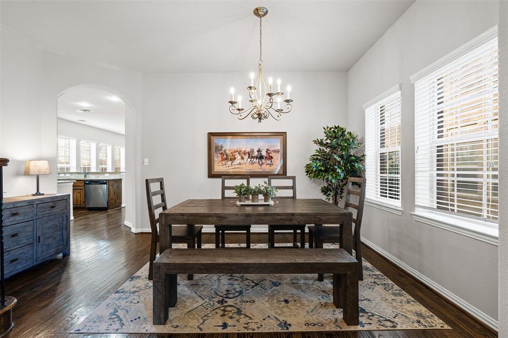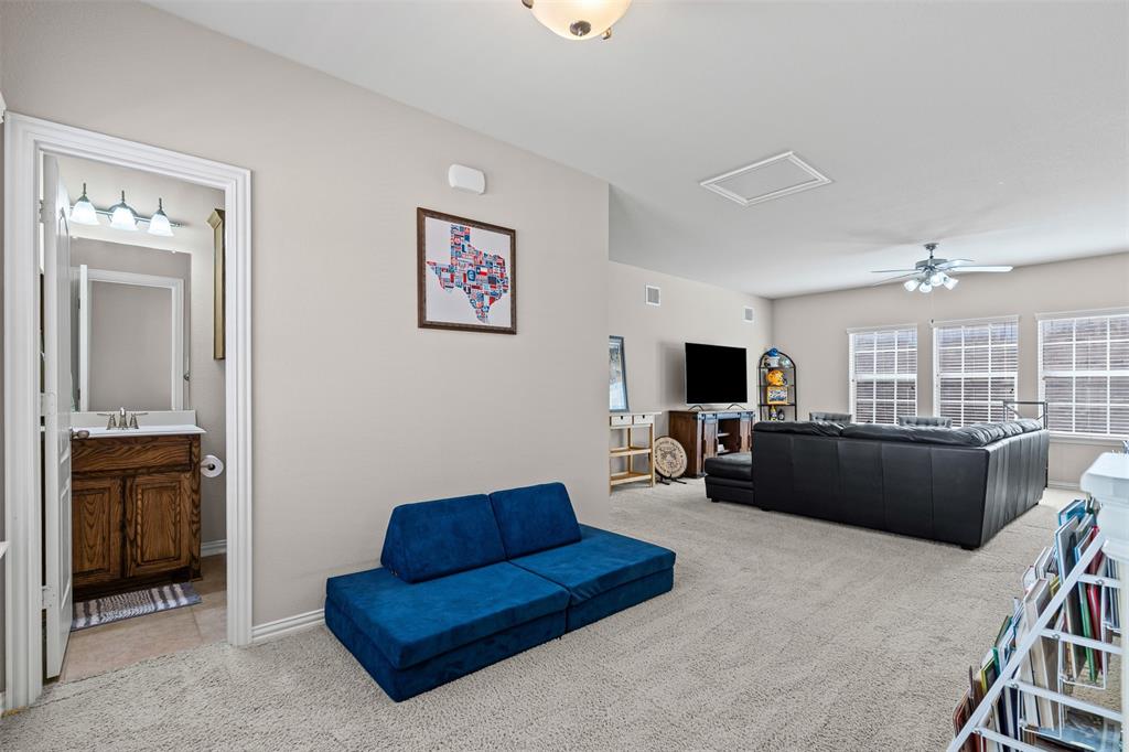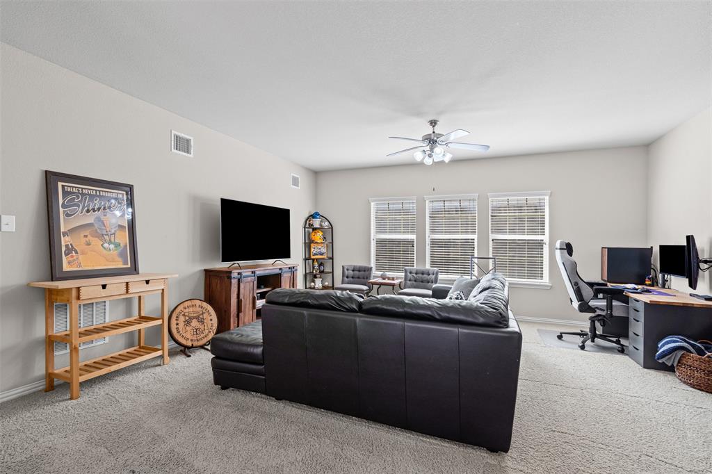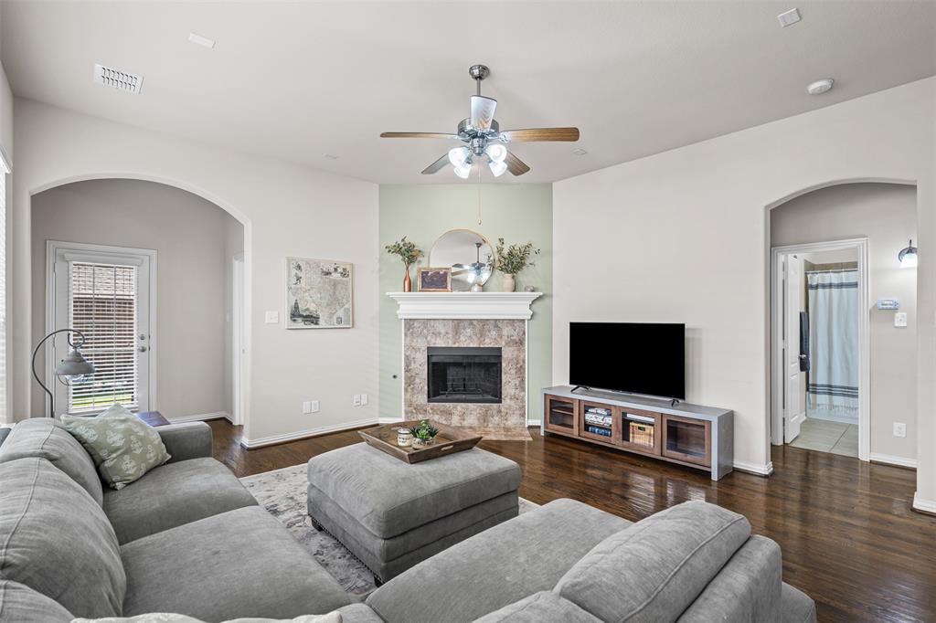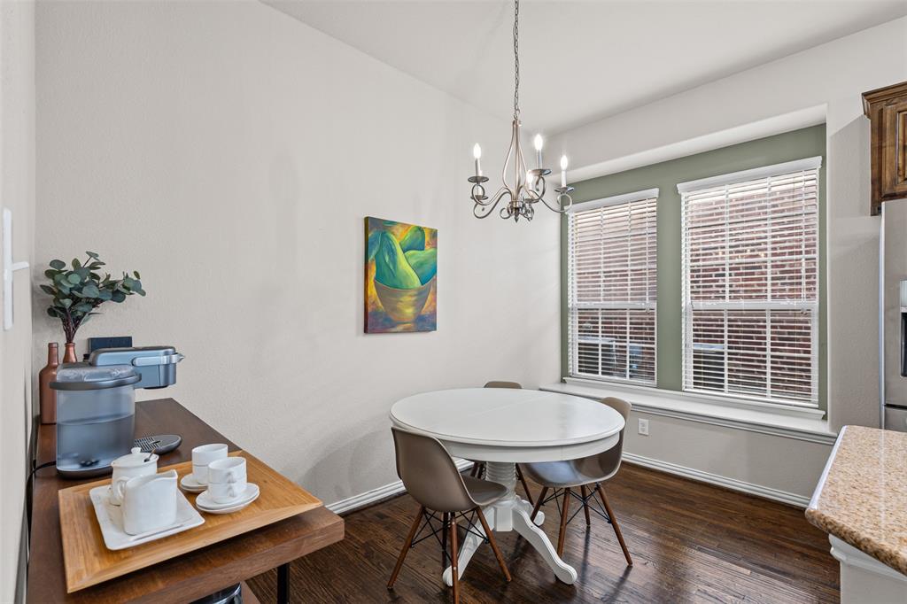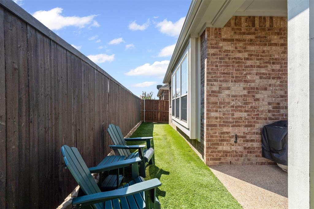 Discover this charming Green Built home by David Weekley, featuring a 1.5-story floor plan with incredible curb appeal. This delightful residence offers 3 bedrooms and 3 full baths, a formal dining room, and a separate kitchen nook. The upstairs game room and covered porches provide ample space for relaxation and entertainment. The backyard is a low-maintenance oasis, boasting artificial turf and rocks in the side yard—perfect for kids and pets—and transforming the space into a patio-like retreat. The island kitchen is a chef's dream, equipped with stainless steel GE appliances, a custom backsplash, a gas range, and elegant granite countertops with custom cabinetry. Recent upgrades in 2024 include enhancements to the laundry room and master bath. The downstairs area features stunning hand-scraped hardwood floors, sound system wiring, a cozy gas fireplace, and neutral colors throughout. The staircase is elegantly designed with rounded corners and wrought iron spindles. The open-flow floor plan is ideal for hosting, with comfortable seating options including a breakfast nook, dining room, and six countertop dining spots—two at counter height on the island and four at stadium height behind the sink. The spacious upstairs game room is perfect for watch parties, complete with a full bath. Aesthetically pleasing with its stained carriage garage door, this home is conveniently located within a short walk to new shopping and dining at Castle Hills Drive and 121, and less than a 10-minute drive to Grandscape and just over 10 minutes to Legacy.