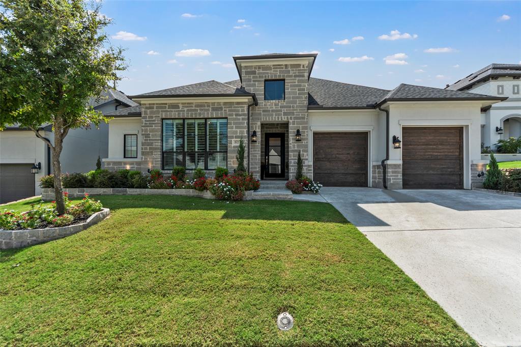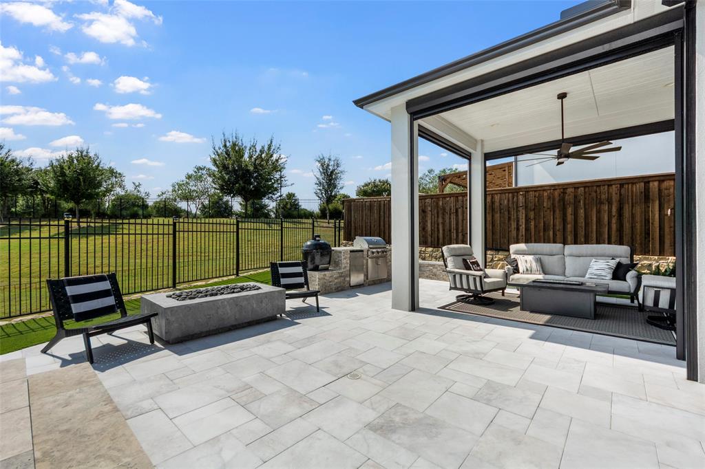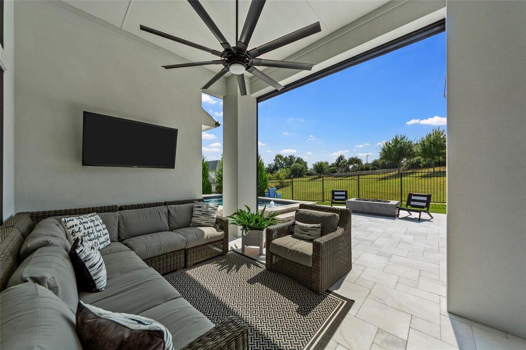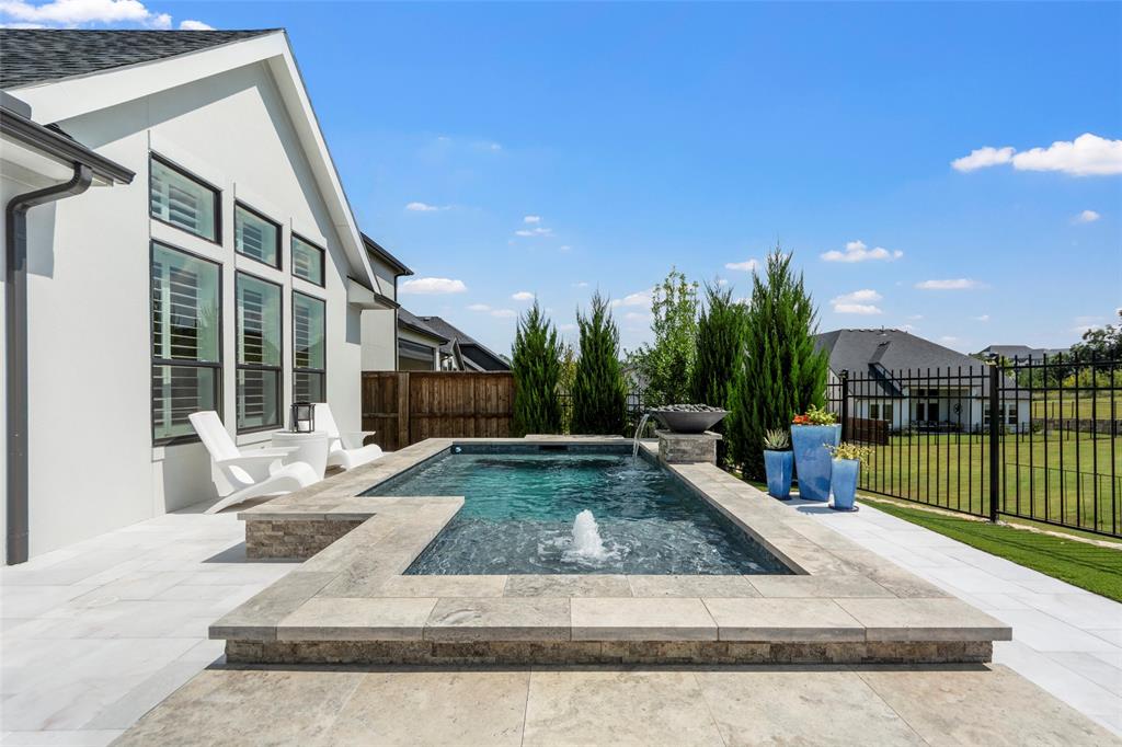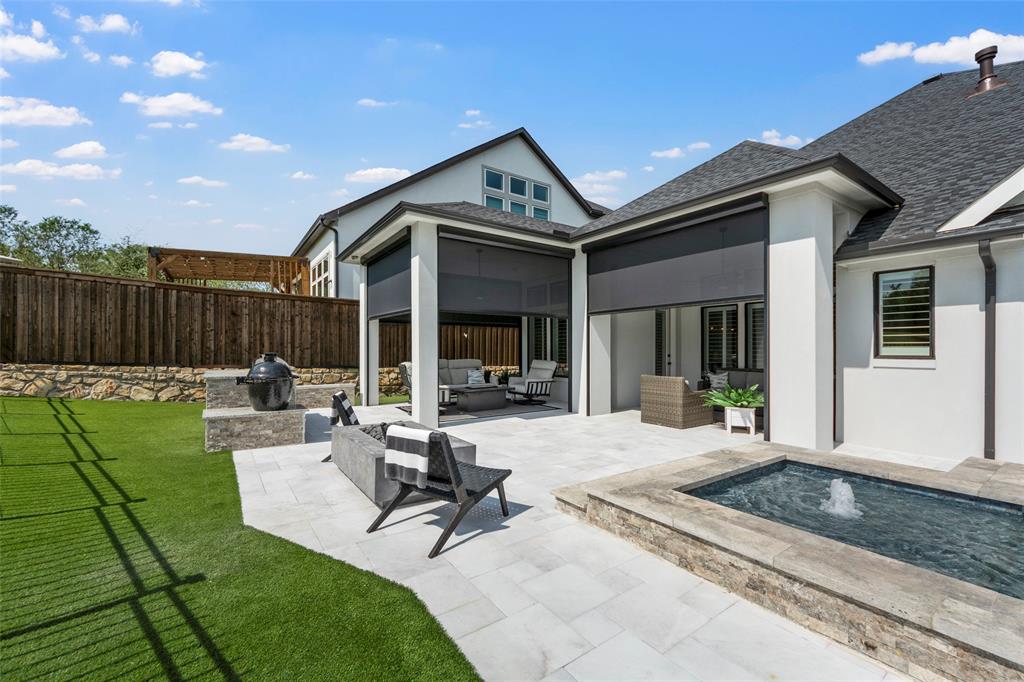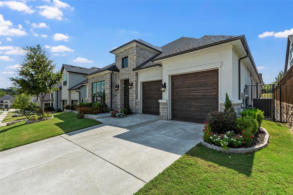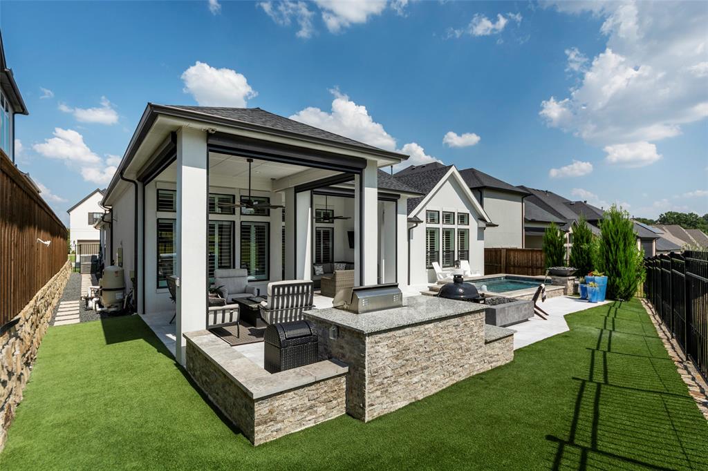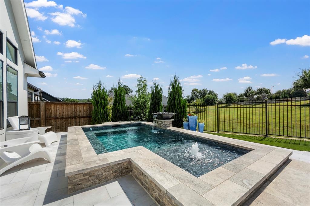Luxury Living at its best! STUNNING North-East facing ONE STORY home built by Toll Brothers, in the boutique GATED community of Paradiso Valle of coveted Stonebridge Ranch. This owner has added so many high-end designer touches to this home, making OVER $300K in UPGRADES done AFTER MOVE-IN. BACKYARD OASIS with resort-style sparkling pool-spa, extended covered patio with motorized solar screens, outdoor grill, gas firepit, and easy-care turfed backyard. Property overlooks a greenspace that is HOA maintained. Only built in 2022, this home is like new without the wait & move-in ready! Lush landscaping and a modern curb appeal say 'Welcome Home'! As you enter, you are greeted by the inviting foyer with custom built-in mud space & soaring ceilings. The large living room features a striking floor-to-ceiling fireplace with custom built-in cabinets and floating shelves on either side. This open concept floor plan of the living rom to the kitchen & the outdoor space makes this home perfect for entertaining. Chef's kitchen with expansive island, quartz countertops, gorgeous backsplash, gas cooktop with stainless steel appliances, coffee bar, large dining area and walk-in pantry. Not a detail was missed - from the plantation shutters on every window, to the Restoration Hardware lighting fixtures adding touches of style & elegance. Executive office with wood beam accents & French doors makes for a great flex living space 5th bedroom. Large media room ready for movie nights or binge watching your favorite show. Private primary suite overlooking the stunning yard with spa-inspired ensuite bathroom - HUGE walk-in shower with dual shower heads & frameless glass, dual sinks, soaker tub, and large closet. Spacious secondary bedrooms. Garage with electric vehicle charger, epoxy flooring, and tons of enclosed wall storage built-ins & hanging shelves. This gorgeous home is a MUST SEE! Check out stonebridgeranch.com for all the amazing amenities this community has to offer.