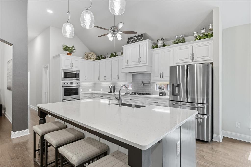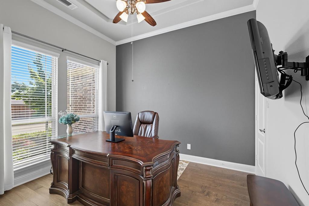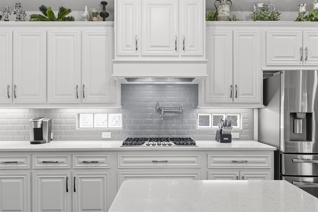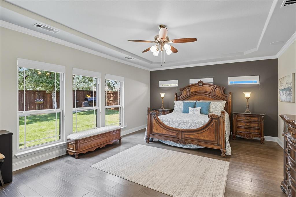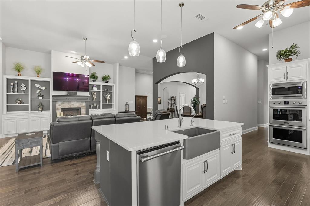 Welcome to your dream home in the highly sought-after Valencia subdivision in Corinth, TX! This beautifully designed, single-story residence offers the perfect blend of comfort, elegance, and functionality. With 3 spacious bedrooms, 3 full bathrooms, an additional powder bath, a study (that could be a 4th bedroom!) and an amazing outdoor patio there’s plenty of room for both everyday living and entertaining guests. Step inside to discover an open floor plan that creates a seamless flow between the living, dining, and kitchen areas—ideal for modern lifestyles – with engineered wood floors throughout the home and carpet in only the secondary bedrooms and primary suite closets. The gourmet kitchen is a true showstopper, featuring stunning quartz countertops, a farmhouse sink, generous cabinet space, a gas cooktop with a pot filler, walk-in pantry and high-end finishes that will impress any home chef. The inviting living area with fireplace is the perfect spot to relax with plenty of room for family and friends. The oversized primary suite has to be seen to be believed with an ensuite bathroom that has a large shower, double vanities and two walk-in closets! The split bedroom layout ensures privacy for all bedrooms. The heart of the home opens up to an incredible covered outdoor living area—complete with an outdoor kitchen, a cozy fireplace and sunshades—perfect for year-round entertaining, relaxing evenings, or weekend gatherings. The 3-car garage provides ample storage and parking. This home is smart - the Savant Home app offers a control center for many features in the home! Located in the picturesque Valencia community, this home offers upscale living in a central location with easy access to local amenities, schools, shopping and dining. Don’t miss your chance to own this exceptional property!