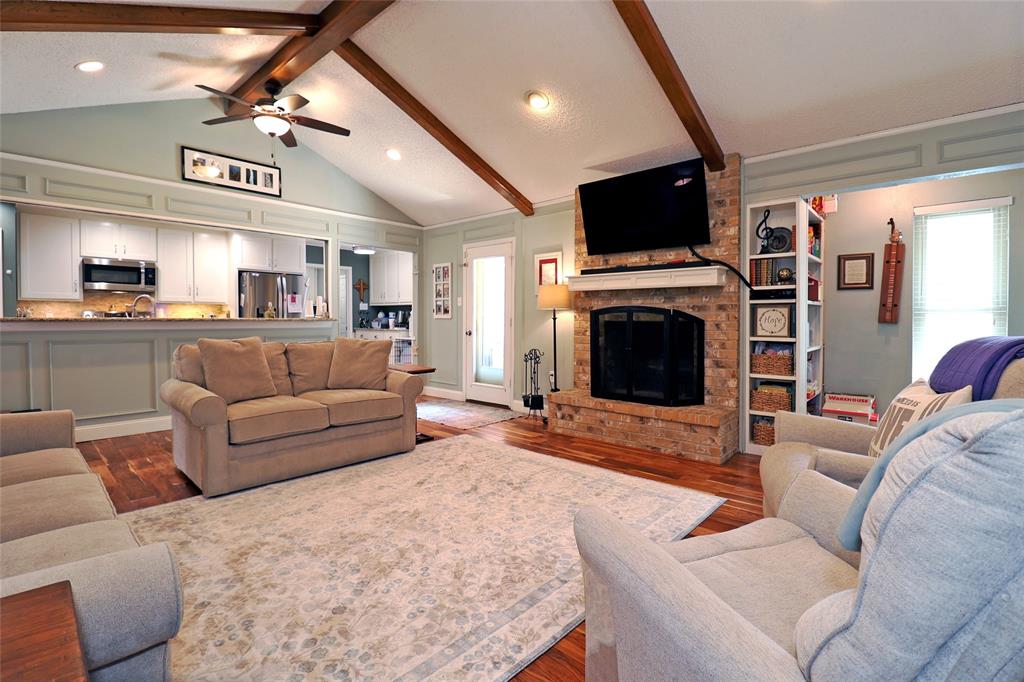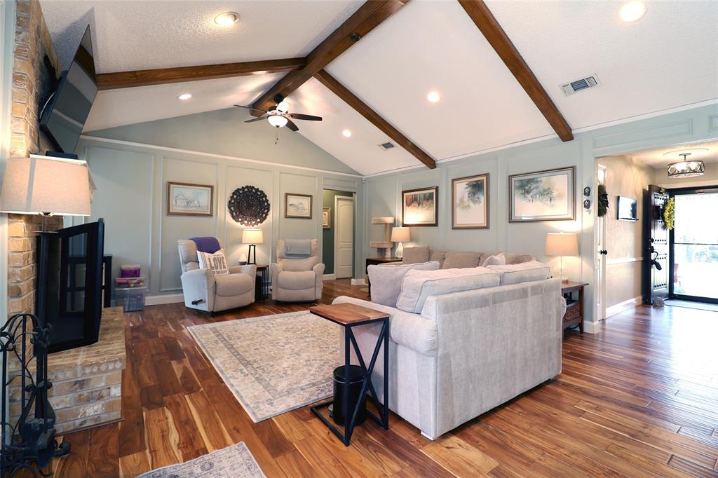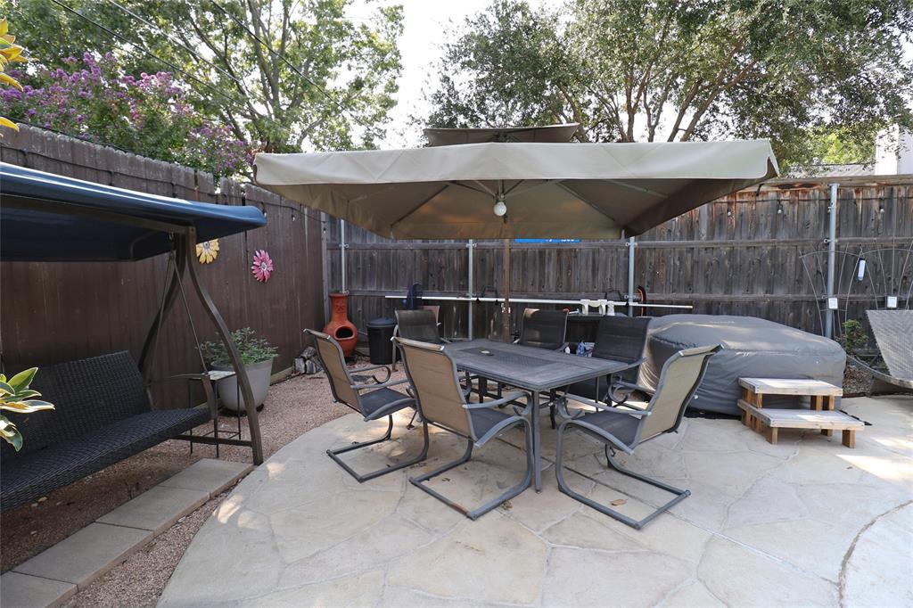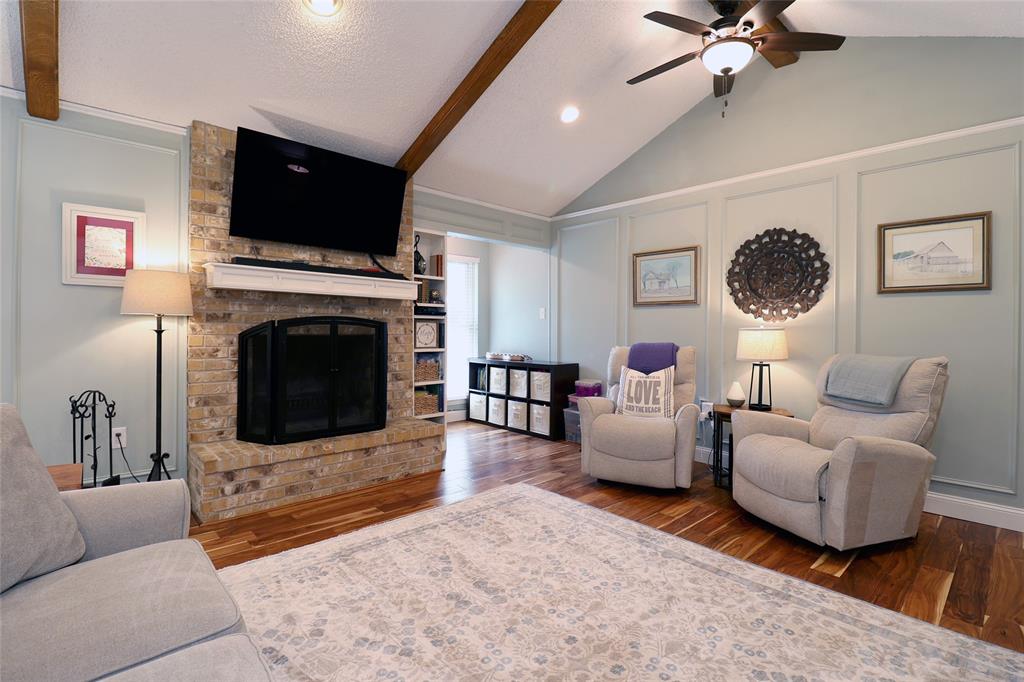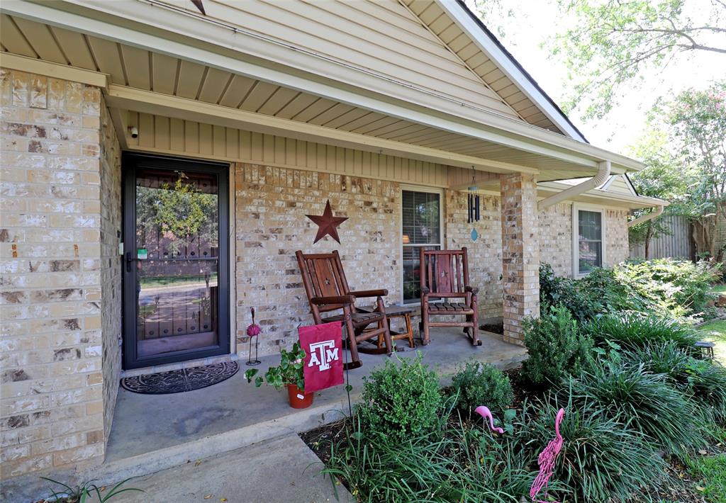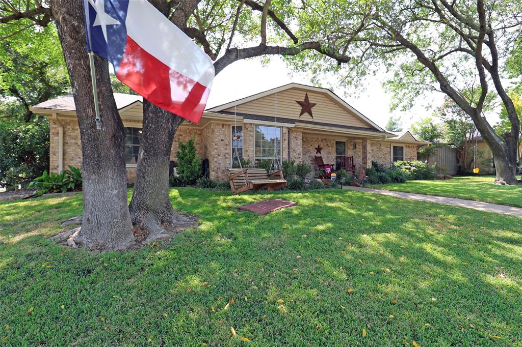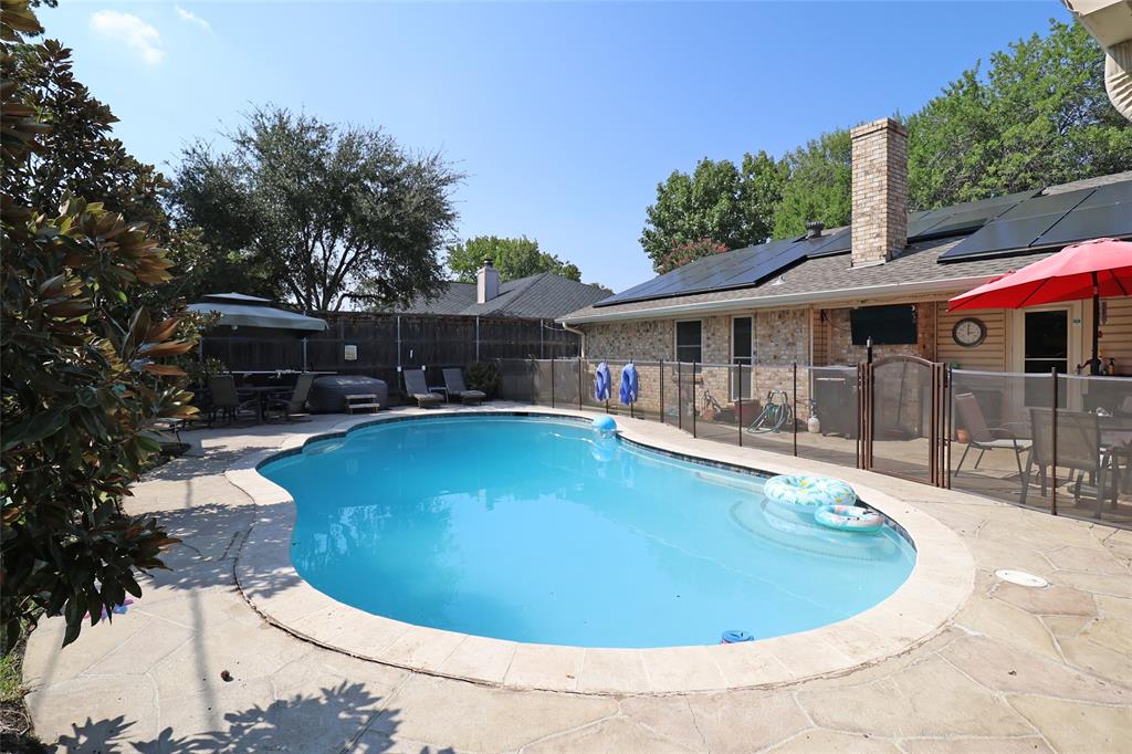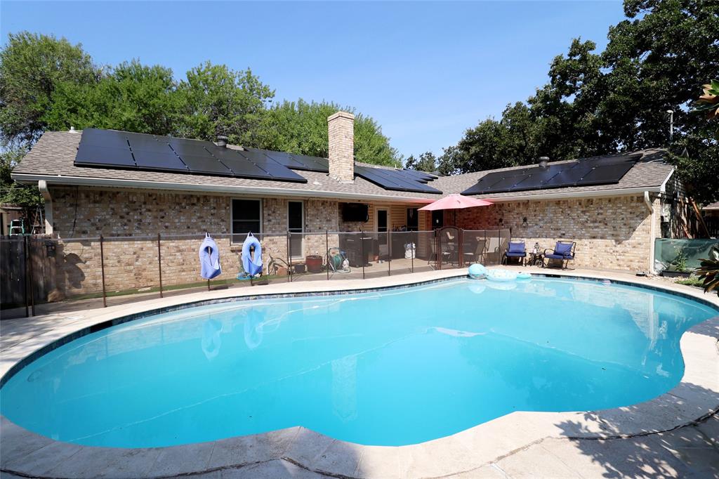 Welcome Home to the Neighborhood You've Dreamed Of - A place where kids grow up together, running & playing freely! Step into this beautifully maintained 4 bed, 2 bath home with a sparkling in-ground pool. The living room welcomes you with vaulted ceilings and exposed beams, a cosy wood-burning fireplace, and stunning Acacia engineered wood flooring throughout the main areas. The formal dining room features a tray ceiling and bay windows creating an elegant space for entertaining. The kitchen features include granite countertops, Shaker-style cabinetry, granite counters, a breakfast bar, & a convenient coffee station. The primary suite is a true retreat boasting of an updated bath with separate vanities, one with a makeup station, granite countertops, a walk in shower with travertine tile & granite bench, and a large walk-in closet with custom Elfa shelving. Secondary bedrooms are spacious, two of which have walk-in closets. Entire home has 4-stage reverse osmosis whole home water filtration system, water softener & sediment filter system & Fully owned paid off solar panels for energy efficiency! Home also features a built in Tornado Shelter in the garage. Step outside & host unforgettable gatherings in your private backyard oasis, complete with covered patio & inviting pool (resurfaced in 2019) with turf & dog run, and removable safety fence and gate for pool. On top of that the roof was replaced in 2020! This home has it ALL - comfort, efficiency, timeless style & a true community! A short walk away from River Legacy Park, Dunlop Park, and Butler Elementary.