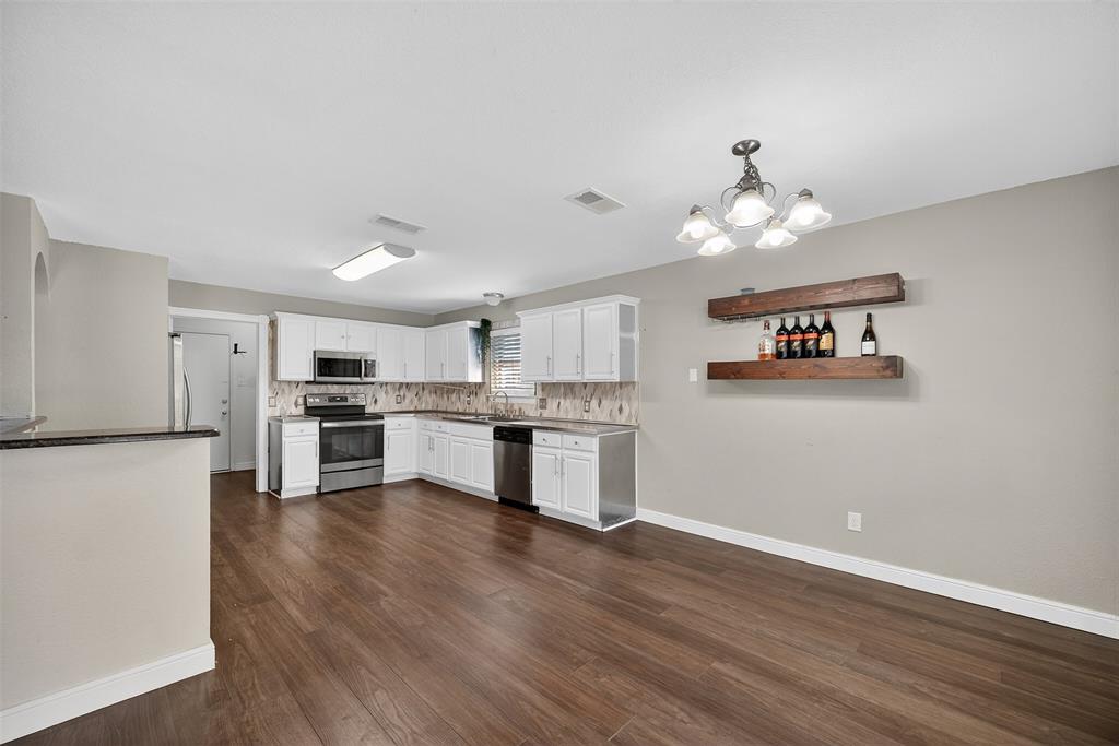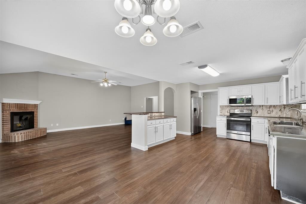This charming single-story brick home offers 3 bedrooms, 2 bathrooms, and an open, spacious floor plan perfect for both daily living and entertaining. The large living room features a cozy brick fireplace and flows seamlessly into the expansive kitchen, complete with sleek commercial-style stainless steel countertops, a unique integrated sink, abundant white cabinetry with brushed nickel hardware, and a stylish backsplash.