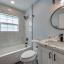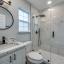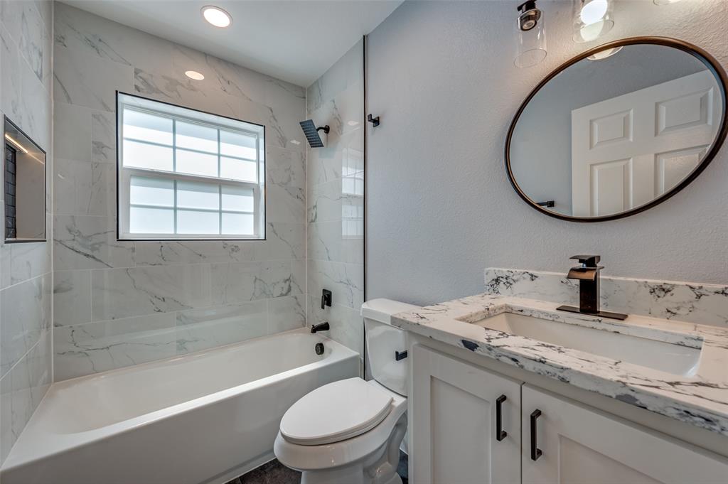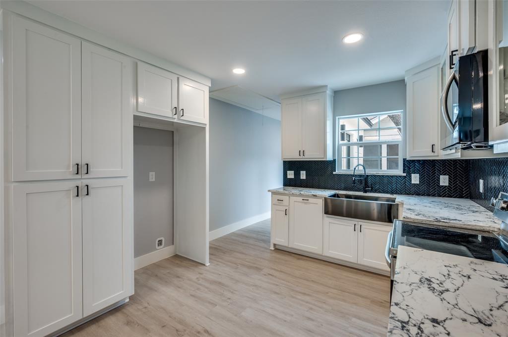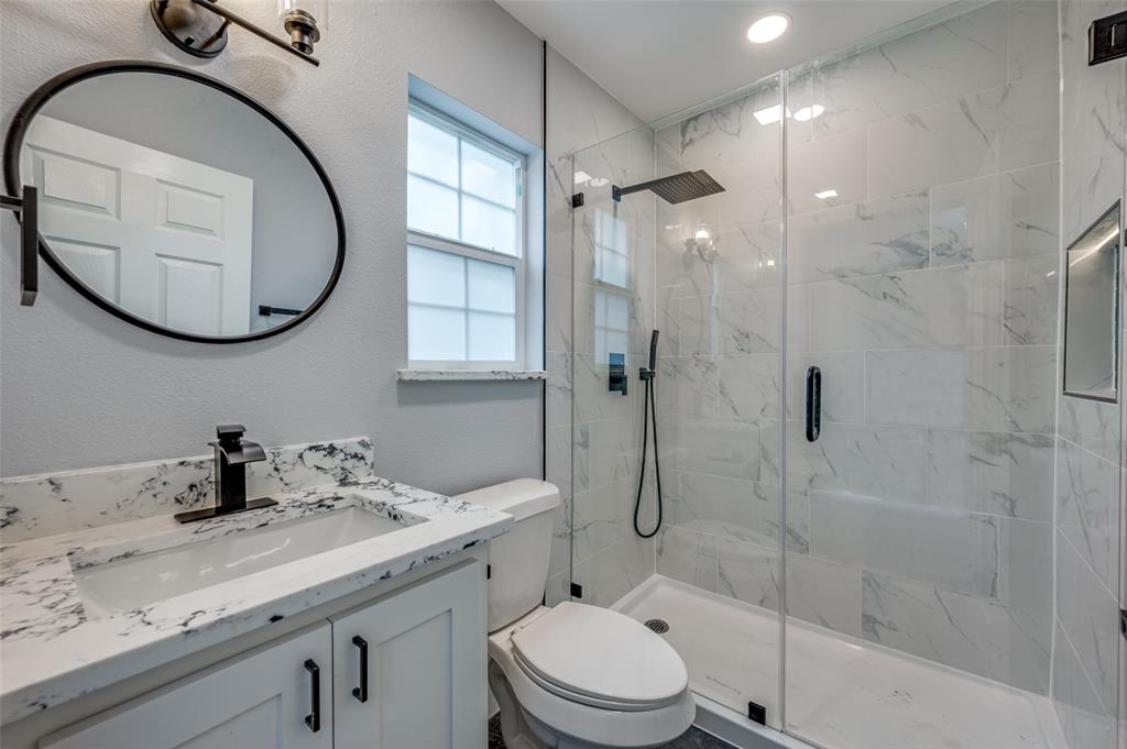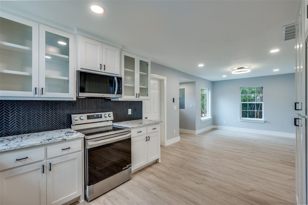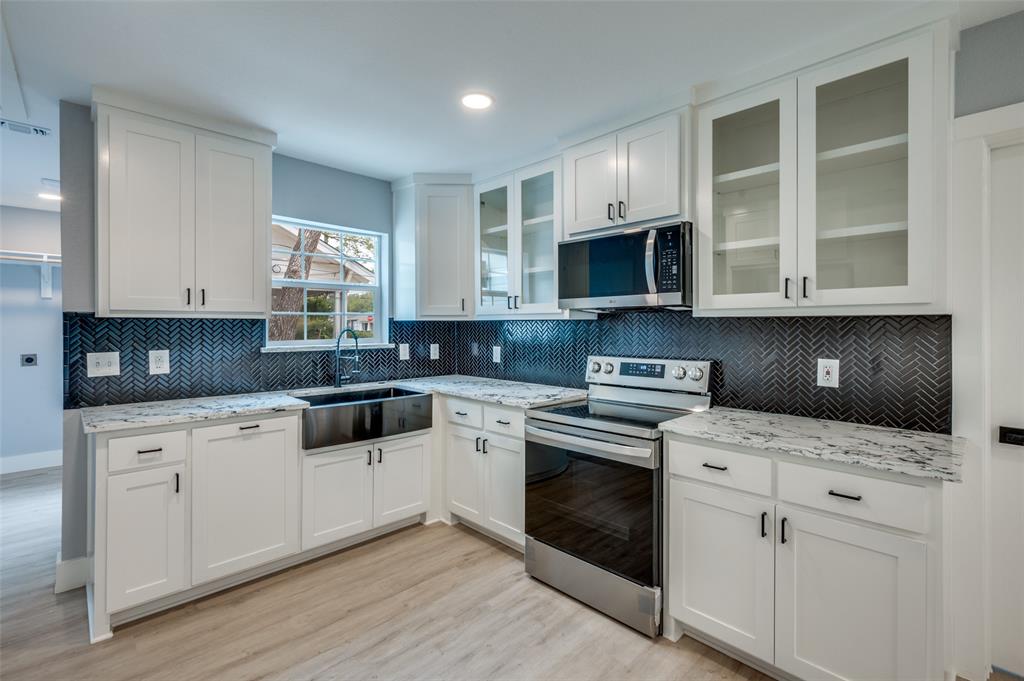 Inside, sunlight and clean lines frame an open layout that makes everyday living effortless and entertaining a joy. The chef’s kitchen features white shaker cabinetry with glass fronts, sleek herringbone backsplash, a stainless farm sink, and stone-look countertops. Fresh flooring, designer lighting, and energy-efficient new windows carry throughout. Spa-styled baths showcase marble-look tile, modern fixtures, and rainfall showers. Generous closets and a deep, treed backyard add the space everyone needs.