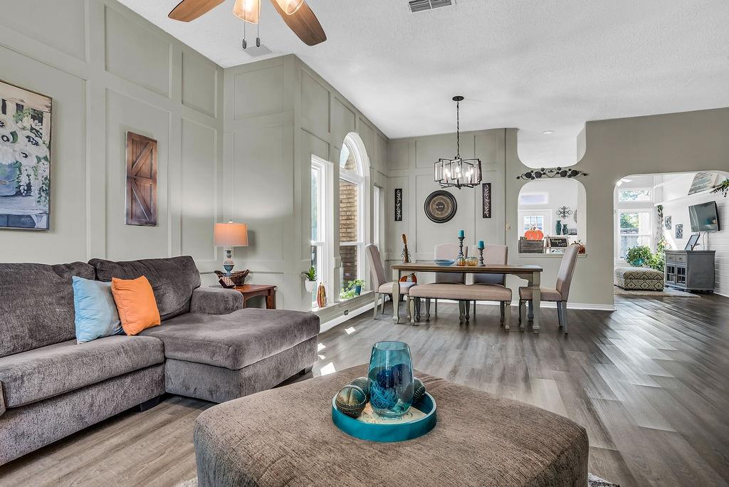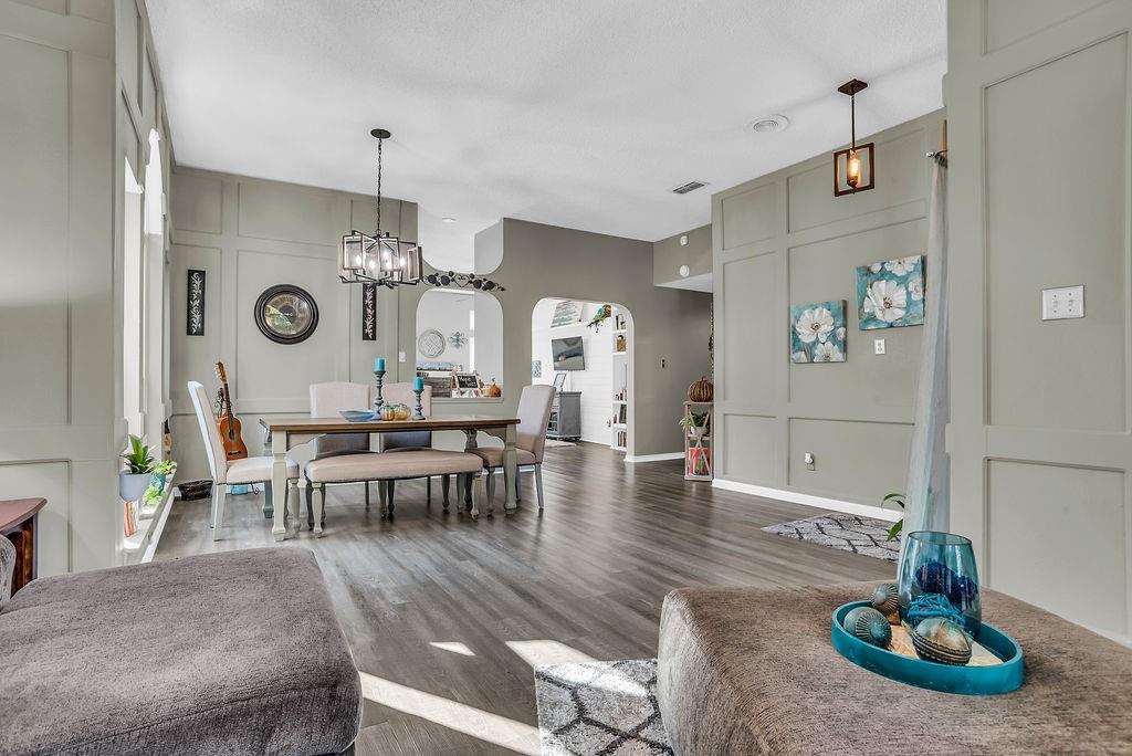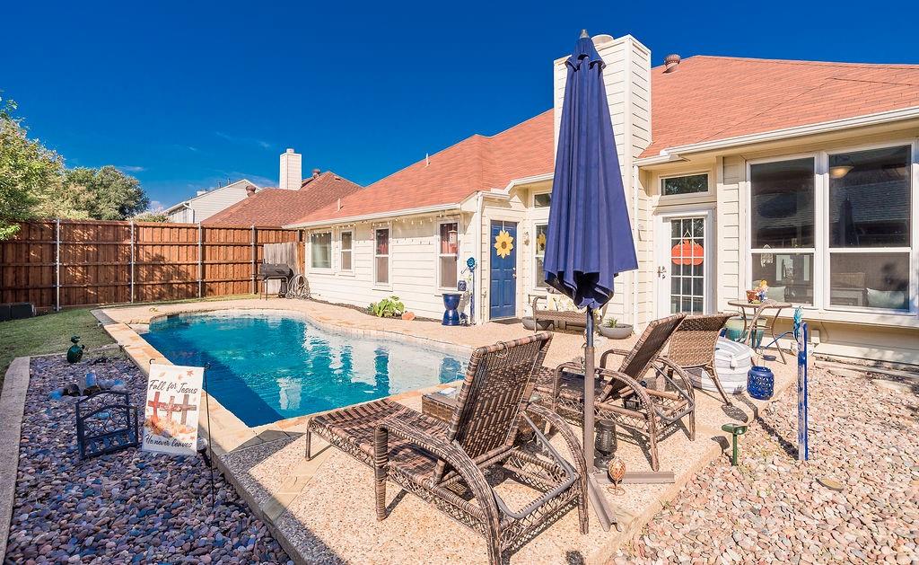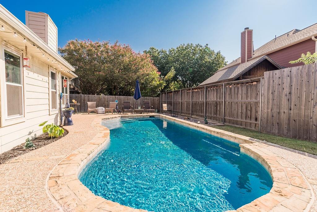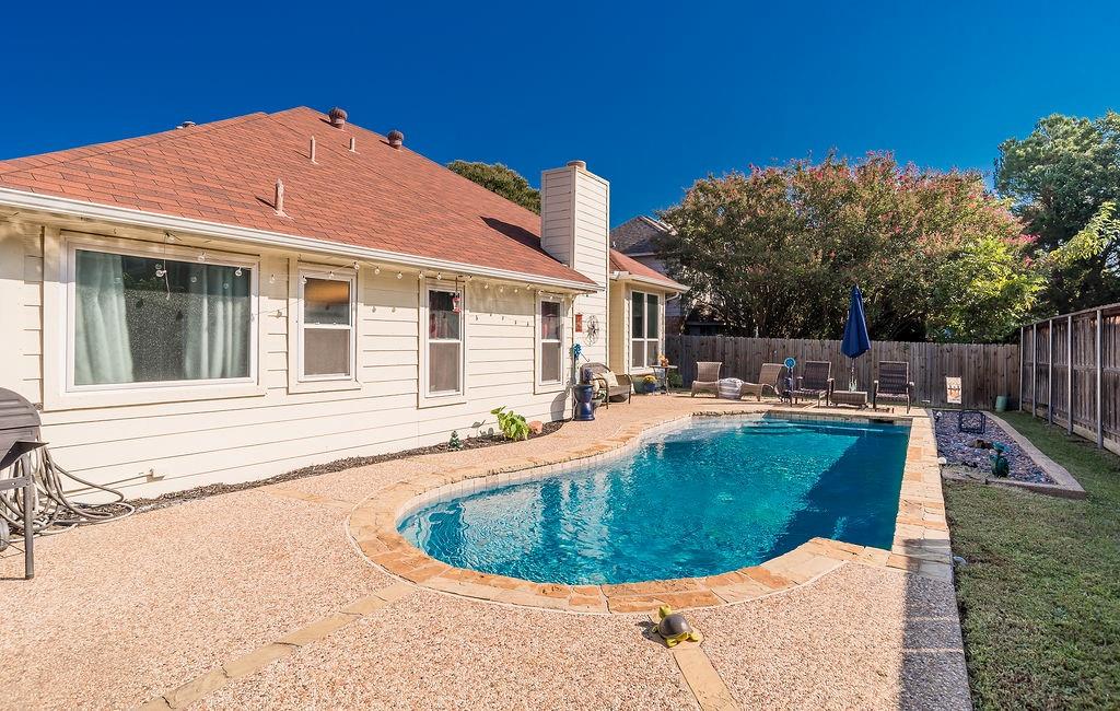 Welcome to this beautiful traditional single-story home, showcasing stunning landscaping, decorative lighting, and charming accent walls. Step inside to an inviting open floor plan filled with natural light, tall ceilings, and a cozy fireplace with a classic mantle. The primary suite offers a unique bonus room, perfect for a private office, nursery, or reading retreat. Outdoors, enjoy your own resort-style pool surrounded by a privacy fence, creating the ultimate space for relaxation and entertaining. Updates include windows, gutters, laminate vinyl plank flooring, a water heater, an outside AC unit, and a replastered pool, all of which were installed within the last 5 years. Conveniently located near the interstate, shopping, grocery stores, and a scenic lake, this home perfectly combines comfort, style, and accessibility.