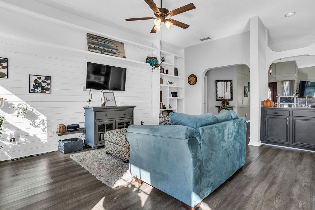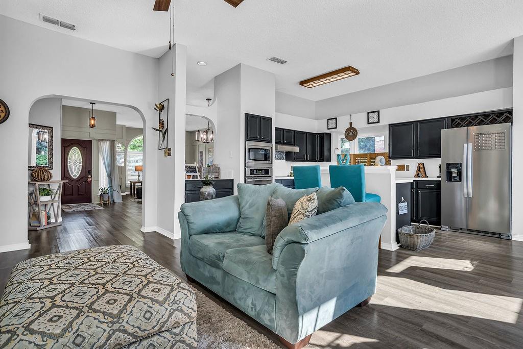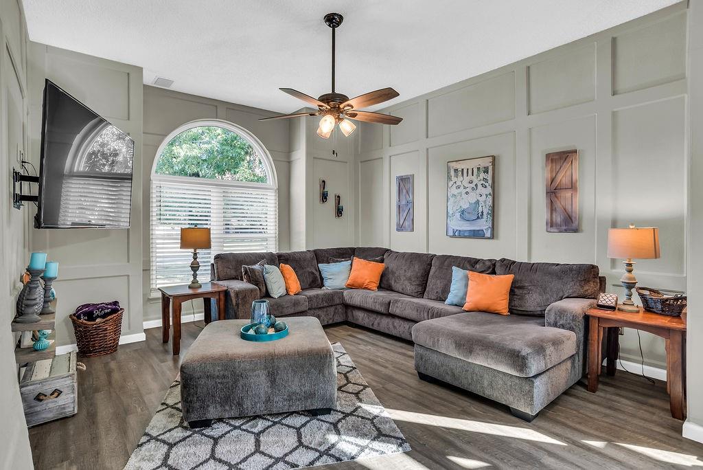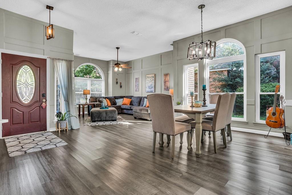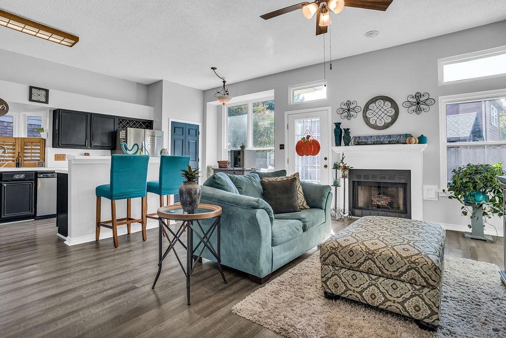 Welcome to this beautiful traditional single-story home, showcasing stunning landscaping, decorative lighting, and charming accent walls. Step inside to an inviting open floor plan filled with natural light, tall ceilings, and a cozy fireplace with a classic mantle. The primary suite offers a unique bonus room, perfect for a private office, nursery, or reading retreat. Outdoors, enjoy your own resort-style pool surrounded by a privacy fence, creating the ultimate space for relaxation and entertaining. Updates include windows, gutters, laminate vinyl plank flooring, a water heater, an outside AC unit, and a replastered pool, all of which were installed within the last 5 years. Conveniently located near the interstate, shopping, grocery stores, and a scenic lake, this home perfectly combines comfort, style, and accessibility.