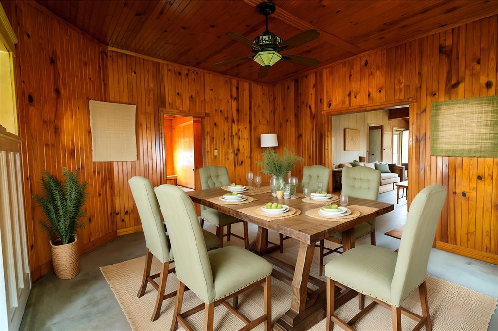 Step inside to discover a warm and inviting interior, featuring rich wood accents and an abundance of natural light throughout. The thoughtful layout offers both privacy and functionality, with distinct living areas and a spacious eat-in kitchen and dining room—great for entertaining. The kitchen is equipped with newer appliances and generous counter space, ideal for any home chef.