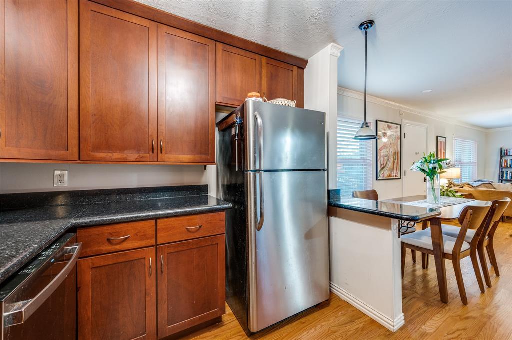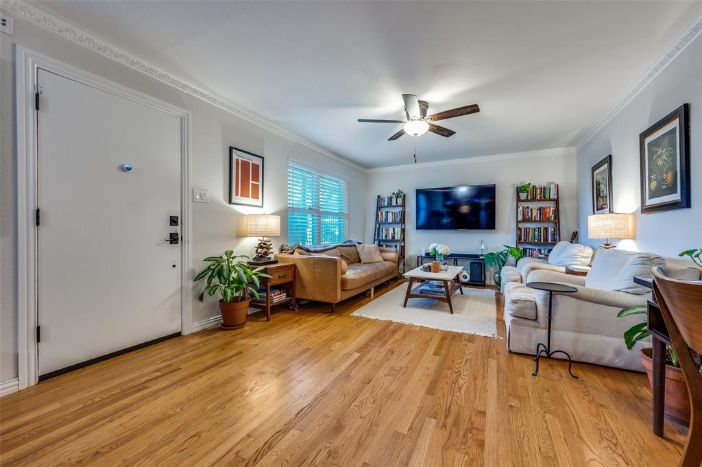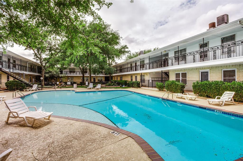 Quaint corner unit with pool view. This two bed, two bath condo boasts hardwood flooring and two full bathrooms that were refreshed in 2022. Pet friendly community with walkability to SMU, Central Market, 24 Hour Fitness, Milo's and Parkit Market! Built-in wine fridge in the kitchen offers a sleek upgrade to the updated kitchen. Refrigerator (new ice maker 2025), washer and dryer (purchased 2023) convey with the sale of the property. Seller is offering a credit for new carpet in the bedrooms. New Trane AC in 2022. Pool and pool deck were resurfaced in 2024 and exterior masonry redone in 2025 with no additional assessment.