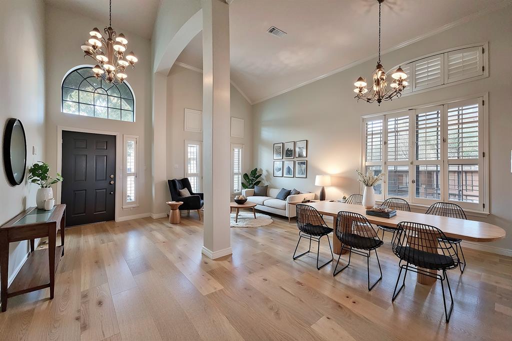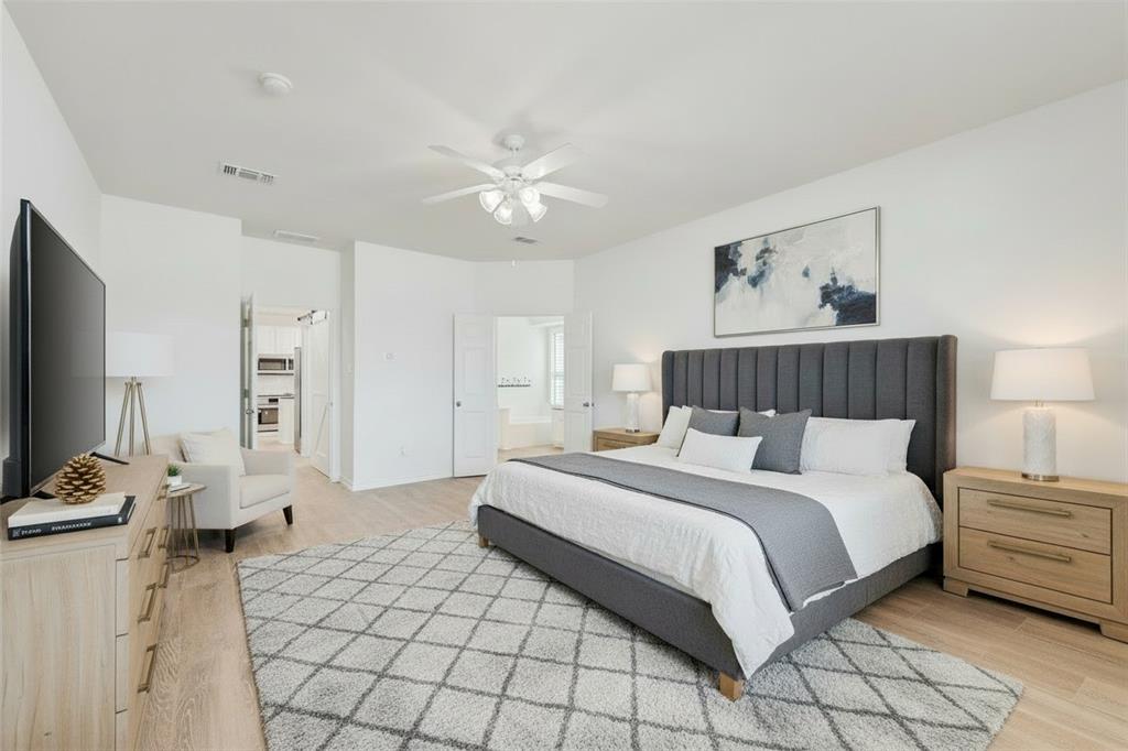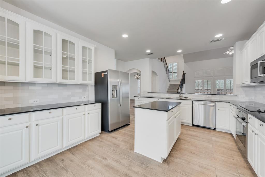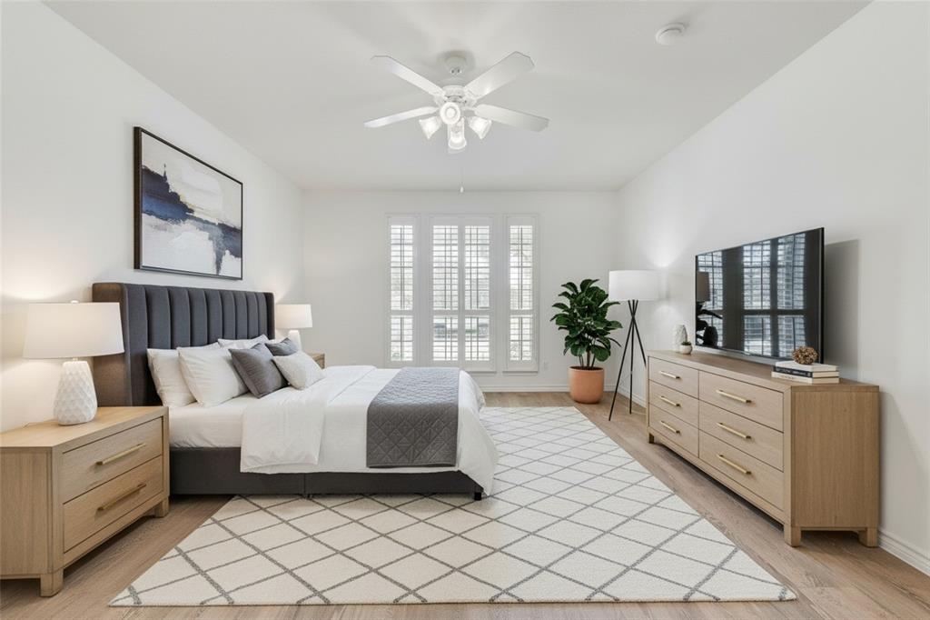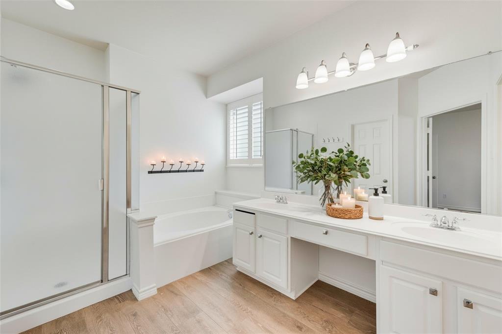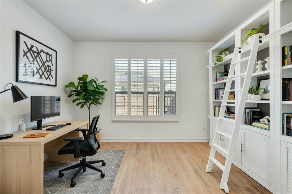 Welcome to this beautiful, centrally located Plano home feeding to Frisco ISD. Enjoy this interior corner lot with tree lined greenbelt to the west. Impressive entry welcomes you into this spacious home where the generously proportioned living areas combine comfort and style with a freshly painted interior and gorgeous plank flooring throughout first floor. Large first floor master with large walk in closet gives you privacy from rest of the home. Open concept kitchen and family room provides ample space for both relaxation and entertaining, with fantastic office nook and custom shelving tucked away at the back of the home. The newly updated kitchen becomes the heart of the home and looks to a wall of windows with plantation shutters flanking family room, allowing tons of natural light to flood the home. Staircase leads upstairs to three additional bedrooms and two full bathrooms with large game room. Step outside to discover a tranquil outdoor space, perfect for enjoying peaceful moments or hosting gatherings. Come and see 4621 Bending Oak Trail for yourself, and imagine making this delightful house your new home!