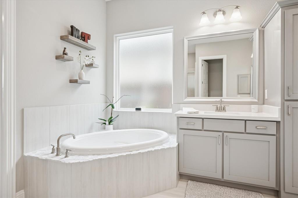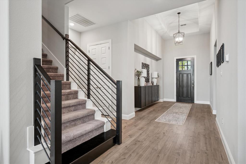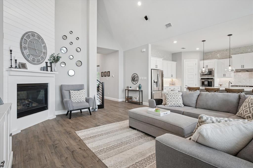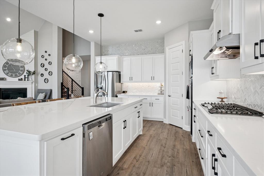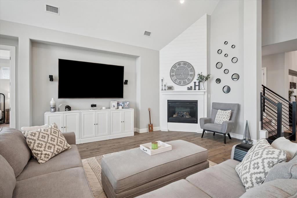 Inside, every detail has been thoughtfully planned. Upgraded flooring flows through the downstairs living, dining, kitchen, and halls. The kitchen impresses with upgraded cabinetry, quartz marble countertops, designer lighting, and hardware. The living room centers around a beautifully upgraded fireplace, while the stair railing and primary suite bathroom—complete with an enhanced tub and shower—showcase quality craftsmanship and style.