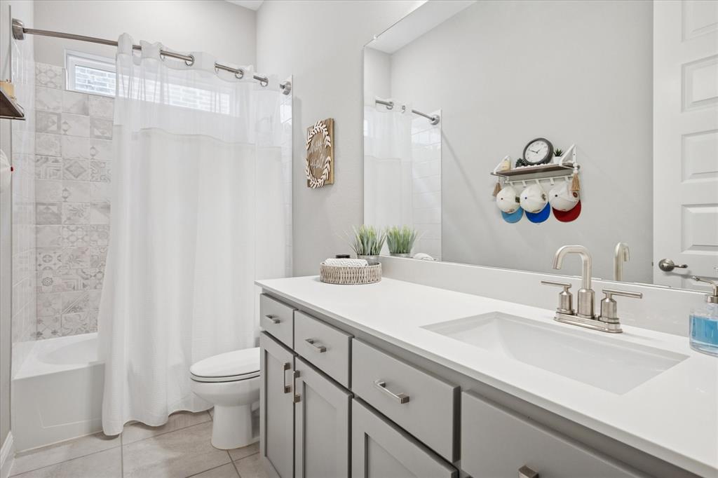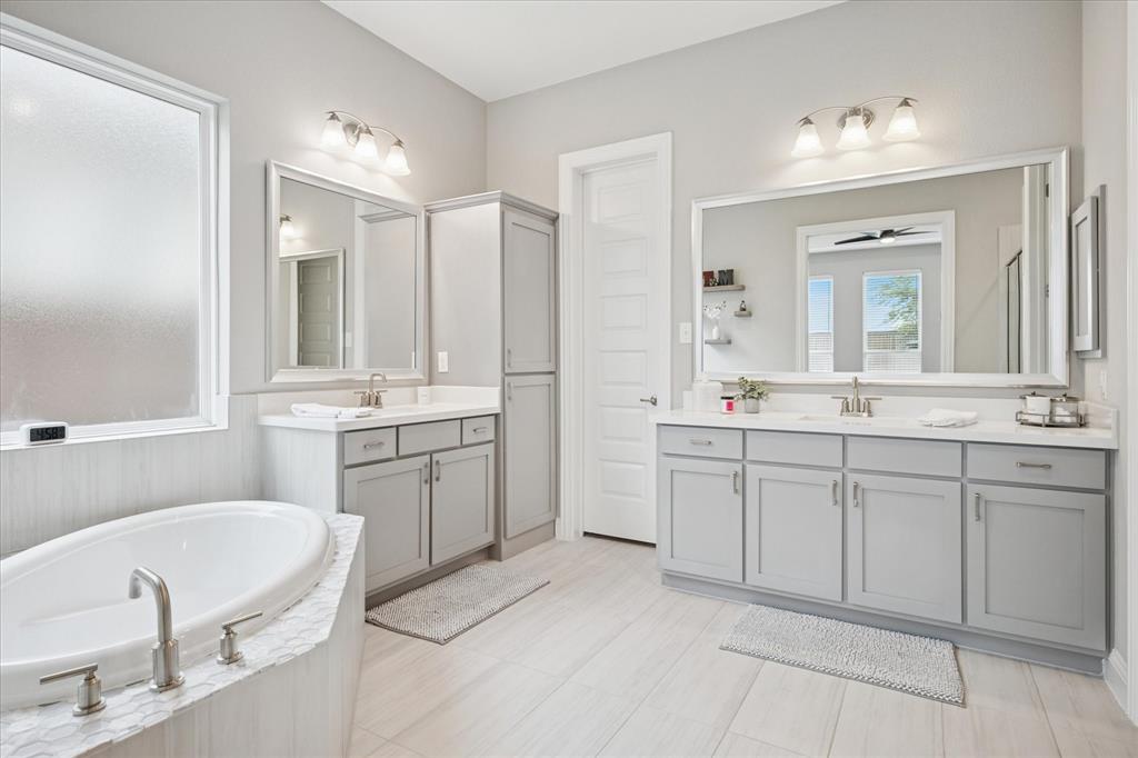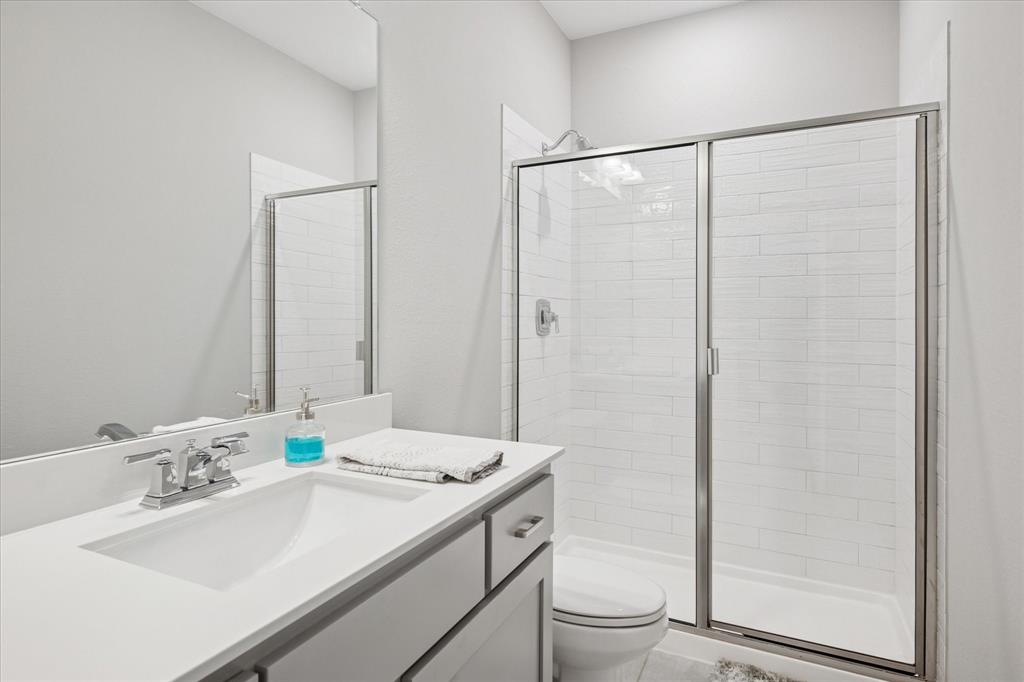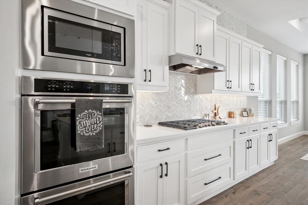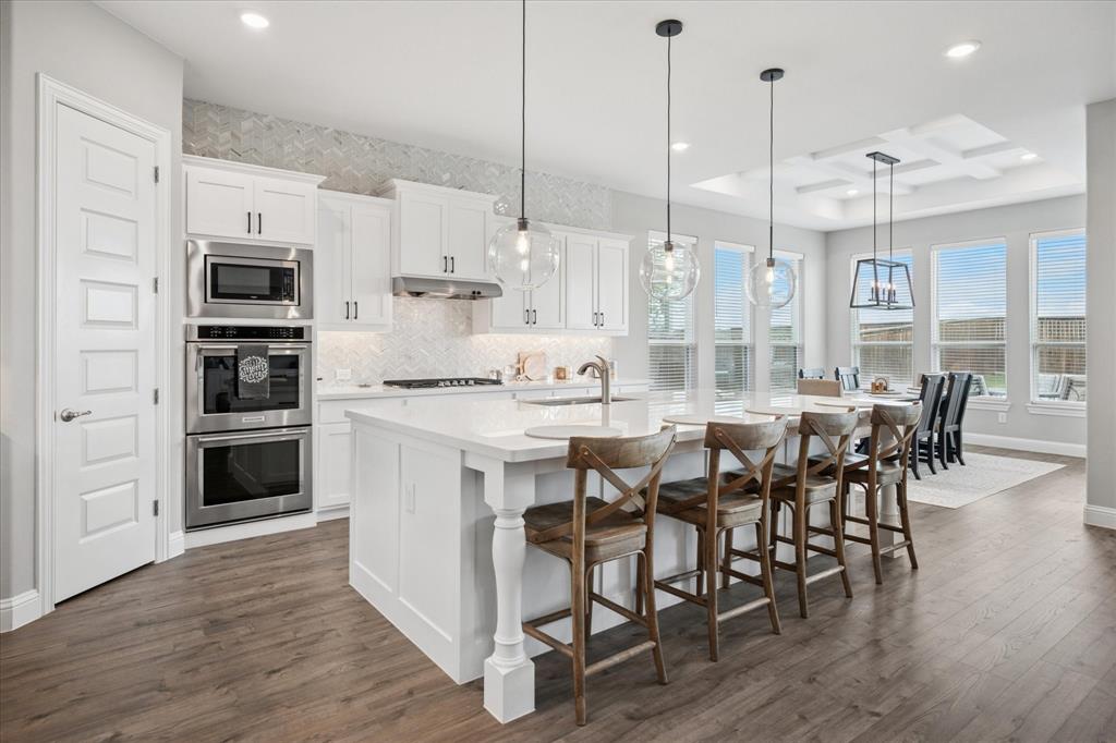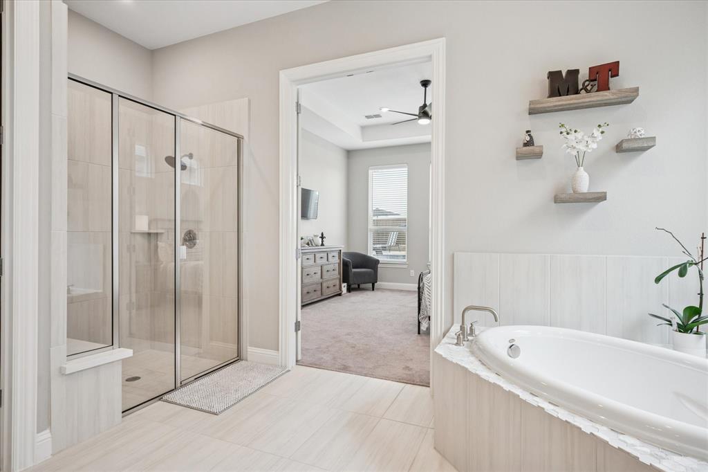 Inside, every detail has been thoughtfully planned. Upgraded flooring flows through the downstairs living, dining, kitchen, and halls. The kitchen impresses with upgraded cabinetry, quartz marble countertops, designer lighting, and hardware. The living room centers around a beautifully upgraded fireplace, while the stair railing and primary suite bathroom—complete with an enhanced tub and shower—showcase quality craftsmanship and style.