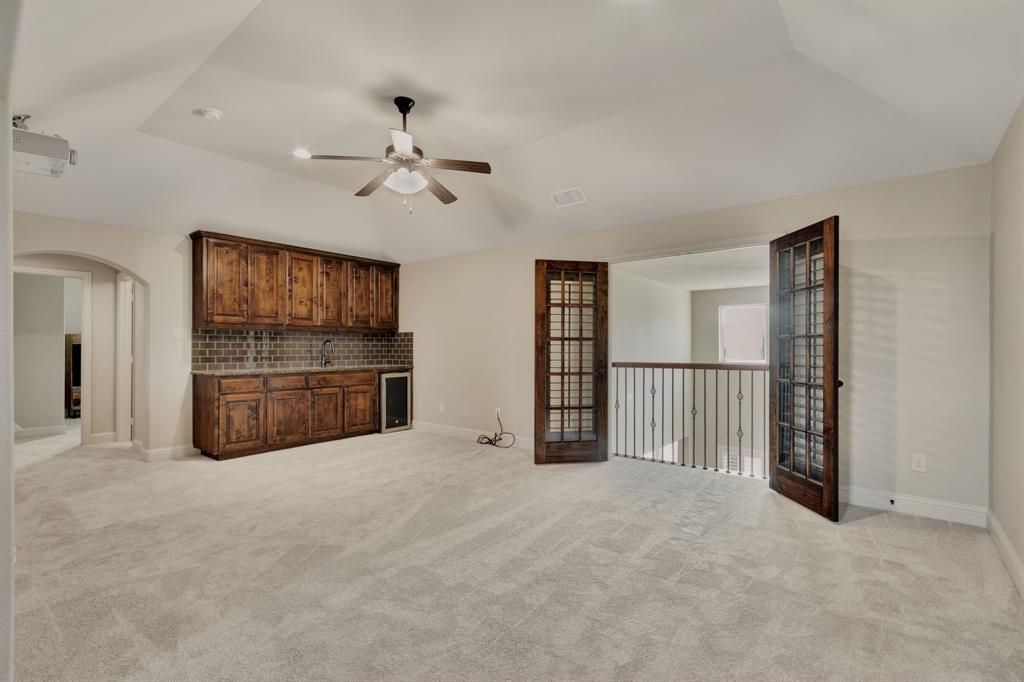 Upstairs, you'll find three generously sized secondary bedrooms, two full bathrooms, and a large game room with built-in cabinets, a wet bar, mini fridge, and projector, all of which convey with the home.