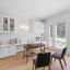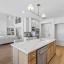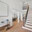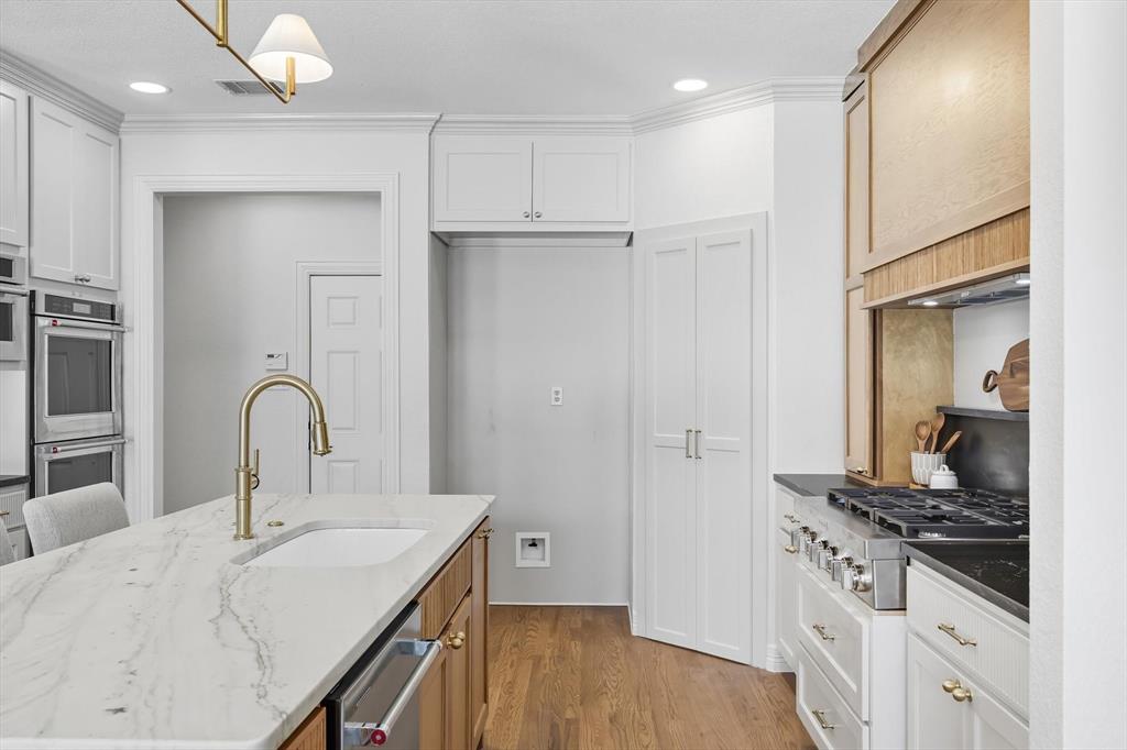 Inside, oak hardwood floors and tailored wood accents set a refined foundation. The kitchen pairs custom oak cabinetry and brass hardware with quartzite countertops and professional-grade KitchenAid appliances, including a 36” gas range. An oak staircase with iron balusters, paneling, and detailed moldings extend the home’s sense of traditional craftsmanship.
