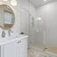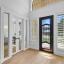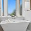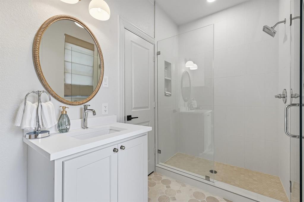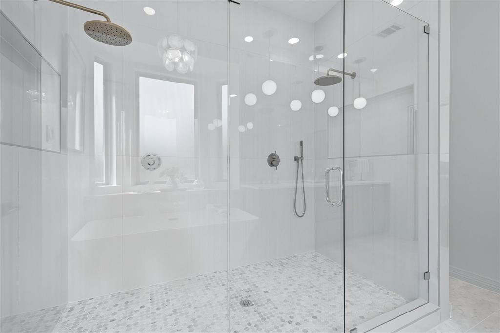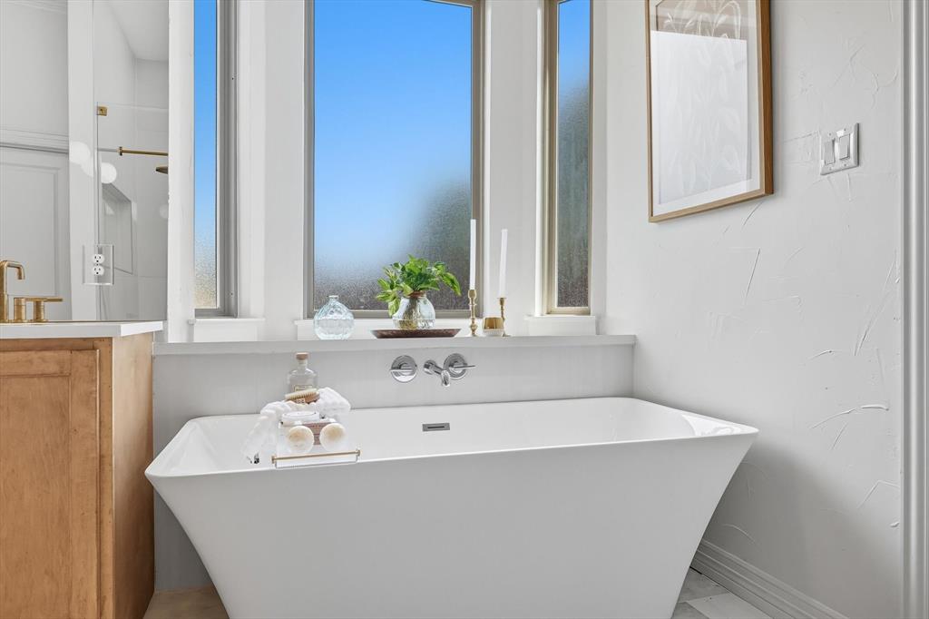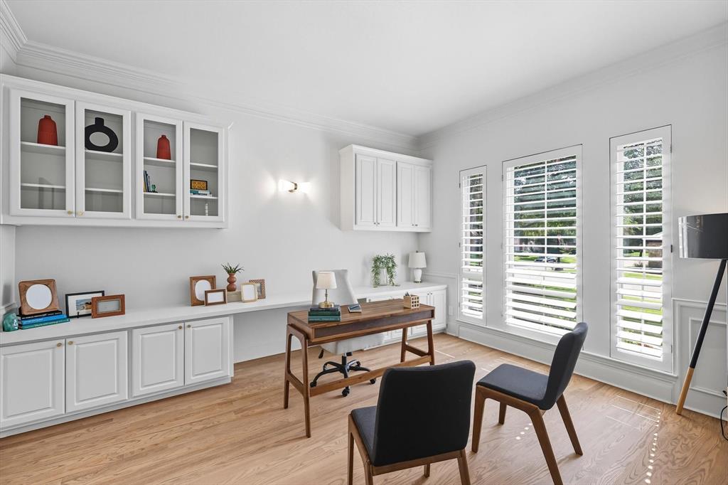 The main-level primary suite is a retreat with spa-inspired amenities—a two-person walk-in shower, freestanding soaking tub, and custom maple vanity—alongside redesigned closets with built-in shelving. Secondary bathrooms are appointed with marble and limestone finishes, custom vanities, and updated fixtures. An office with custom cabinetry provides a sophisticated workspace.