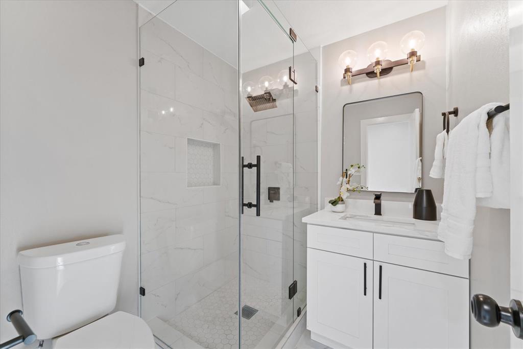 The kitchen has sleek quartz countertops, white cabinetry, and stainless steel appliances. Both bathrooms have been completely remodeled with stylish finishes, glass showers, and custom tile work.