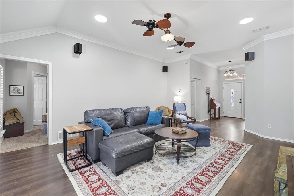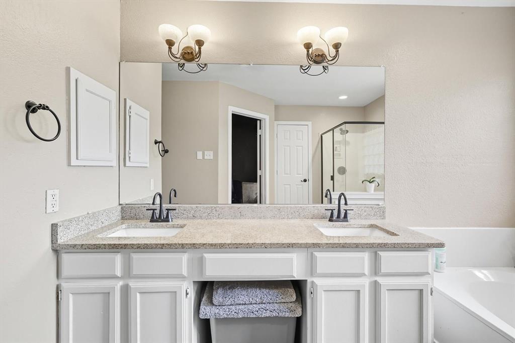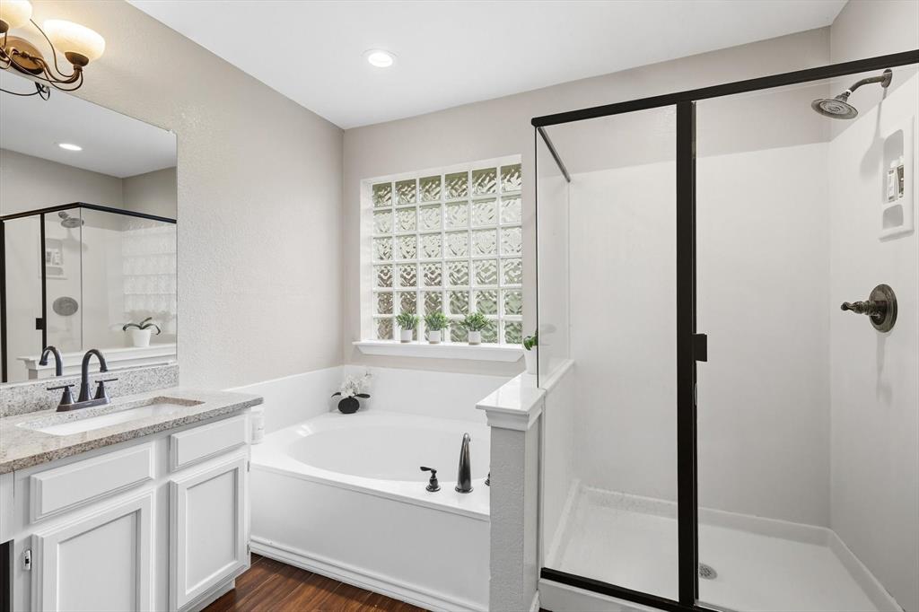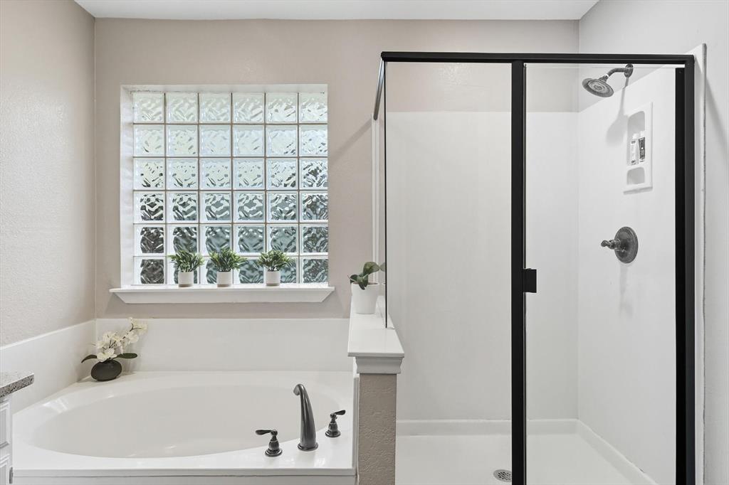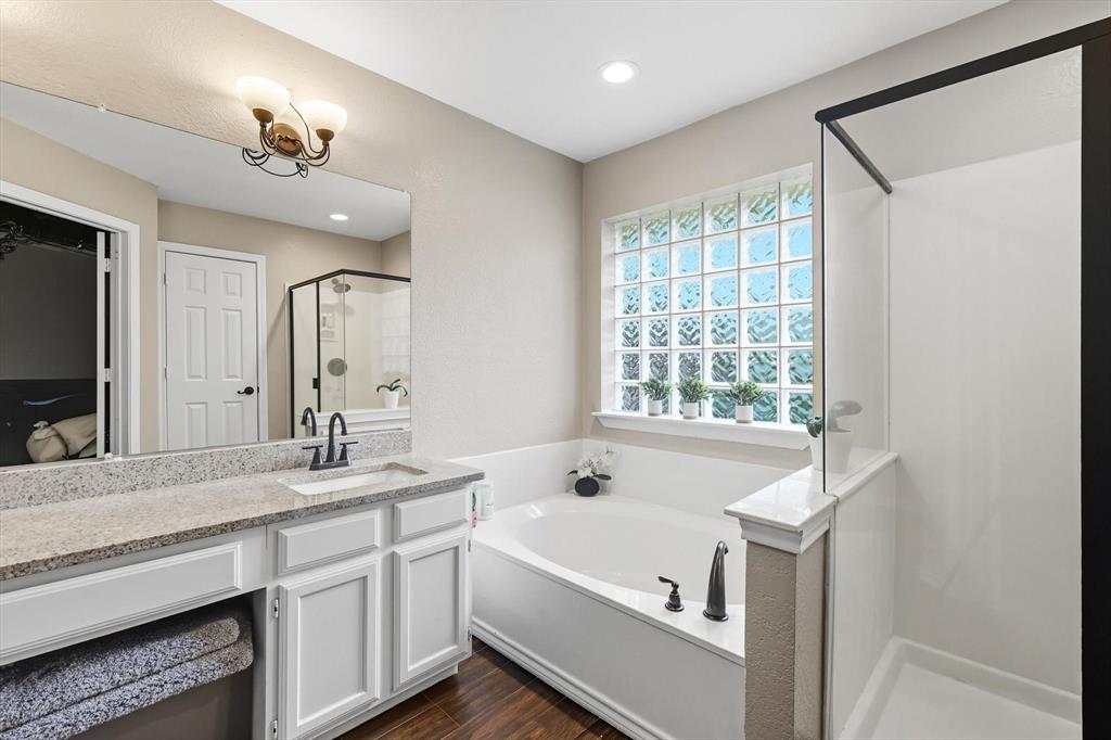 eat-in kitchen, featuring granite counter tops, stainless steel range, microwave and dishwasher that flows into the separate dining room. The common areas have ceramic tile or luxury vinyl plank flooring. Primary bathroom with garden tub, glass shower, and walk-in closet