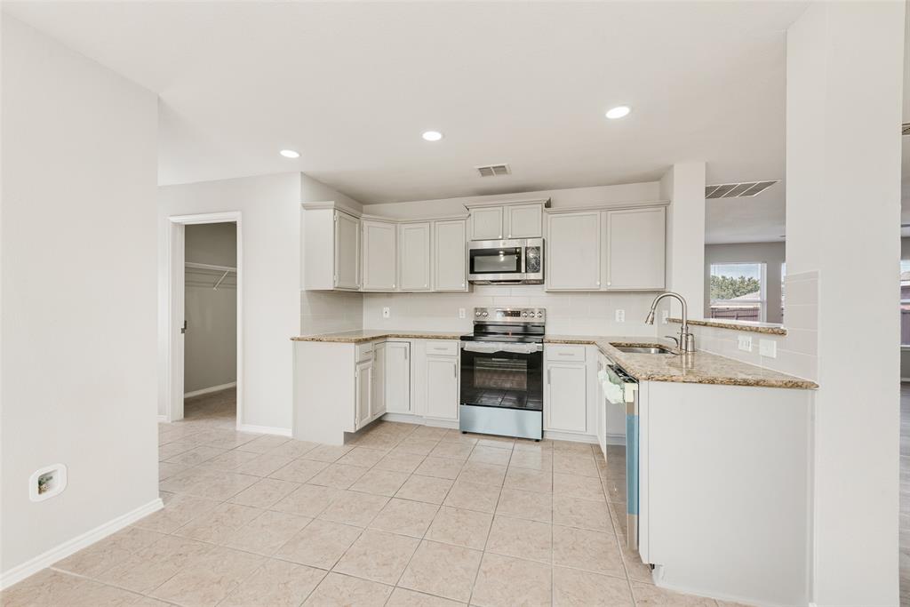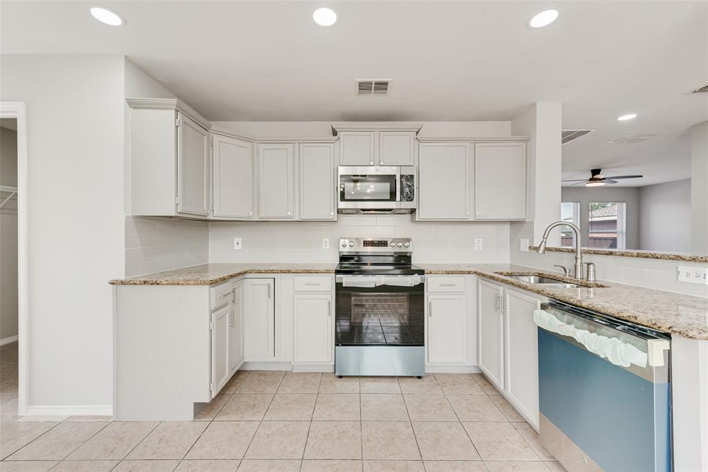 Upgrades throughout include interior and exterior paint, new bathroom vanities, premium stone countertops in the kitchen and baths, new flooring, stainless steel appliances, ceiling fans, updated lighting and plumbing fixtures, garage door openers, and a complete HVAC system with a transferable ten-year manufacturer’s warranty.