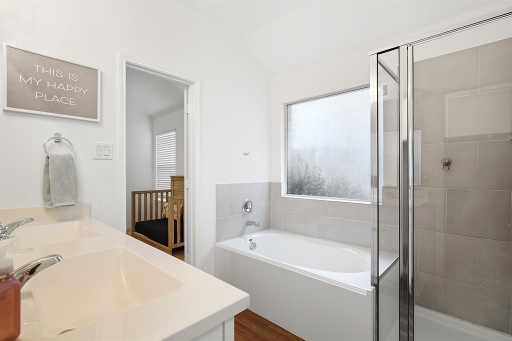 The private primary suite features dual vanities, a walk-in closet, and a spa-like ensuite bath with a separate shower and garden tub. Three additional bedrooms offer flexibility for guests, a home office, or a playroom.